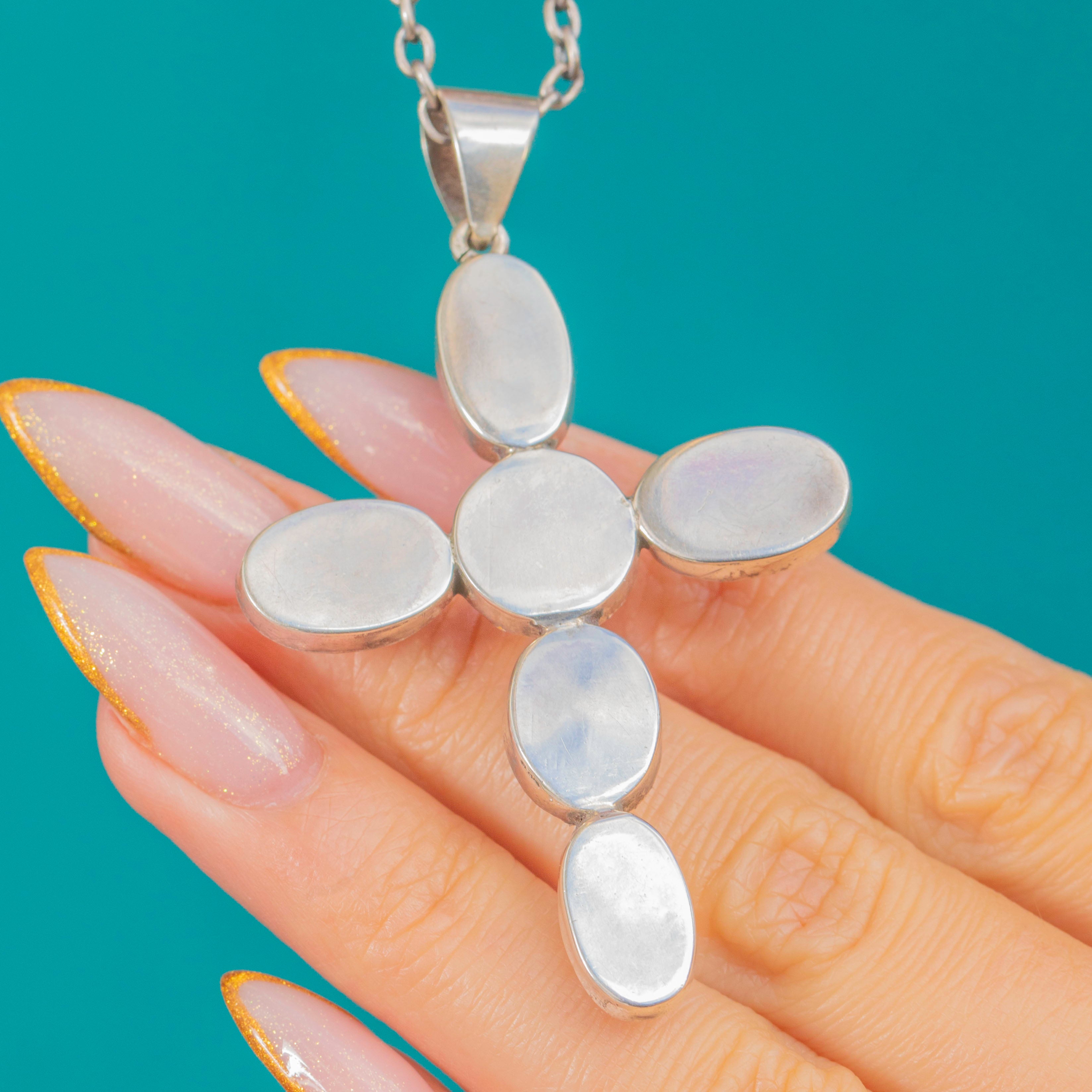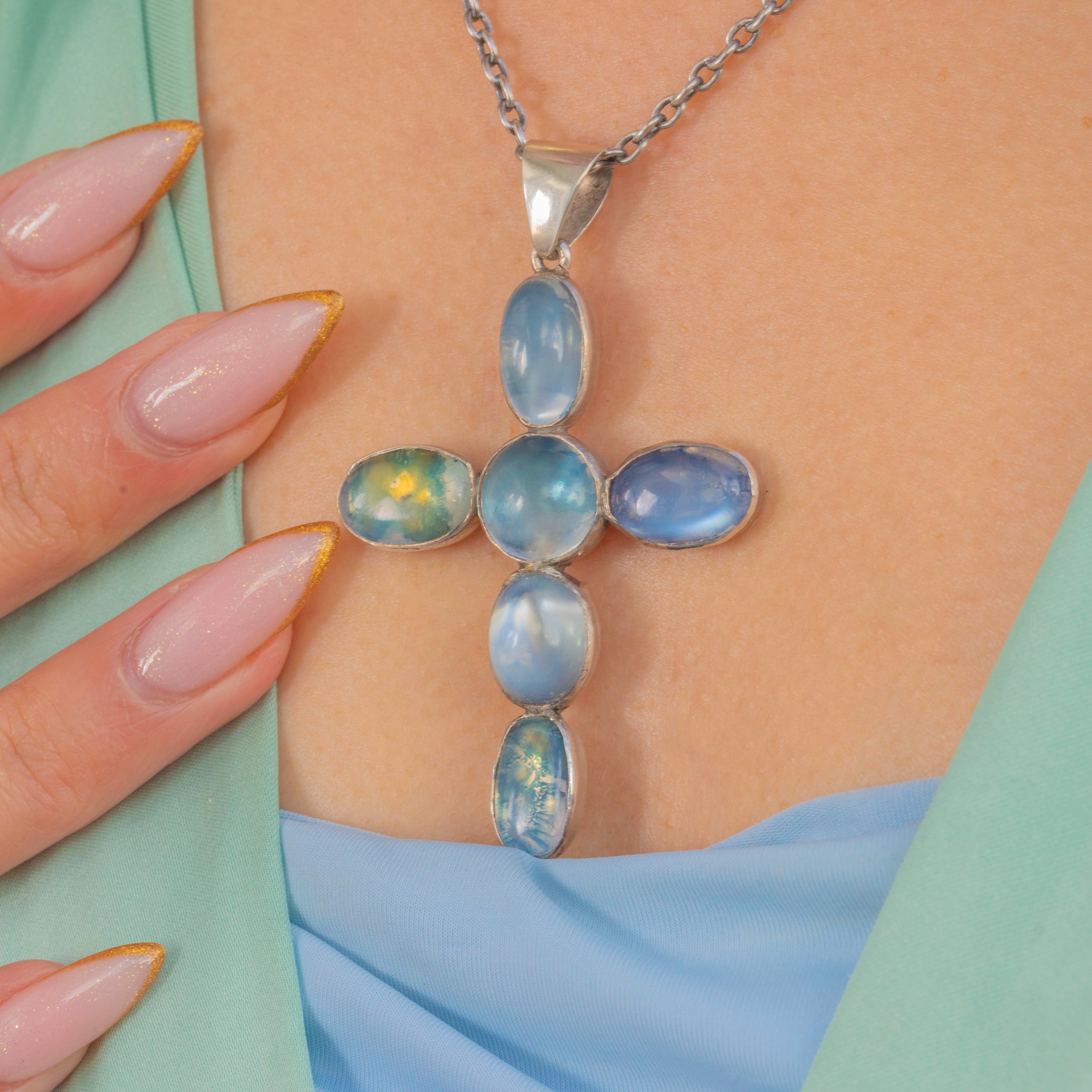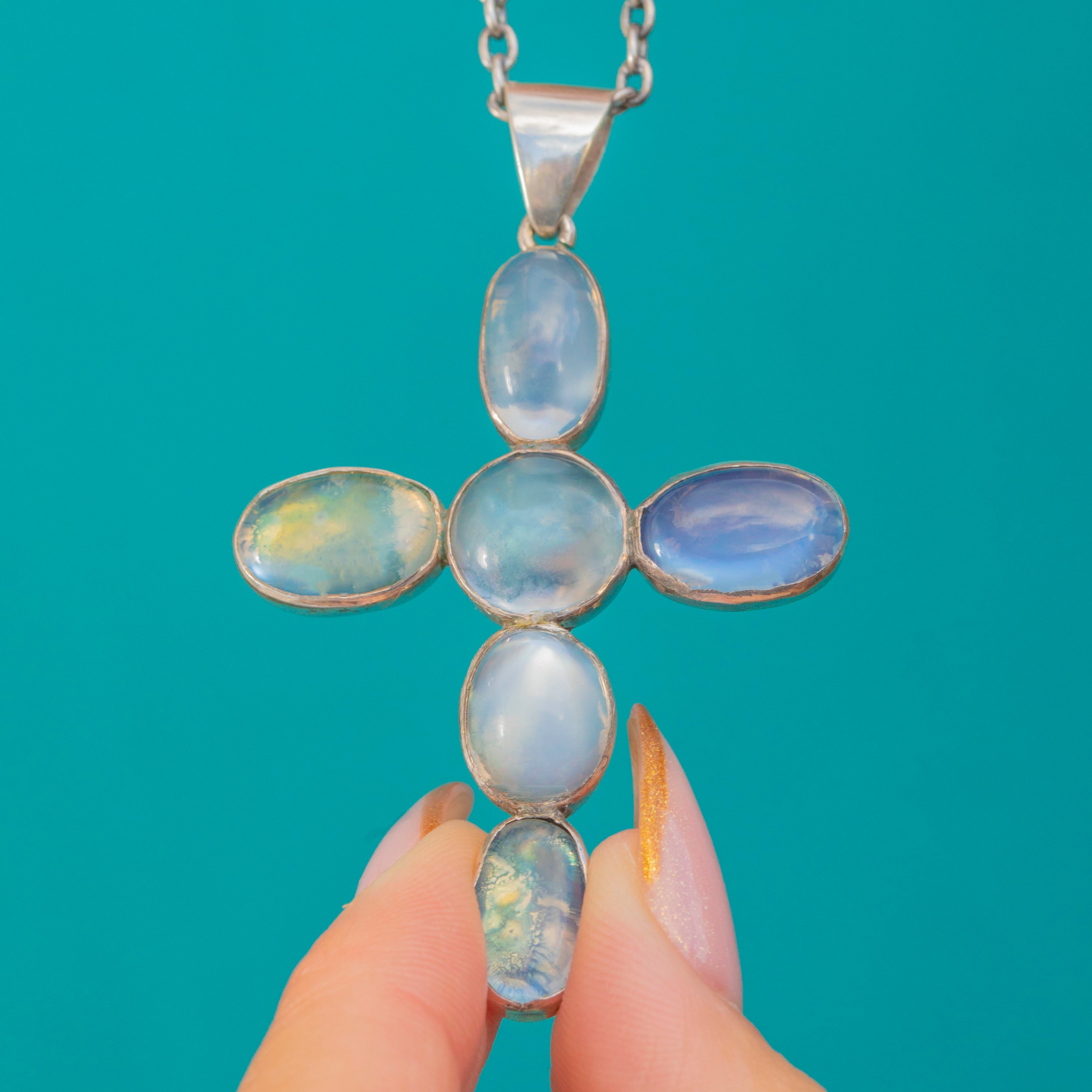 Pendentif Croix Antique en Argent avec Pierre de Lune et Chaîne de 30"