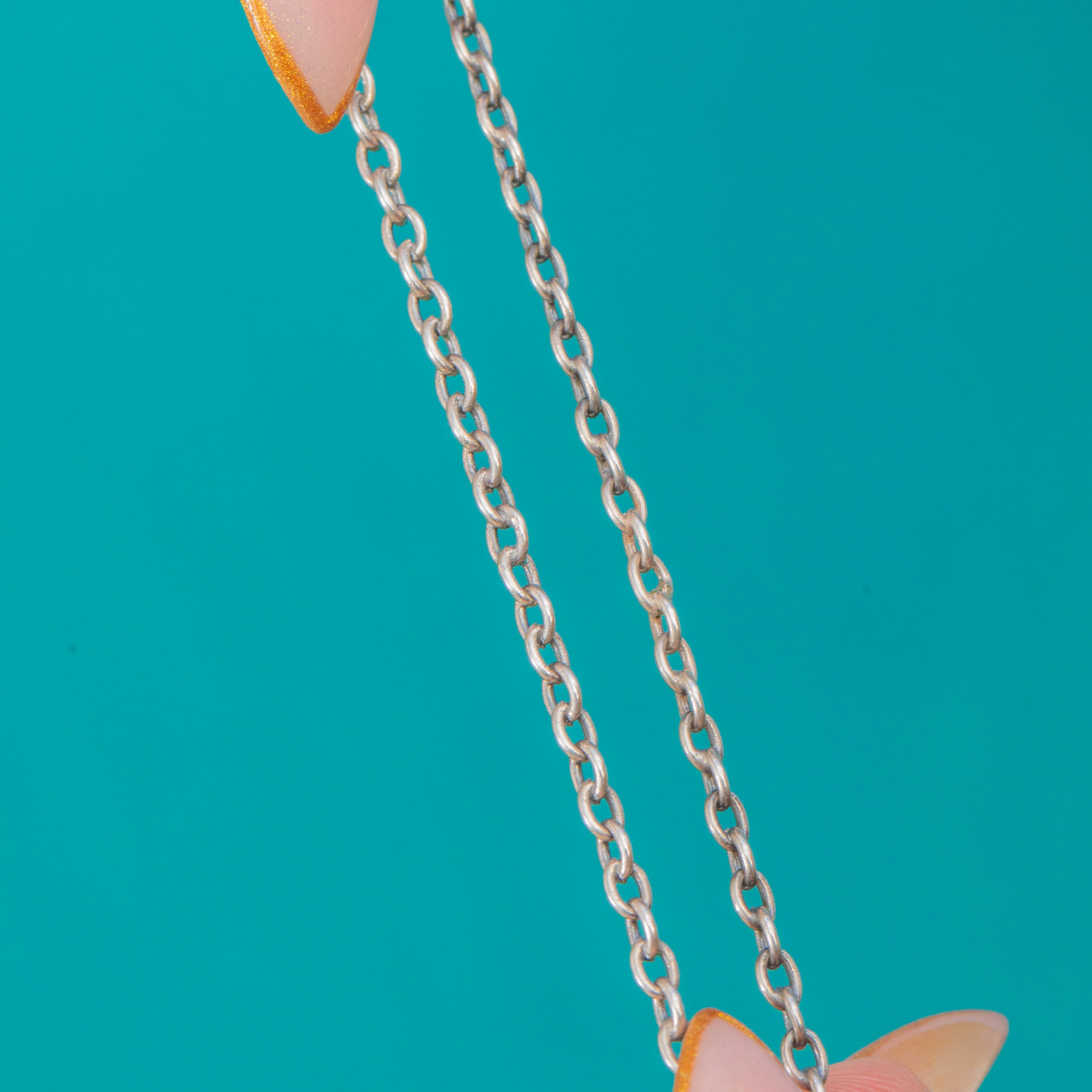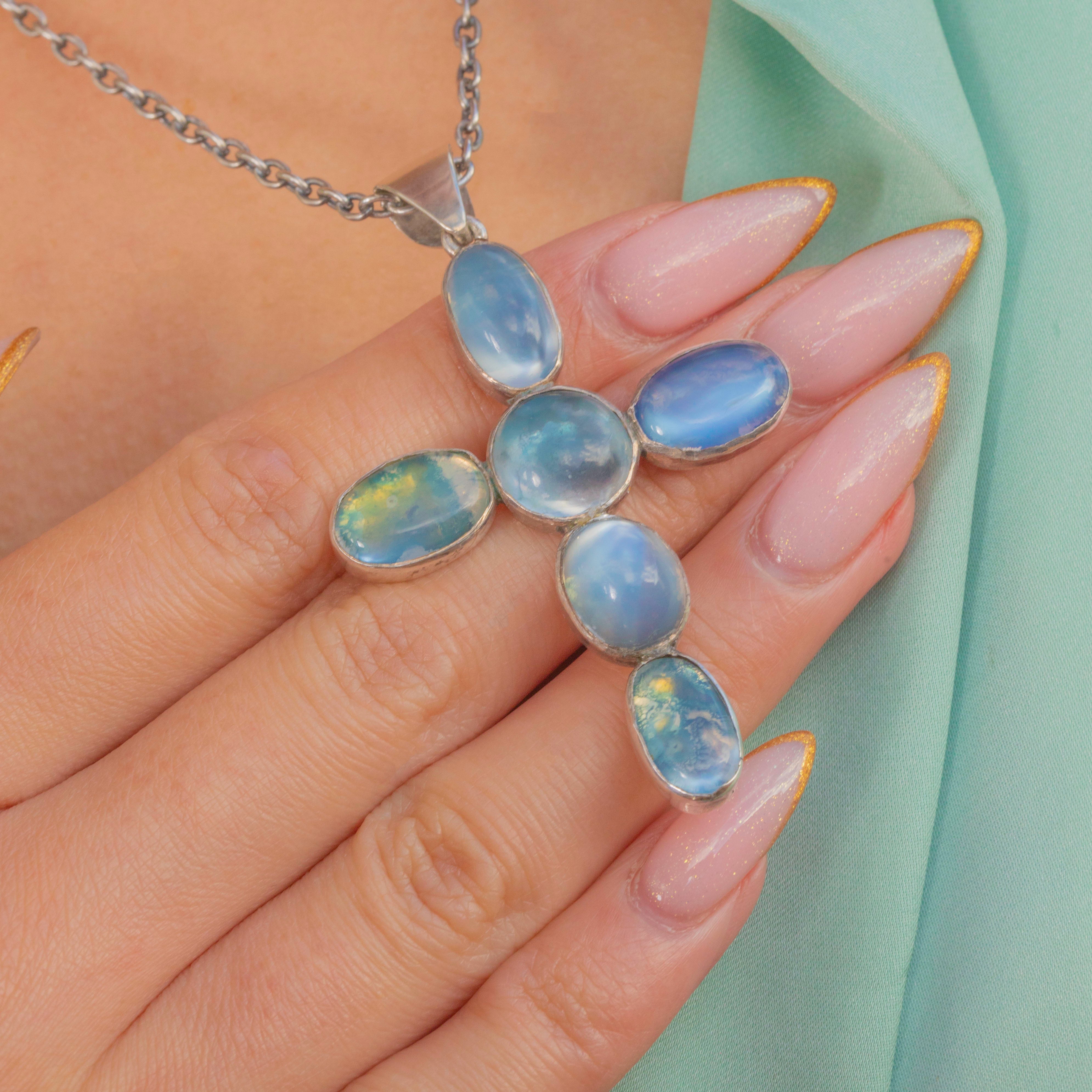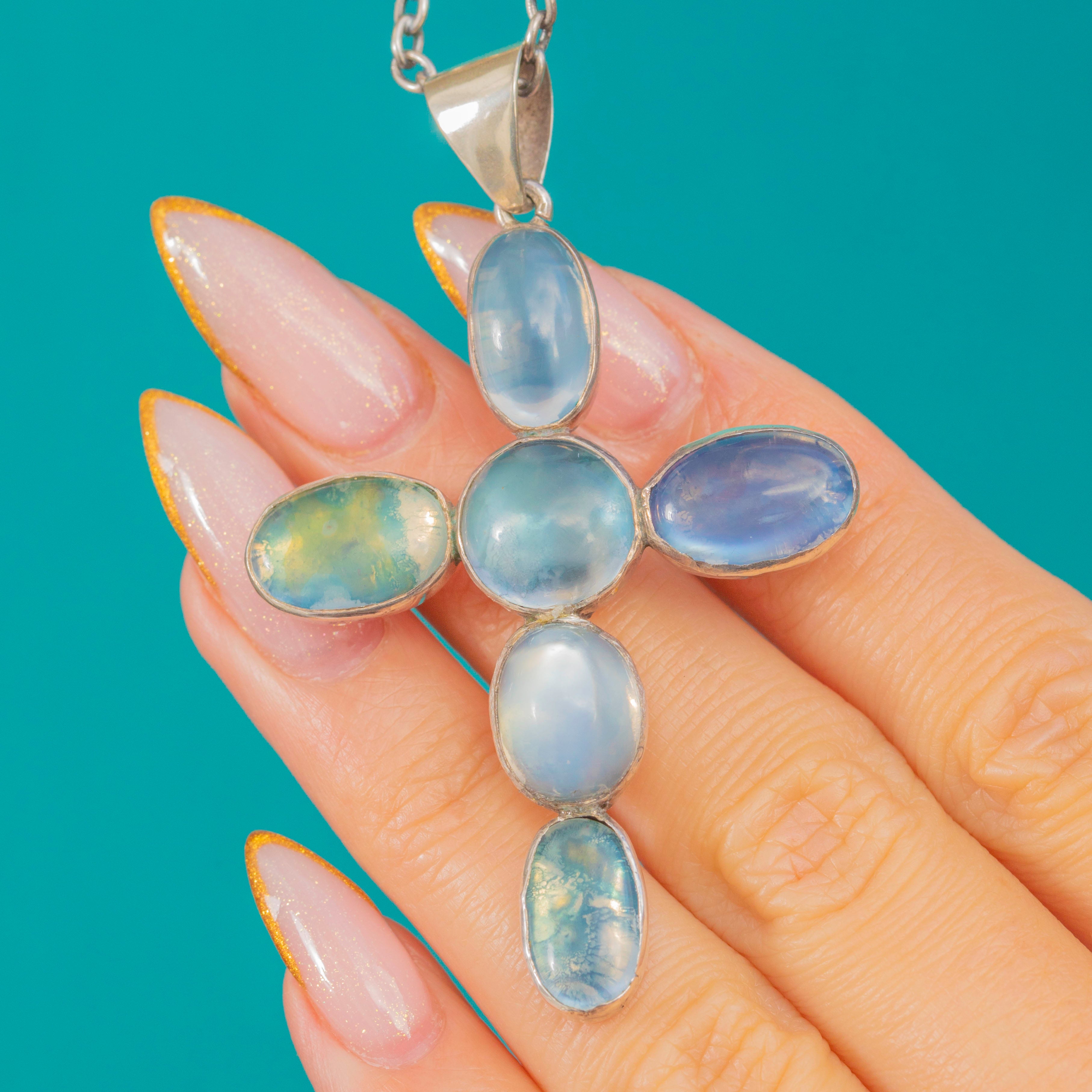 Pendentif Croix Antique en Argent avec Pierre de Lune et Chaîne de 30"