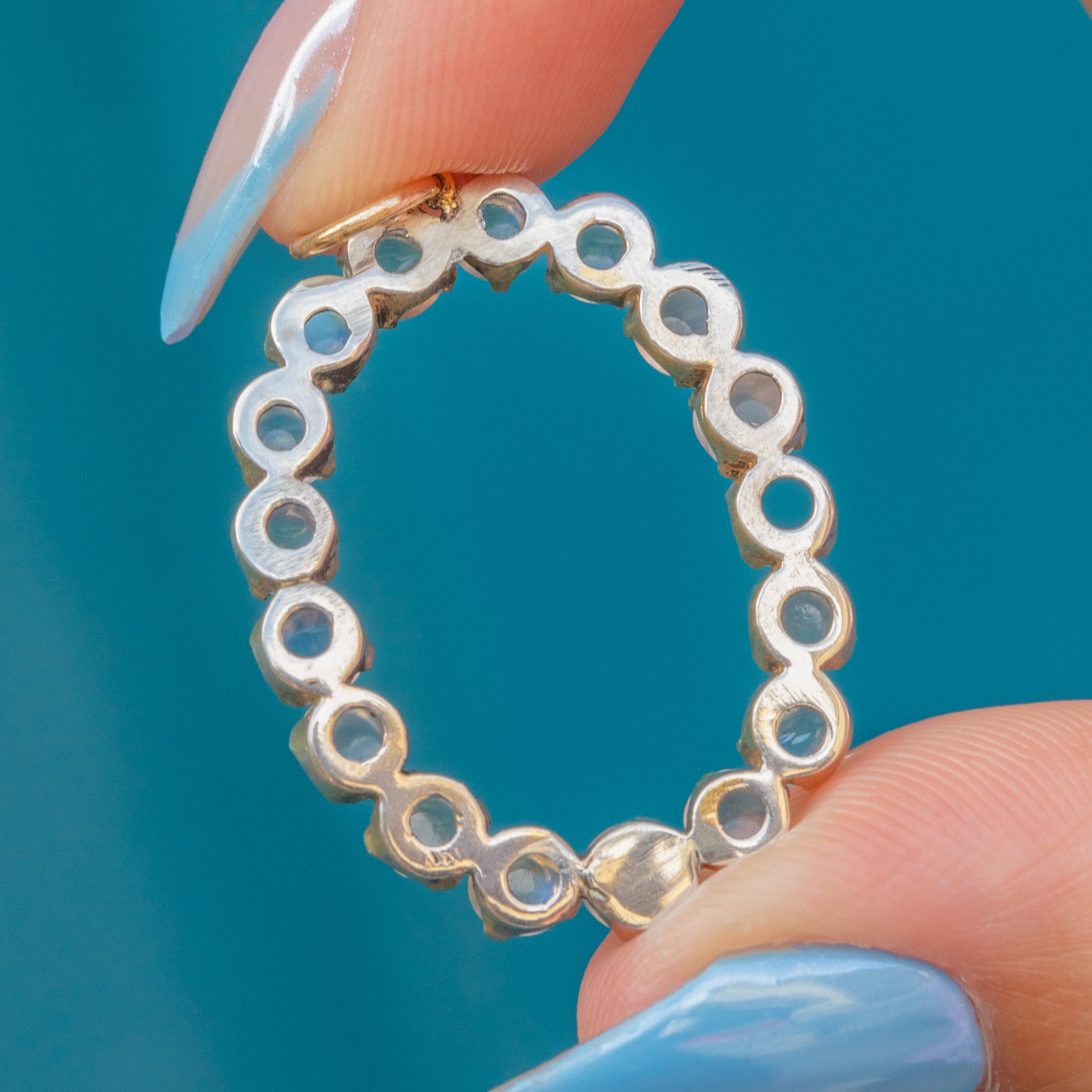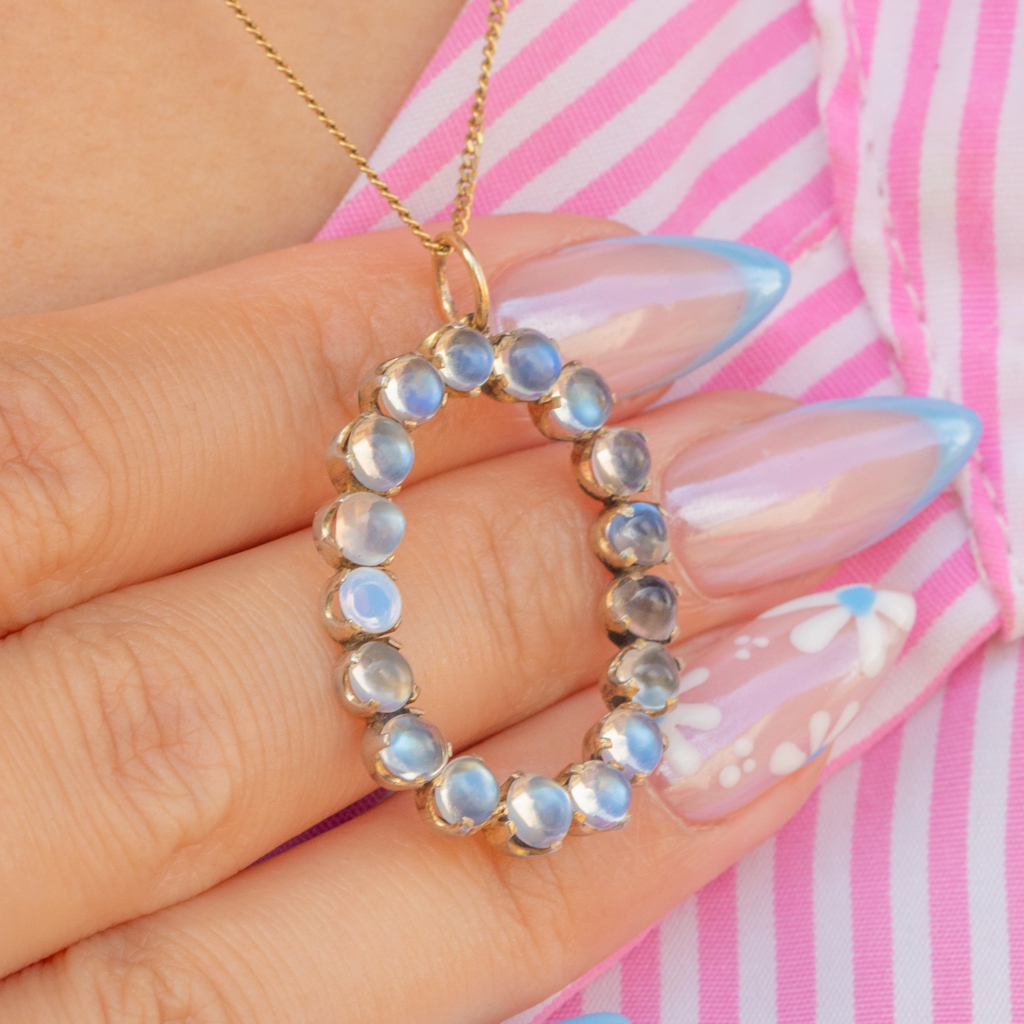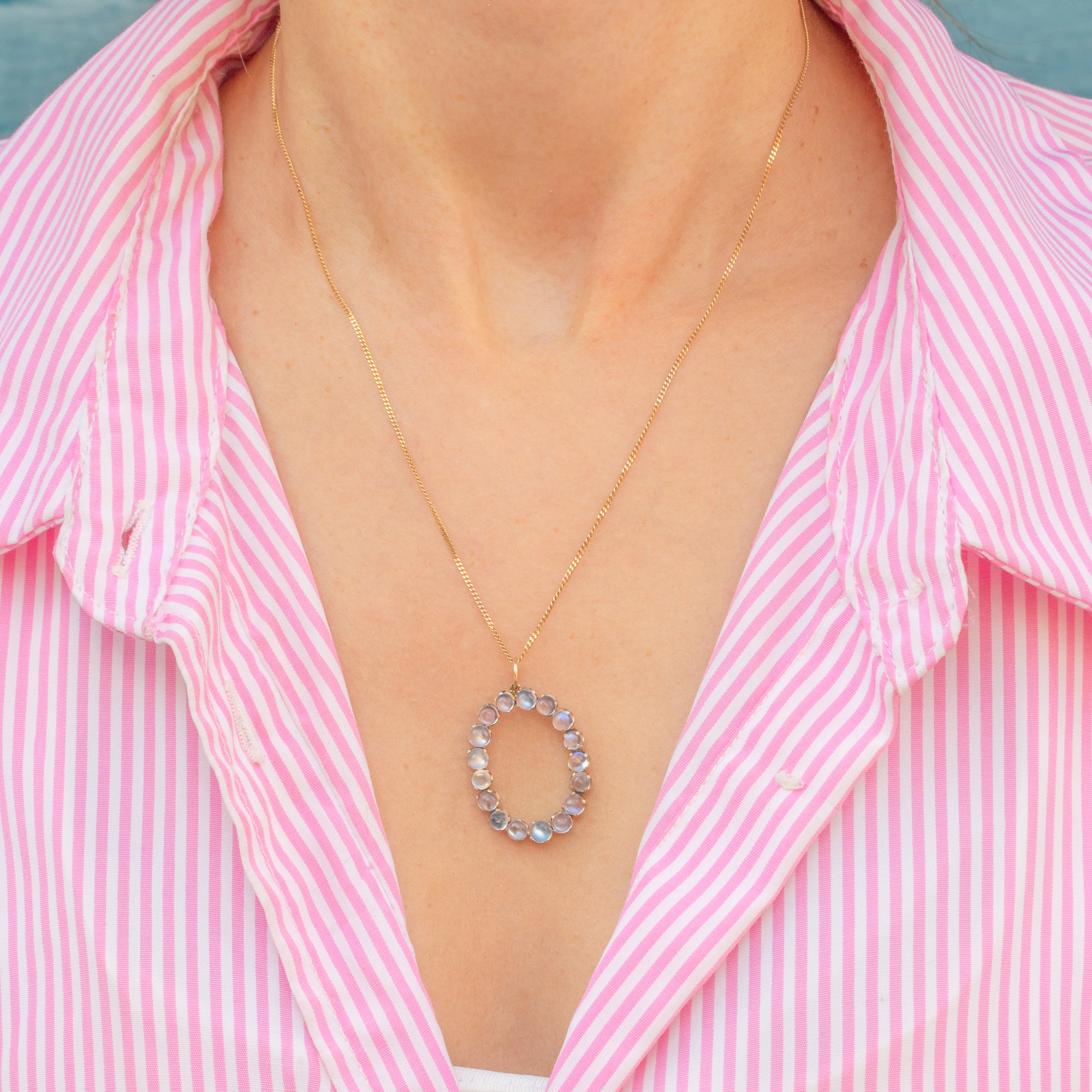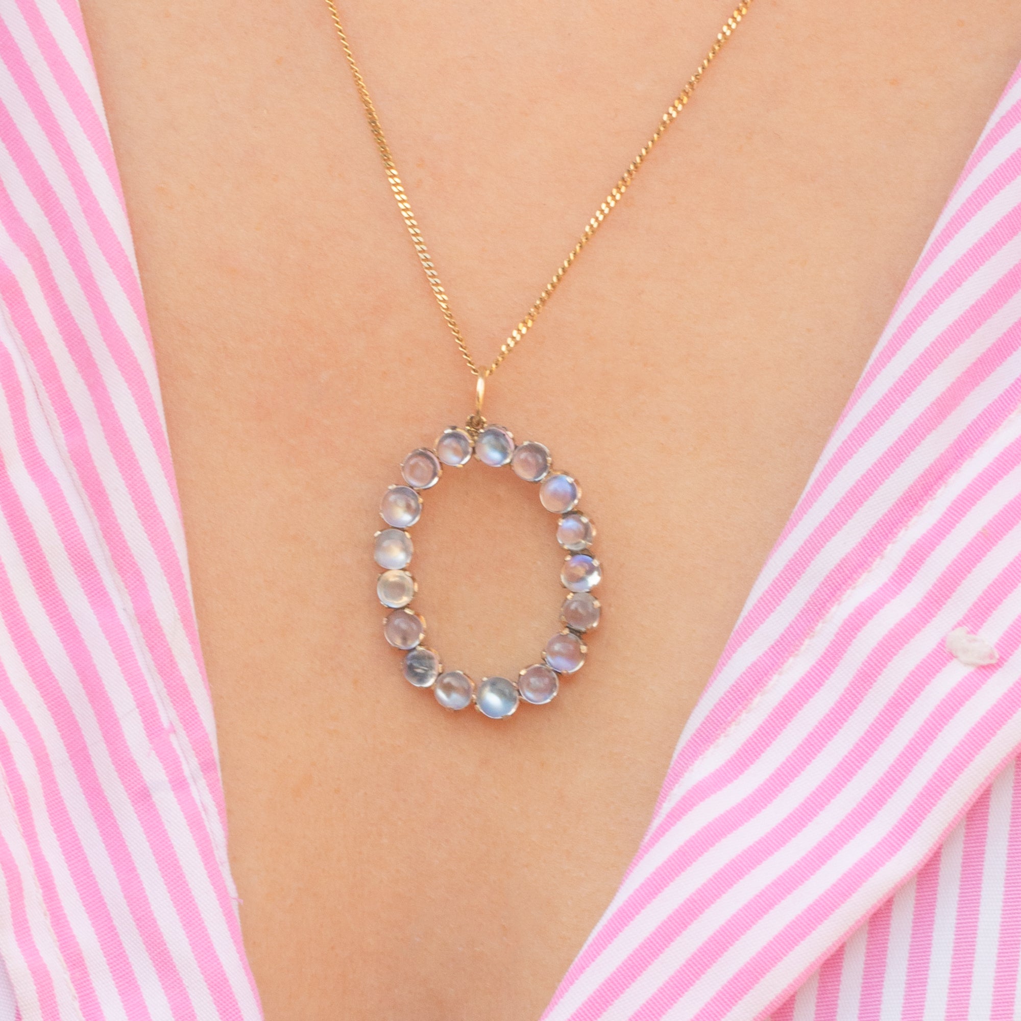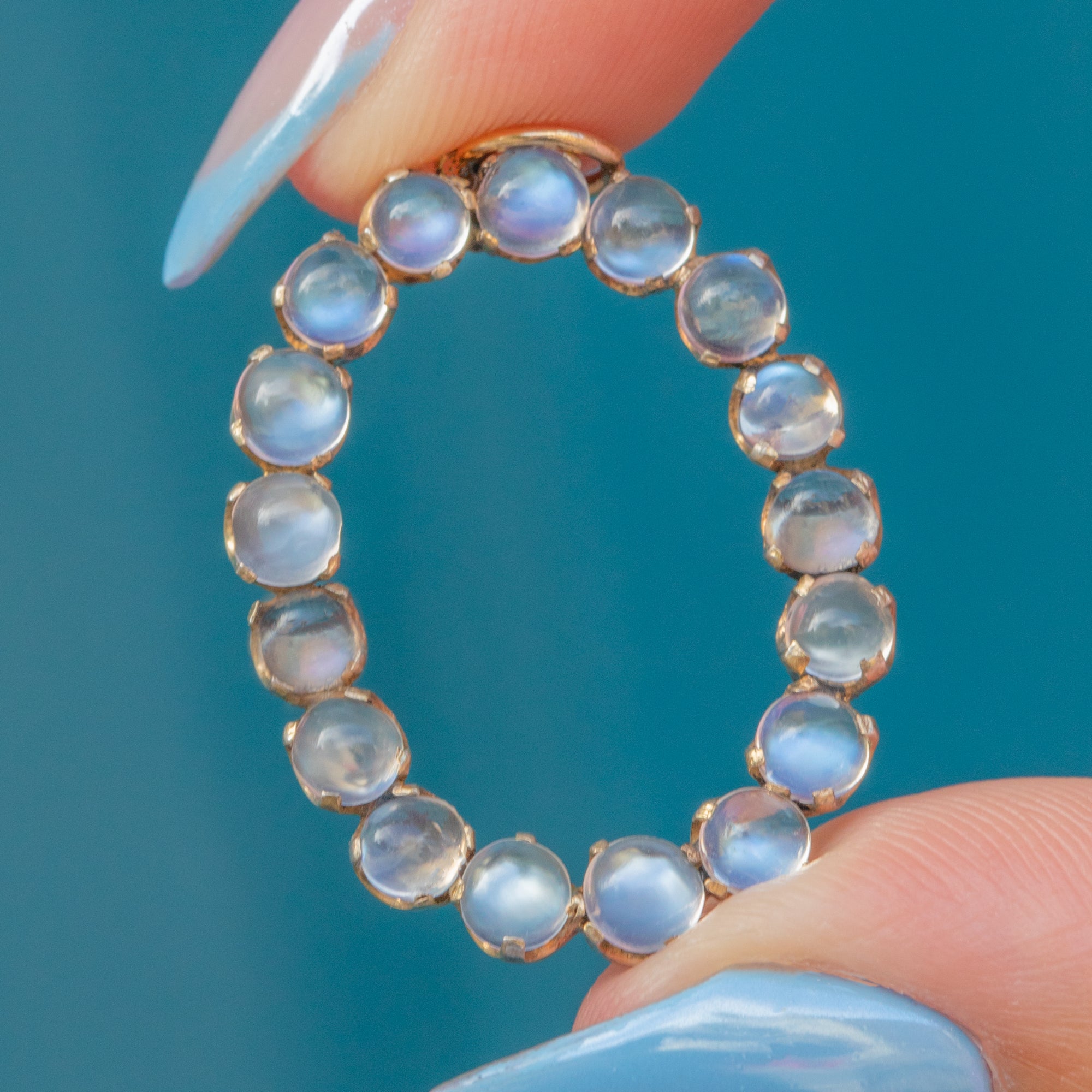 This enchanting antique Moonstone roundel pendant features an oval cluster, boasting seventeen radiant Moonstone cabochons with a combined weight of 2.05ct.