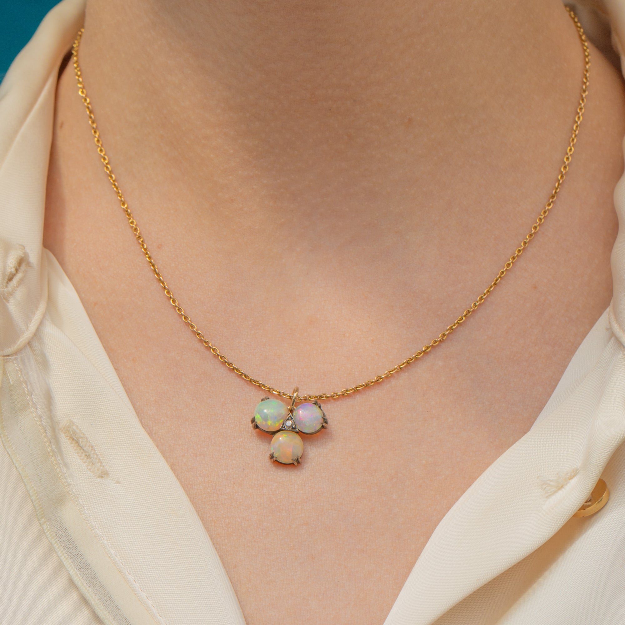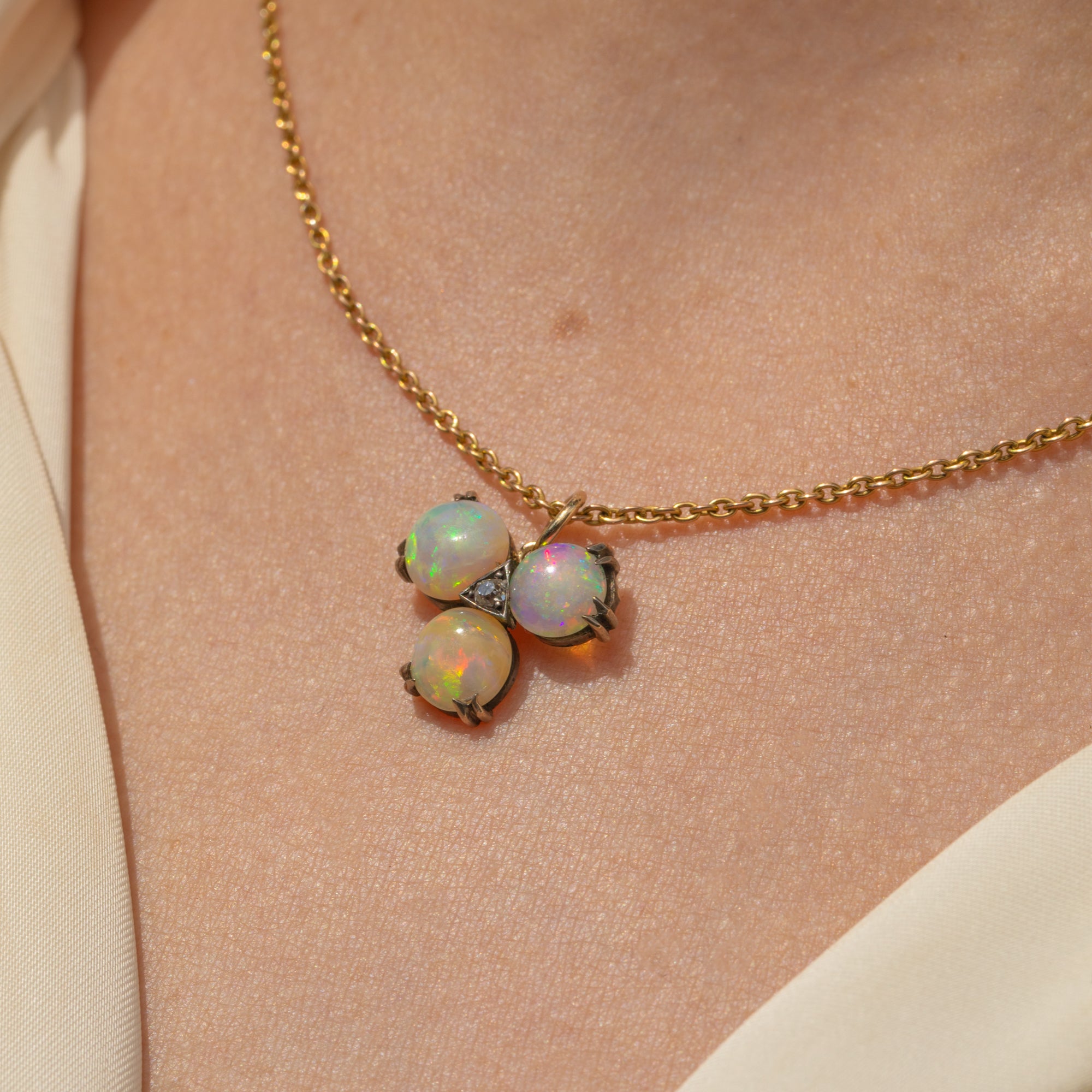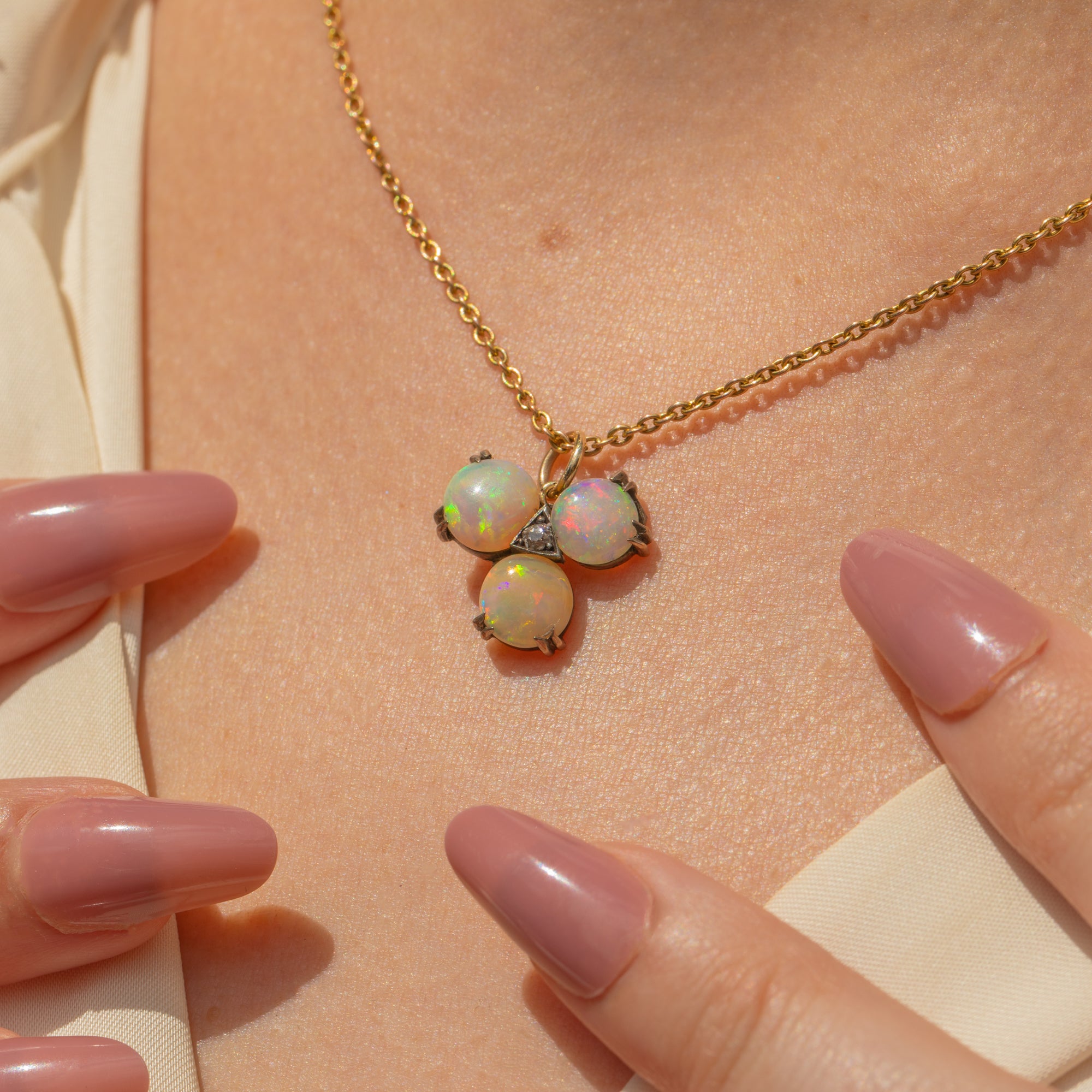 This antique Silver Opal Diamond shamrock pendant is full of fire! With vivid flashes of electric blue, lime green, and neon orange, you'll easily get lost in her iridescent depths.