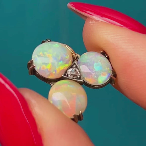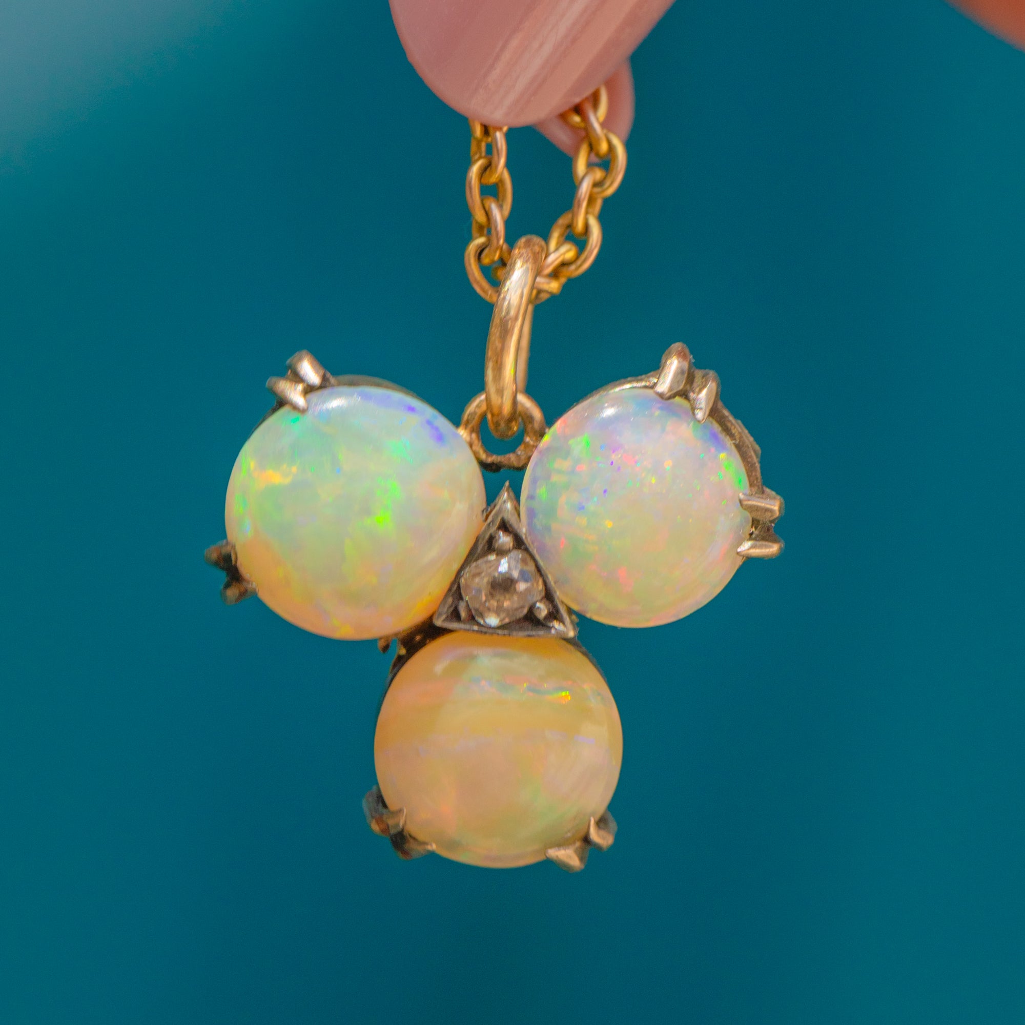 EXCELLENT. This antique Silver Opal Diamond shamrock pendant is in excellent condition! Her Opals and Diamond are held securely in their settings and are free from chips or scratches! The Silver has accrued an admirable patina creating a dramatic contrast with the gemstones and the soldered 9ct Gold jump ring allows you to wear her confidently!