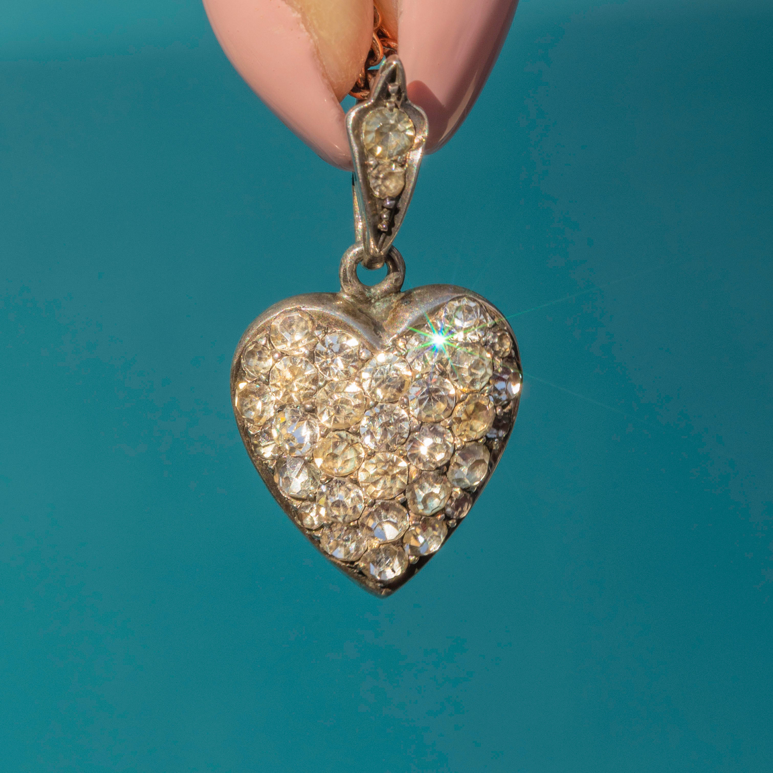 Add a touch of romance to your collection with this cute antique Silver Paste heart pendant! Crafted from Silver, the front of this Victorian pendant is inlaid with hand-cut Paste, each one providing a wonderful glisten emphasised by the admirable patina accrued around the settings.