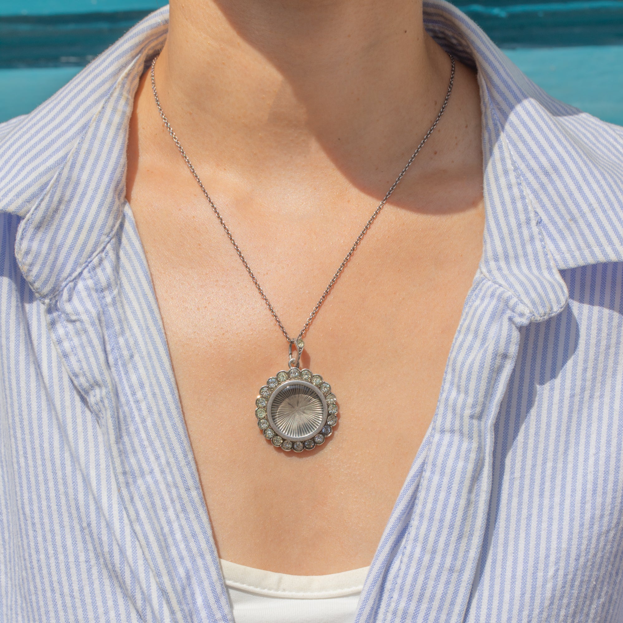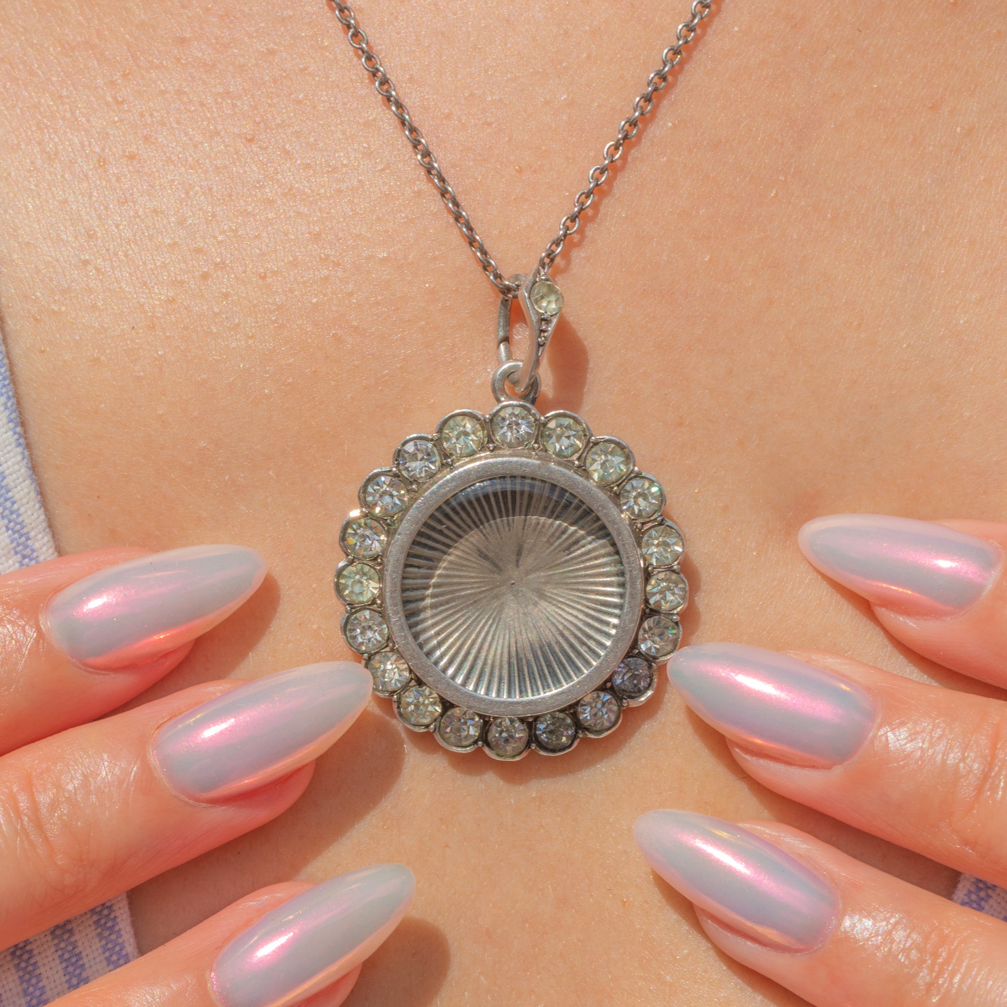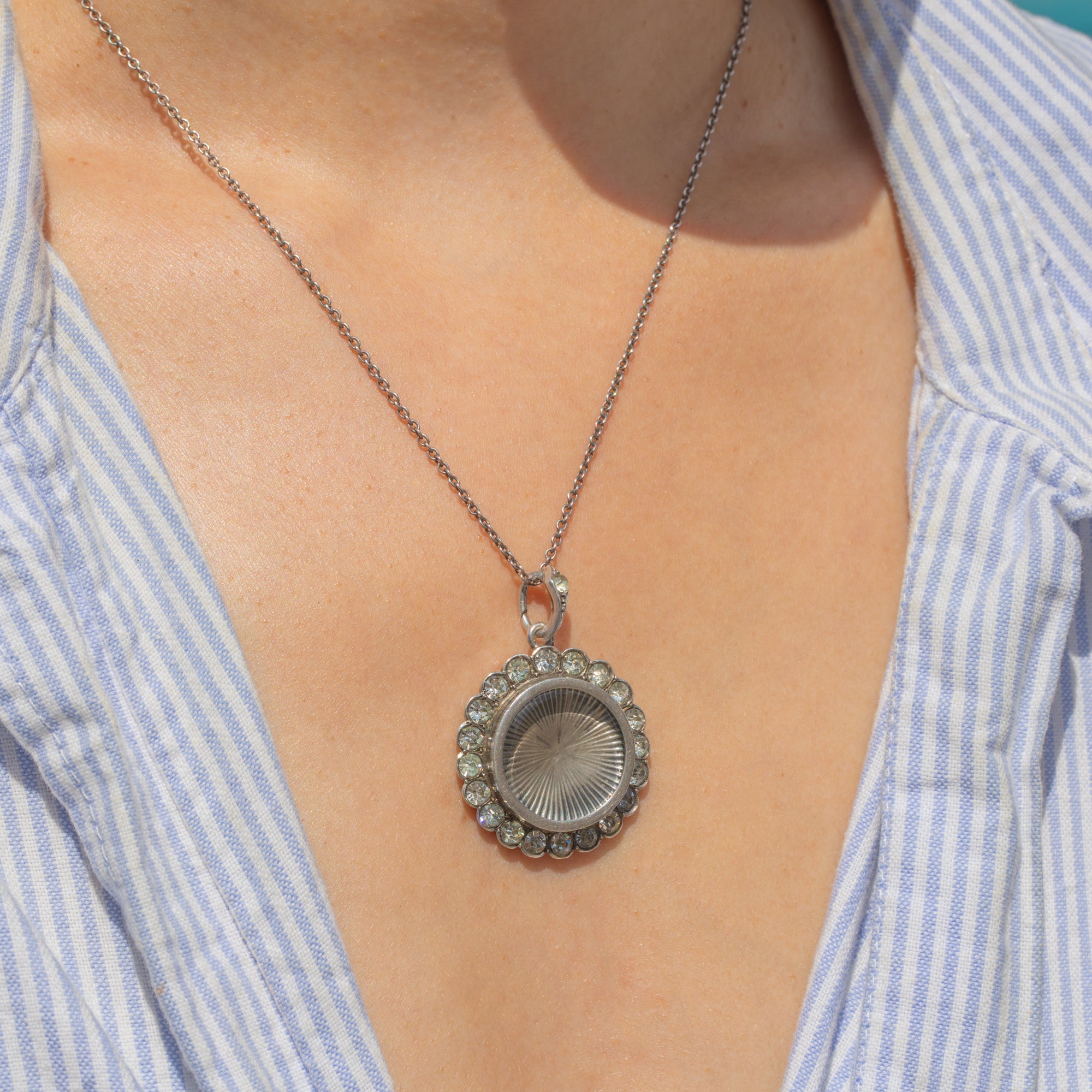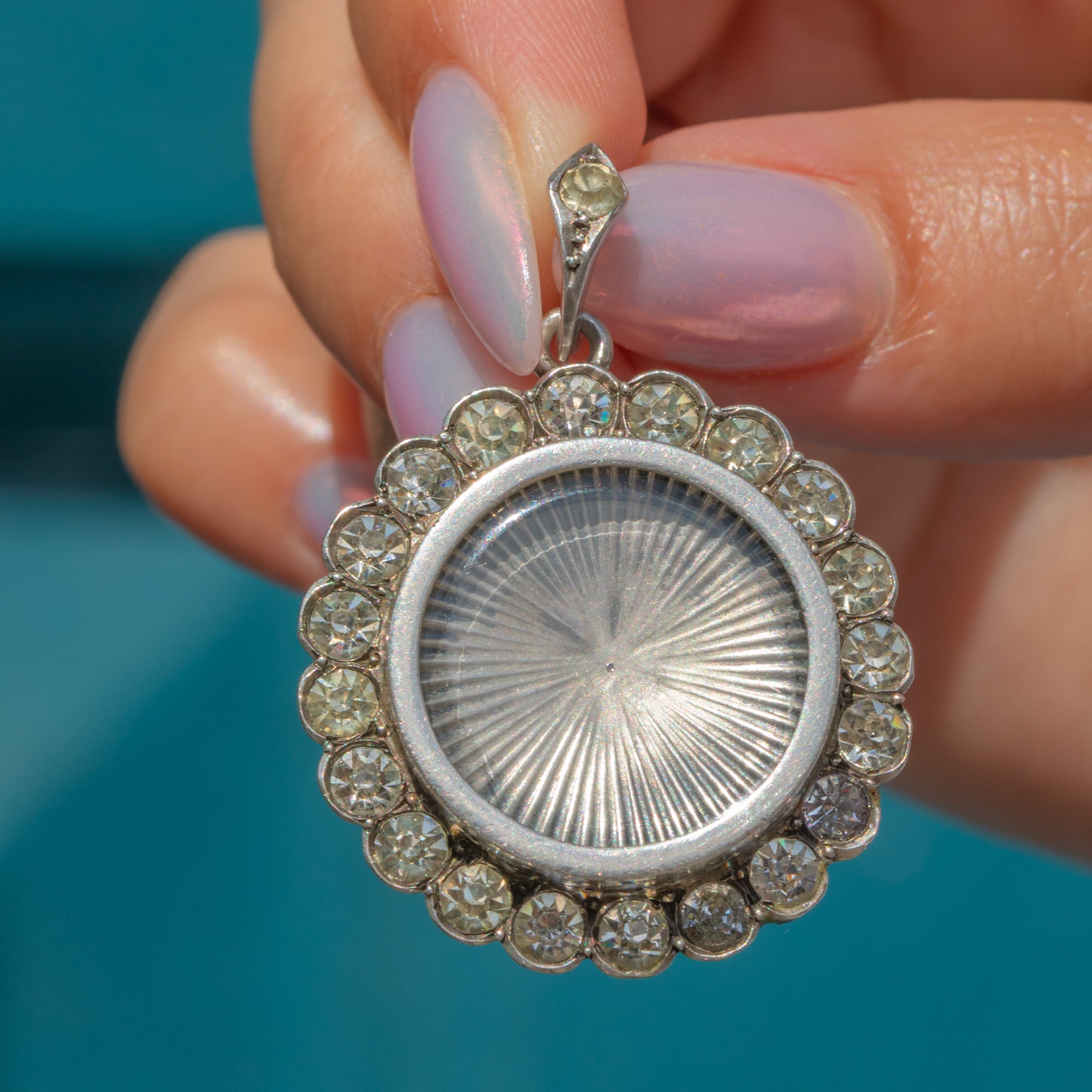 Plucked from the prettiest era, this antique Silver Paste picture locket is a fine example of Edwardian design! With an effortlessly feminine appeal, this Edwardian locket has been finely crafted from Sterling Silver and inlaid with bright Diamond Paste, creating a sea of scintillating sparkle as their crisp facets catch the light.