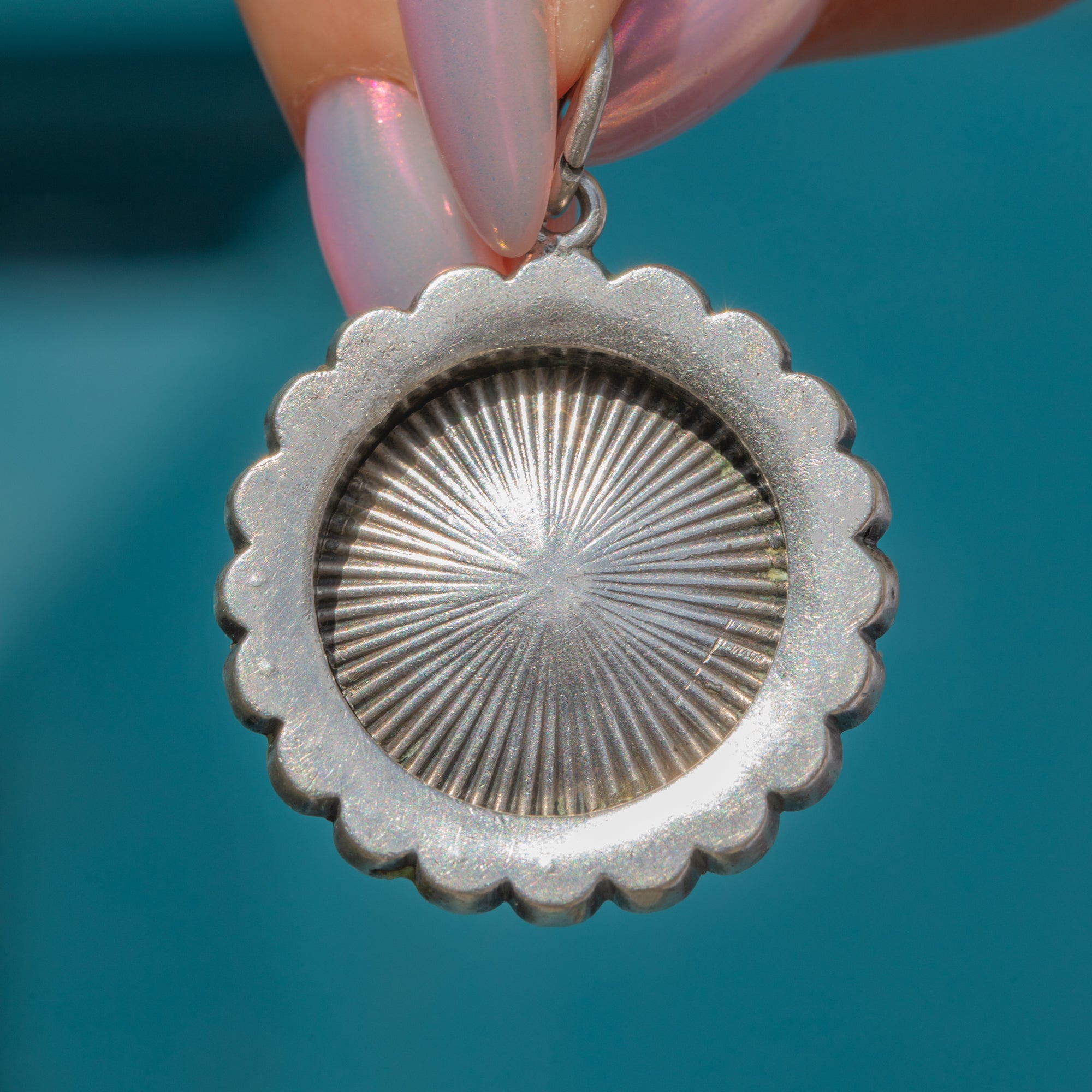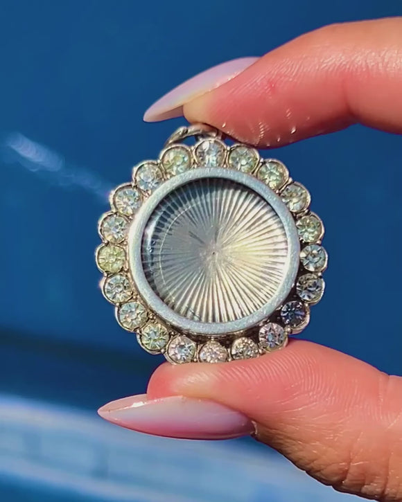 VERY GOOD: This antique Silver Paste picture locket is in very good condition. The Paste are all present and securely set, and although some of them vary slightly in hue, appearing more yellow from years of use, they are free from notable chips or abrasions. The Silver is lustrous, with a light patina having accrued within the details, and the locket has held its form well. The locket opens by gently pushing the entire plexiglass panel down, and will hold your chosen photograph securely in place. Please note that the locket compartment is too shallow to be used as a shaker.