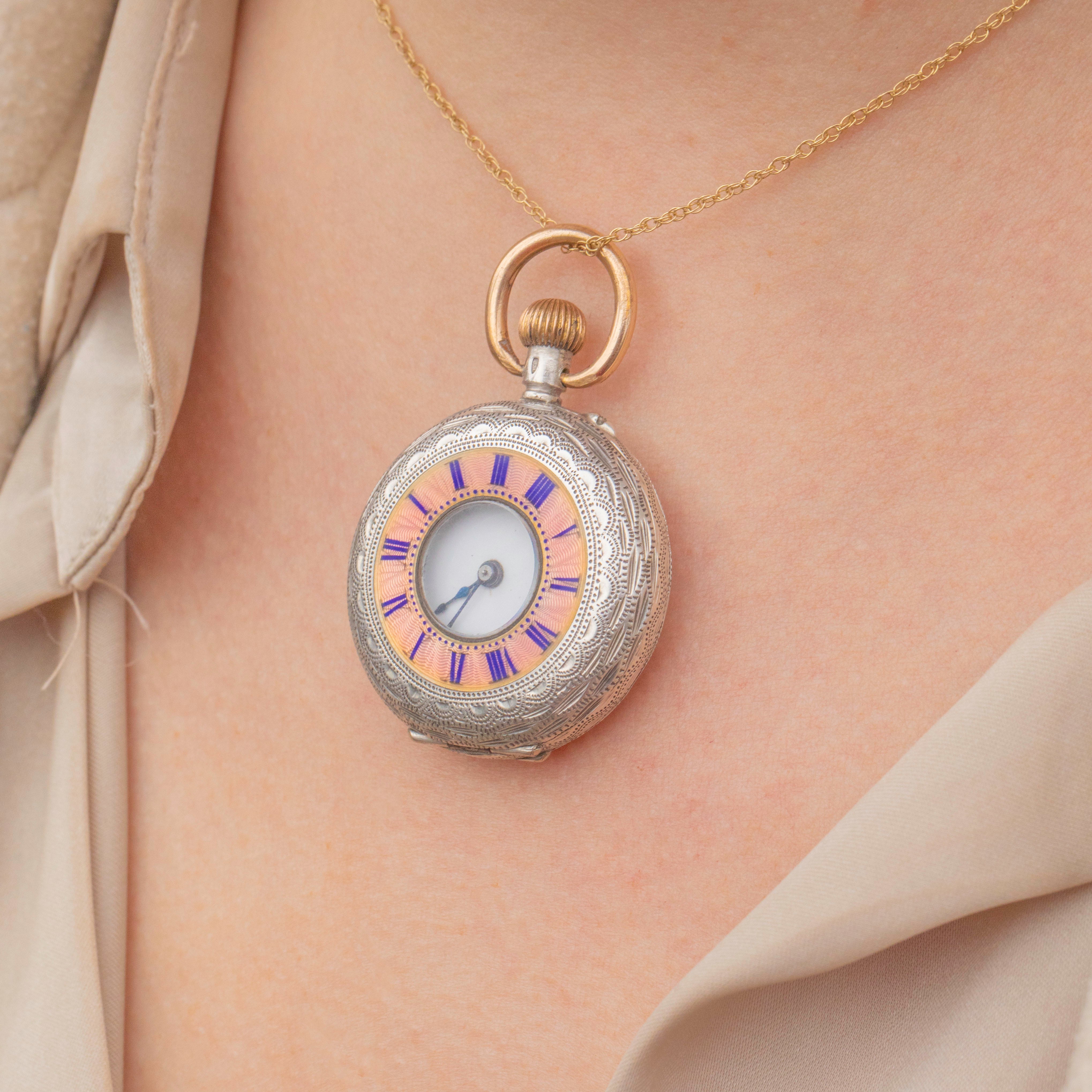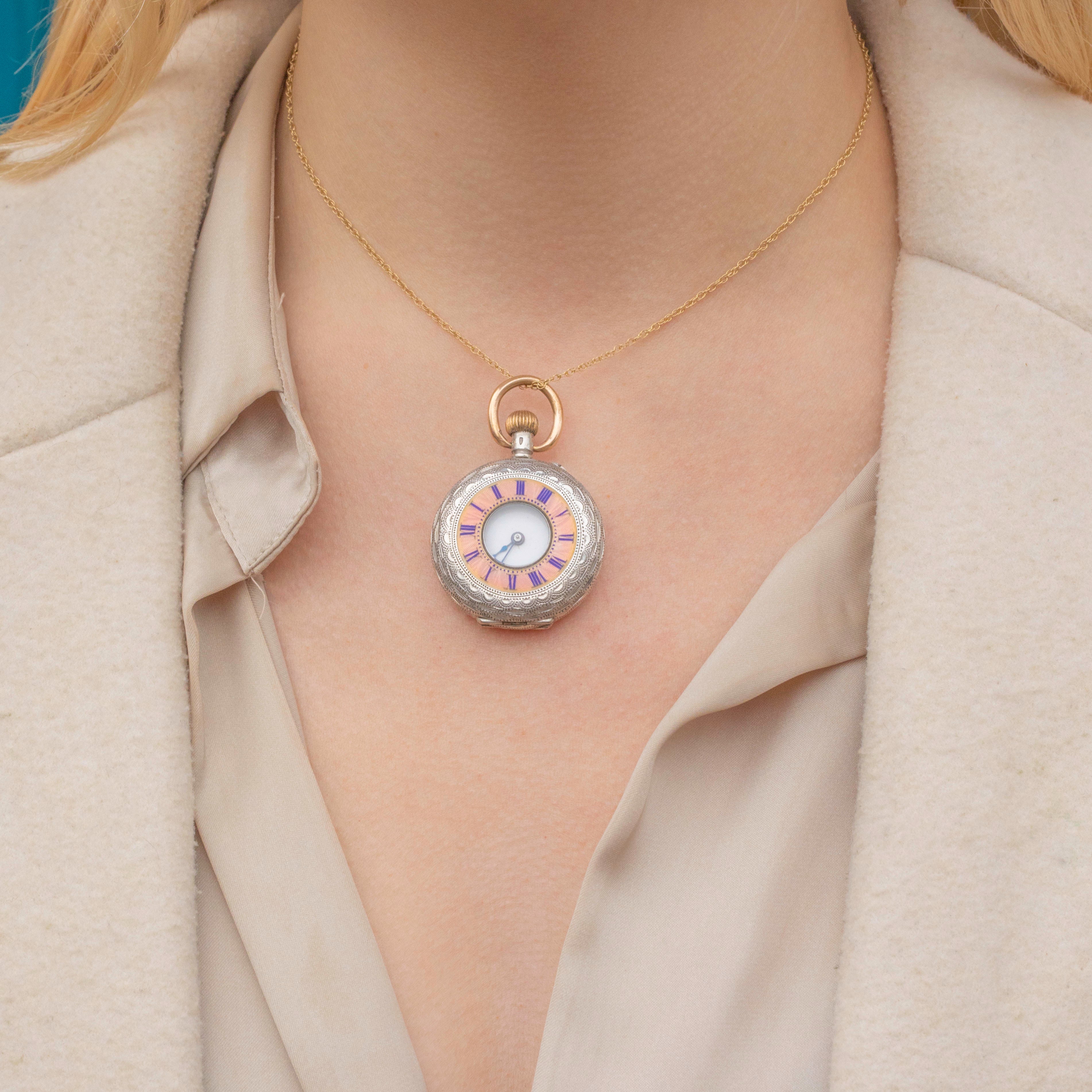 This phenomenal antique Silver pink Guilloché Enamel pocket watch will set your collection apart from the rest! Perfectly capturing the intricate craftsmanship of the Victorian era, this antique Swiss pocket watch displays ornately engraved details, that can be appreciated from every angle, and offers a bright pop of colour from the light pink Guilloché Enamel.