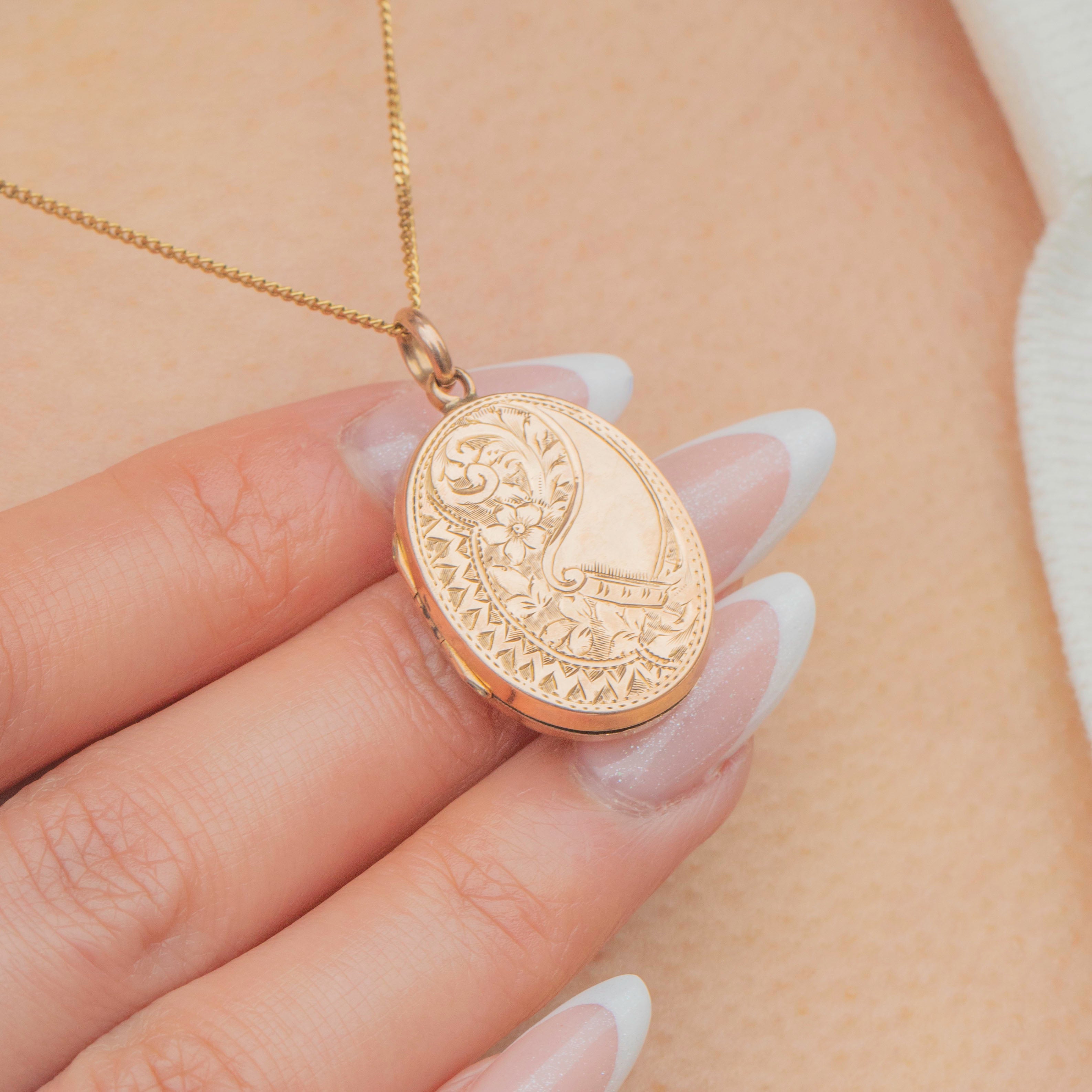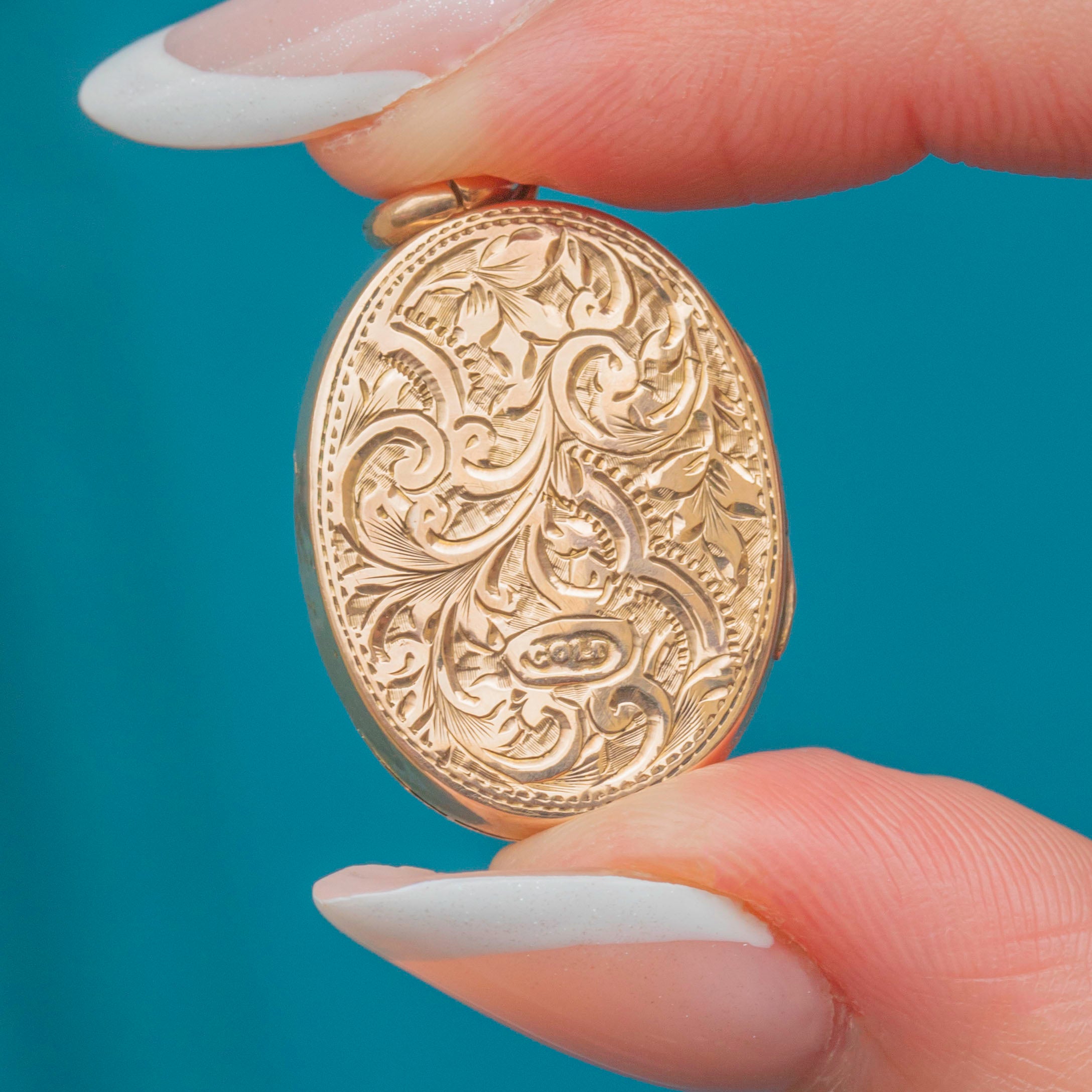 This antique solid 9ct Gold oval engraved locket is simply divine! This delightful piece is engraved on both sides and opens to reveal a frame, to which you can add a cherished photograph.