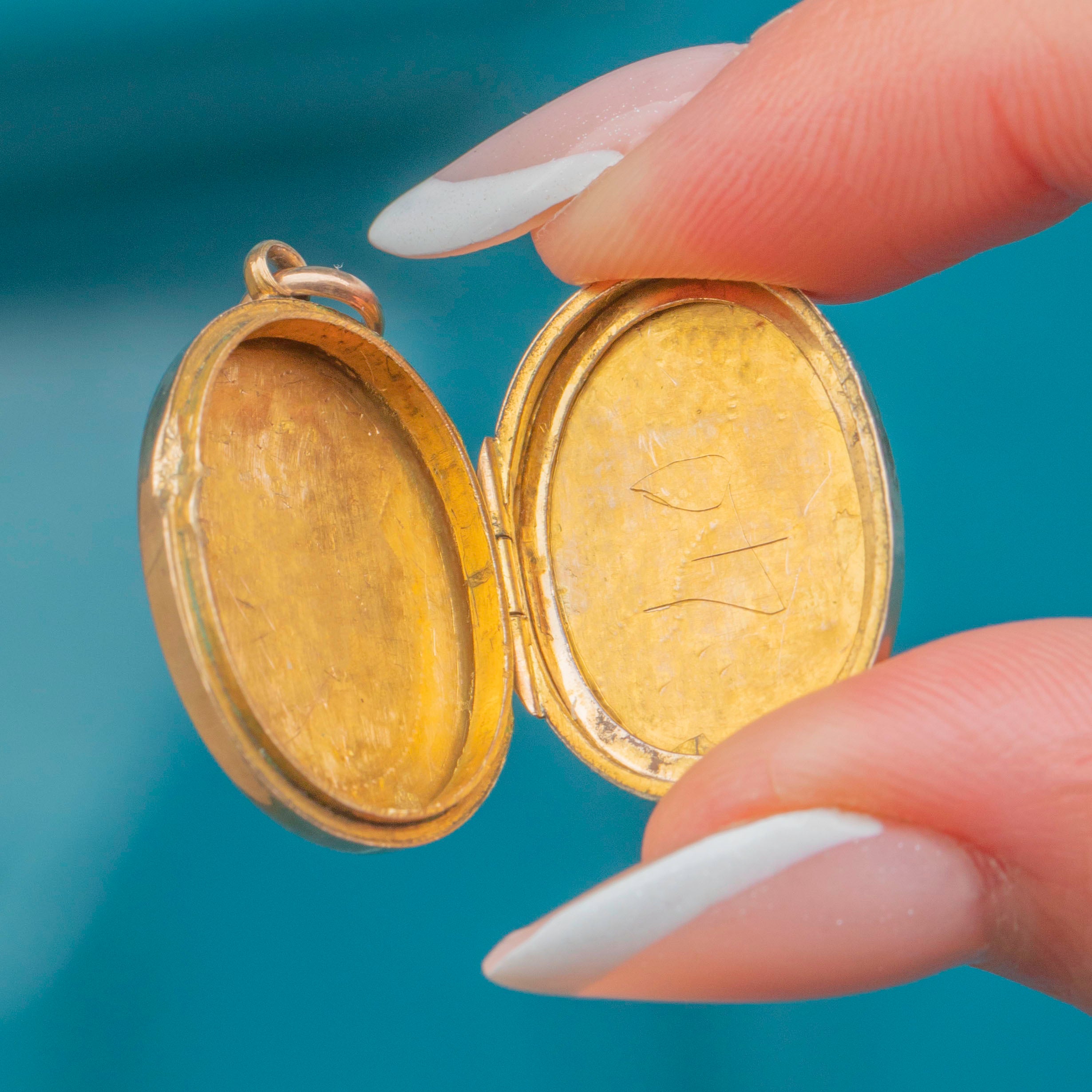 GOOD-VERY GOOD: This splendid antique solid 9ct Gold oval engraved locket is in great condition! This piece is engraved on both sides, stamped, and complete with a frame- what's not to love! The Gold is bright and buttery, with her engravings in perfect condition. While a firm pull is needed to open the locket, and the edges of the locket are ever so slightly unaligned, she does close securely with a satisfying click keeping your chosen photograph securely inside!