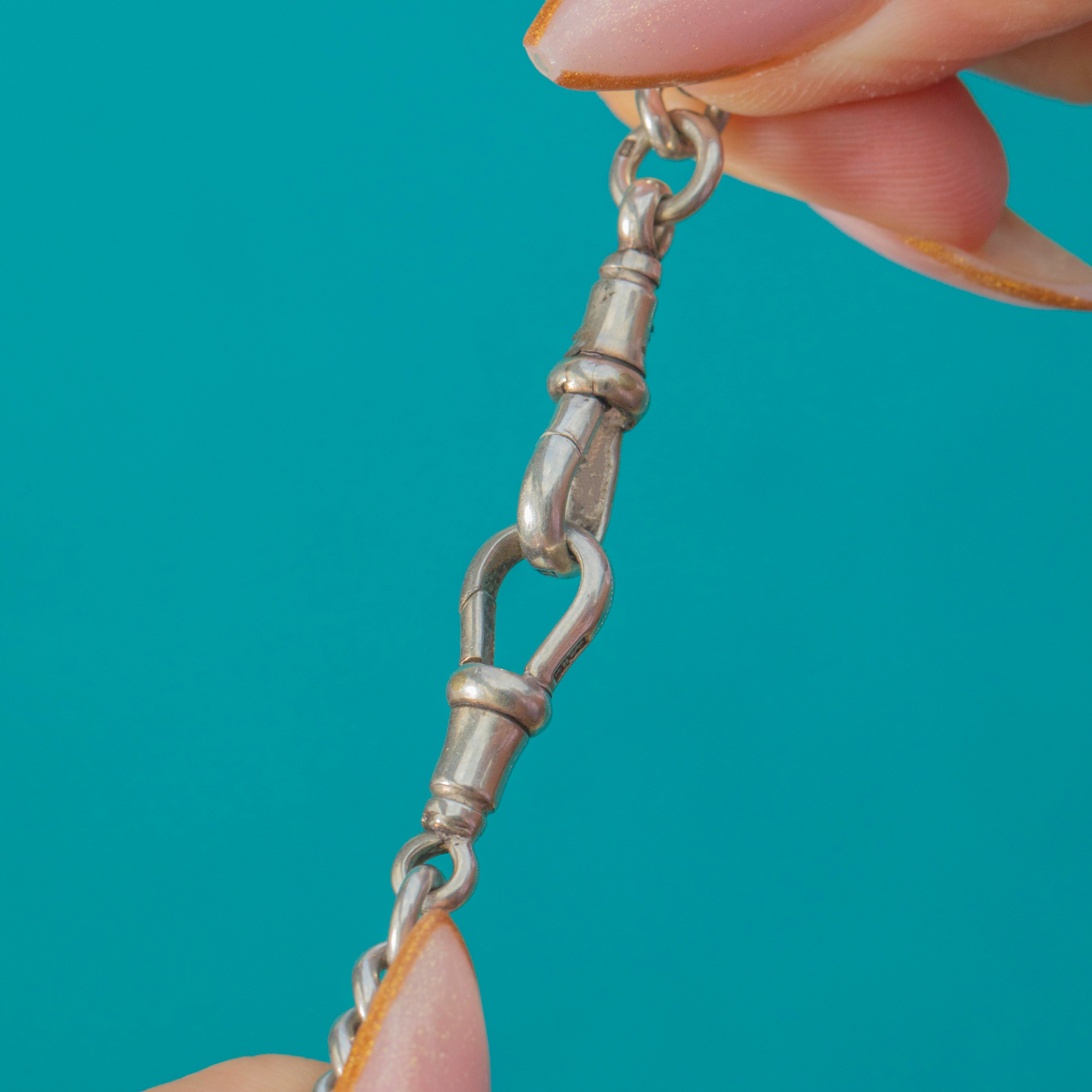 This Antique Sterling Silver Albert chain is a superb example of Victorian craftsmanship, complete with a mobile T-bar and matching dog-clips for that classic gentleman’s look. The chain is beautifully made with solid curb links, each one individually struck with the Lion Passant – a lovely detail that collectors and silver aficionados will adore.