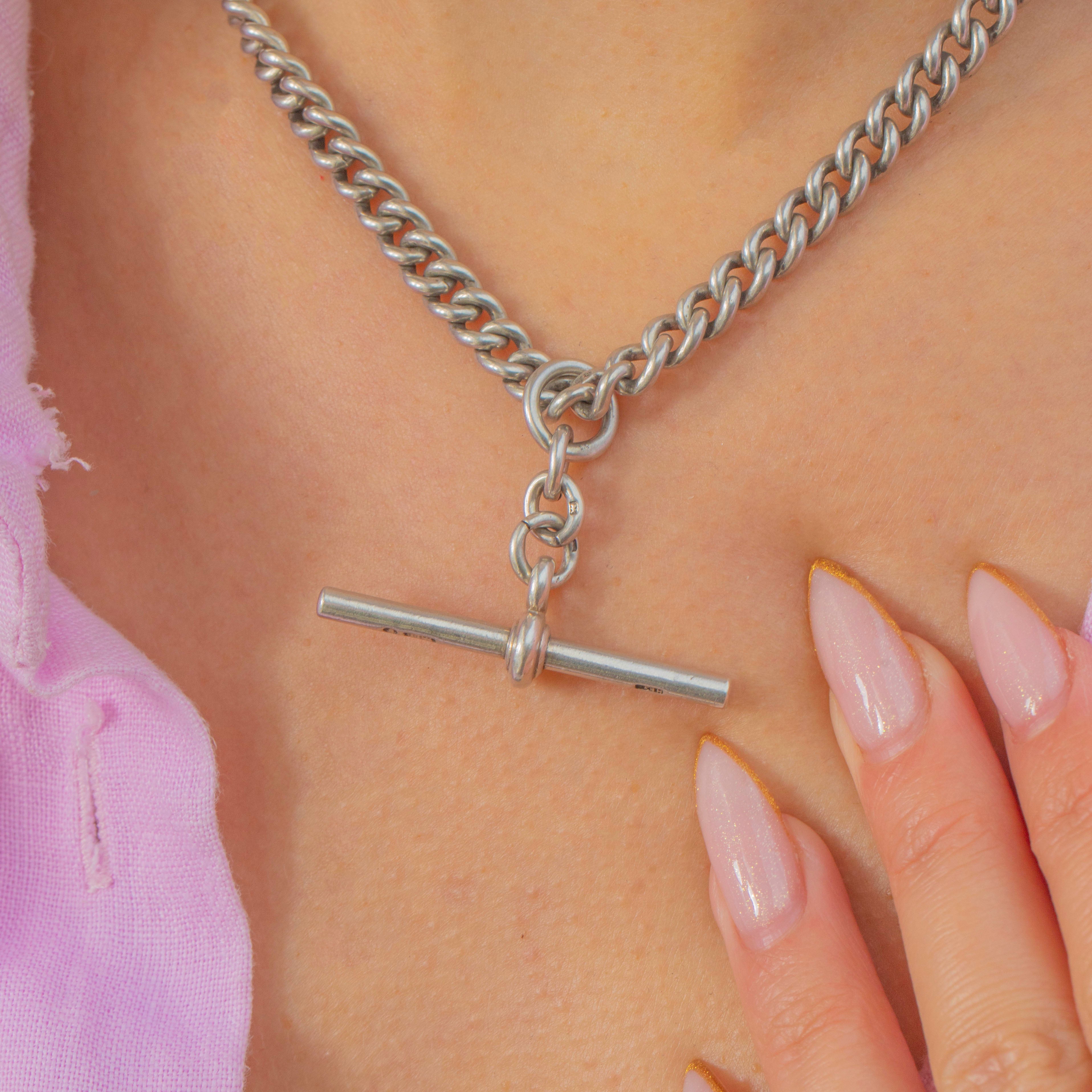 EXCELLENT: The Sterling Silver has a gorgeous antique patina with only light surface wear under close inspection, in keeping with its age. The curb links are strong and well-formed, with crisp hallmark strikes visible throughout. Both dog-clips and the mobile T-bar are in excellent working order, closing securely and ready for regular wear.