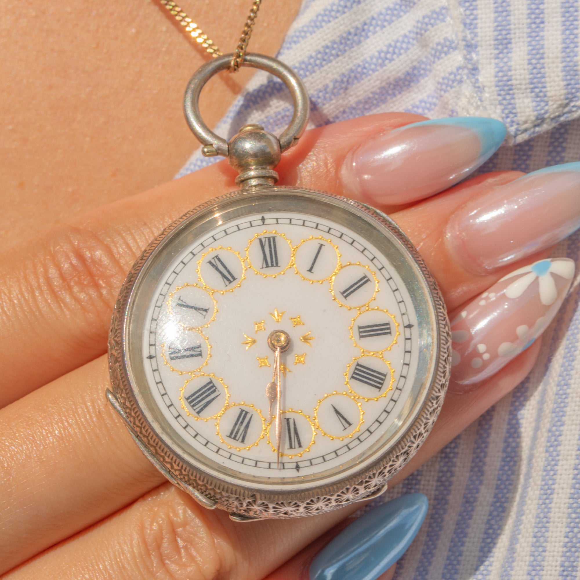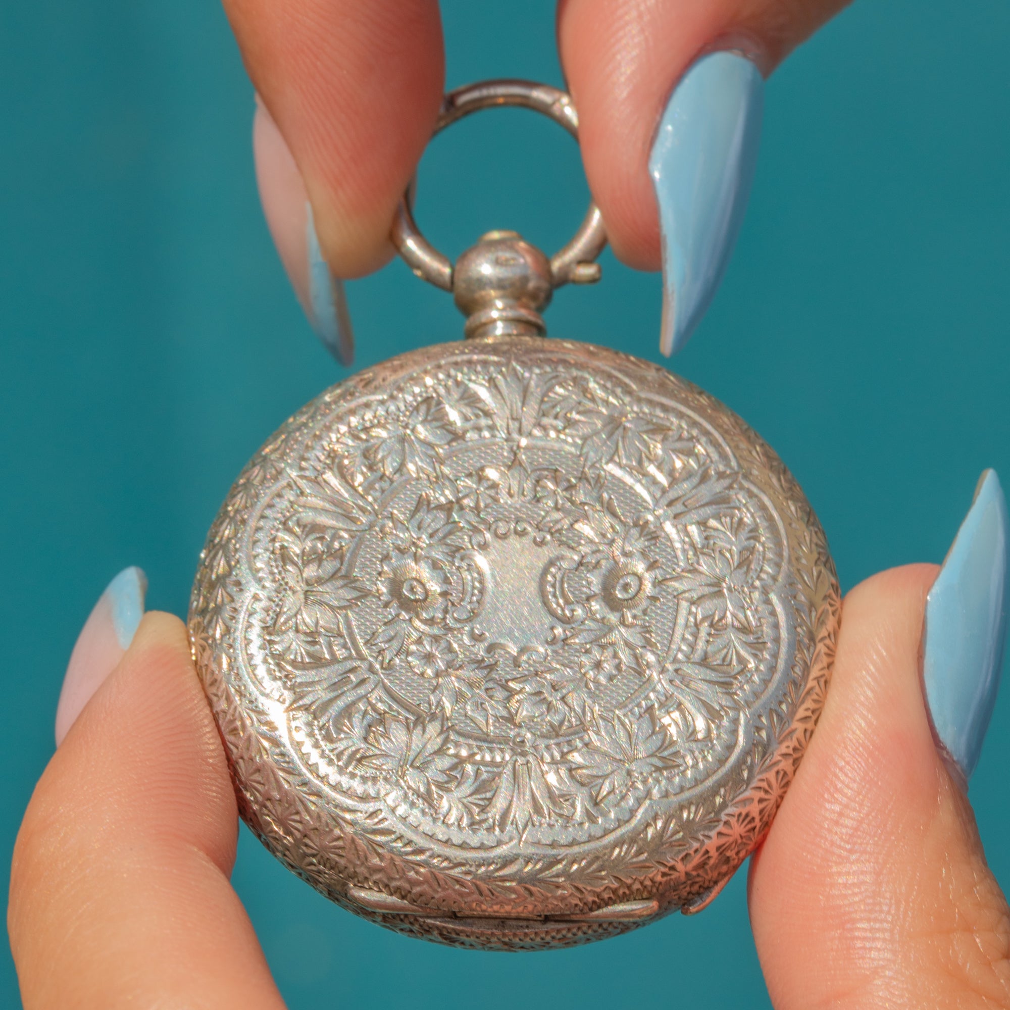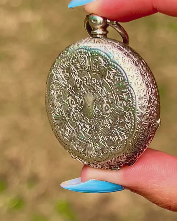 EXCELLENT: The watch can be opened easily by applying pressure to the bale, revealing its historic hallmarks inside. The engravings have remained crisp, as have the details on the watch face. Though it no longer functions to tell the time, you are still able to listen to this antique pocket watch tick. With a secure bale, this wonderful piece can be worn with confidence!