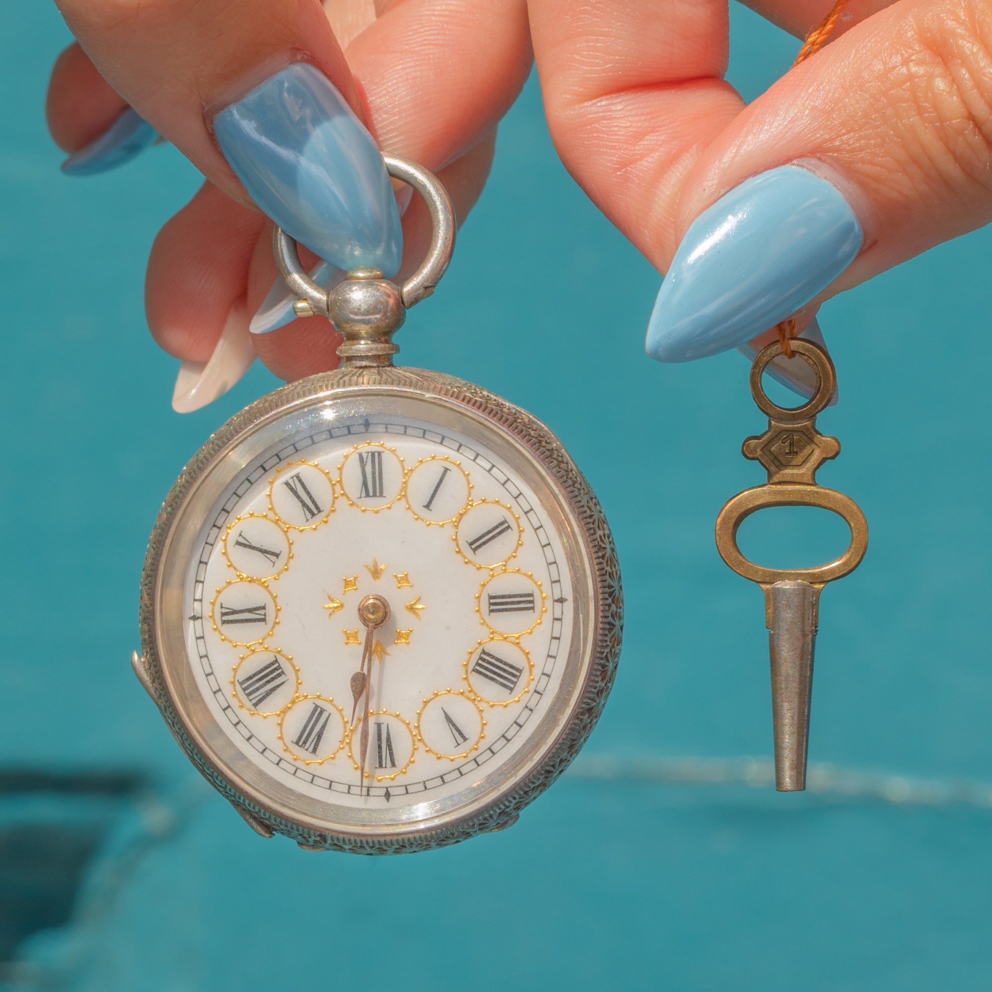 Boasting a charming clock face with Gold dial detailing, elegant Roman numerals, and an ornately engraved back, this piece simply radiates antique charm. Complete with its own watch key, with which you can hear it tick, this Victorian pocket watch will make a fine addition to any collection!