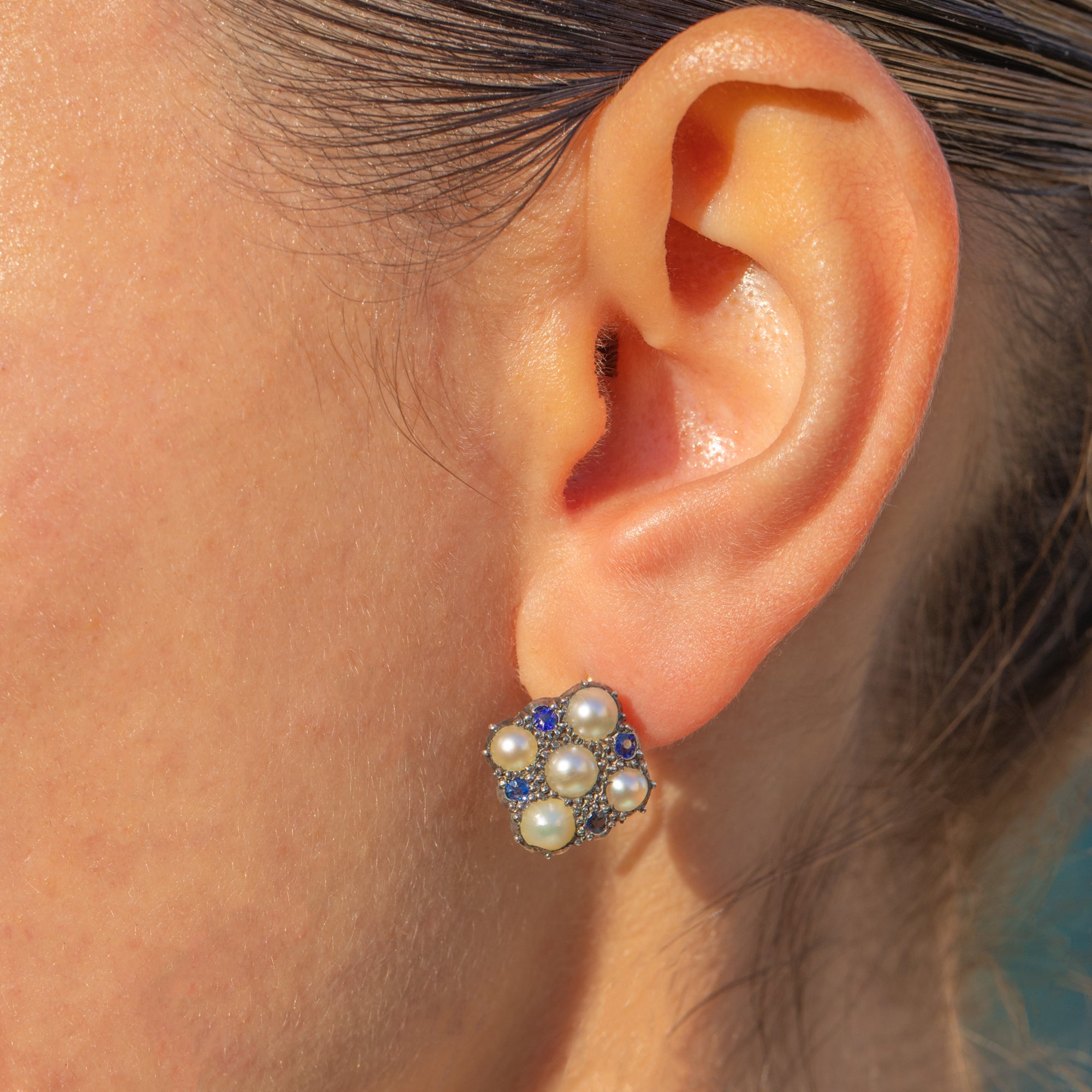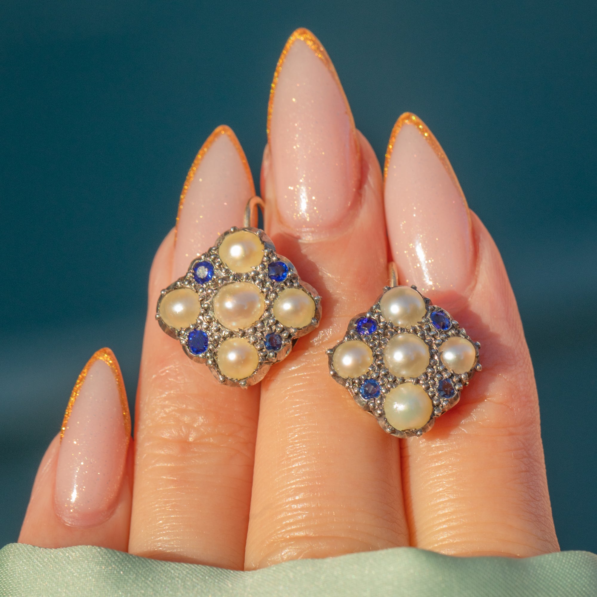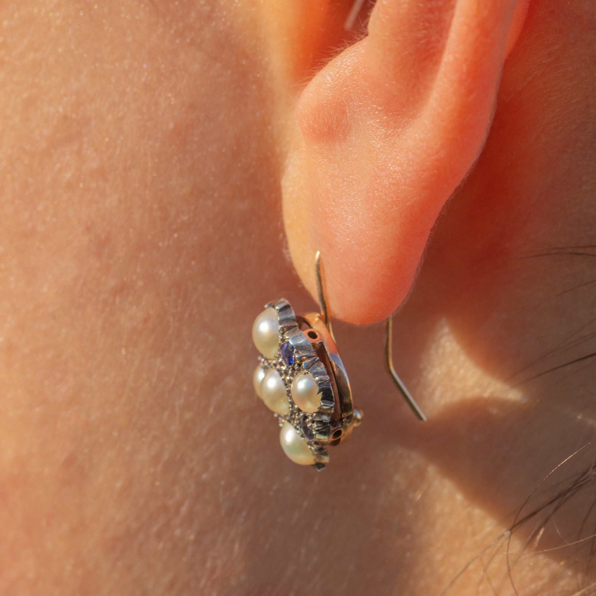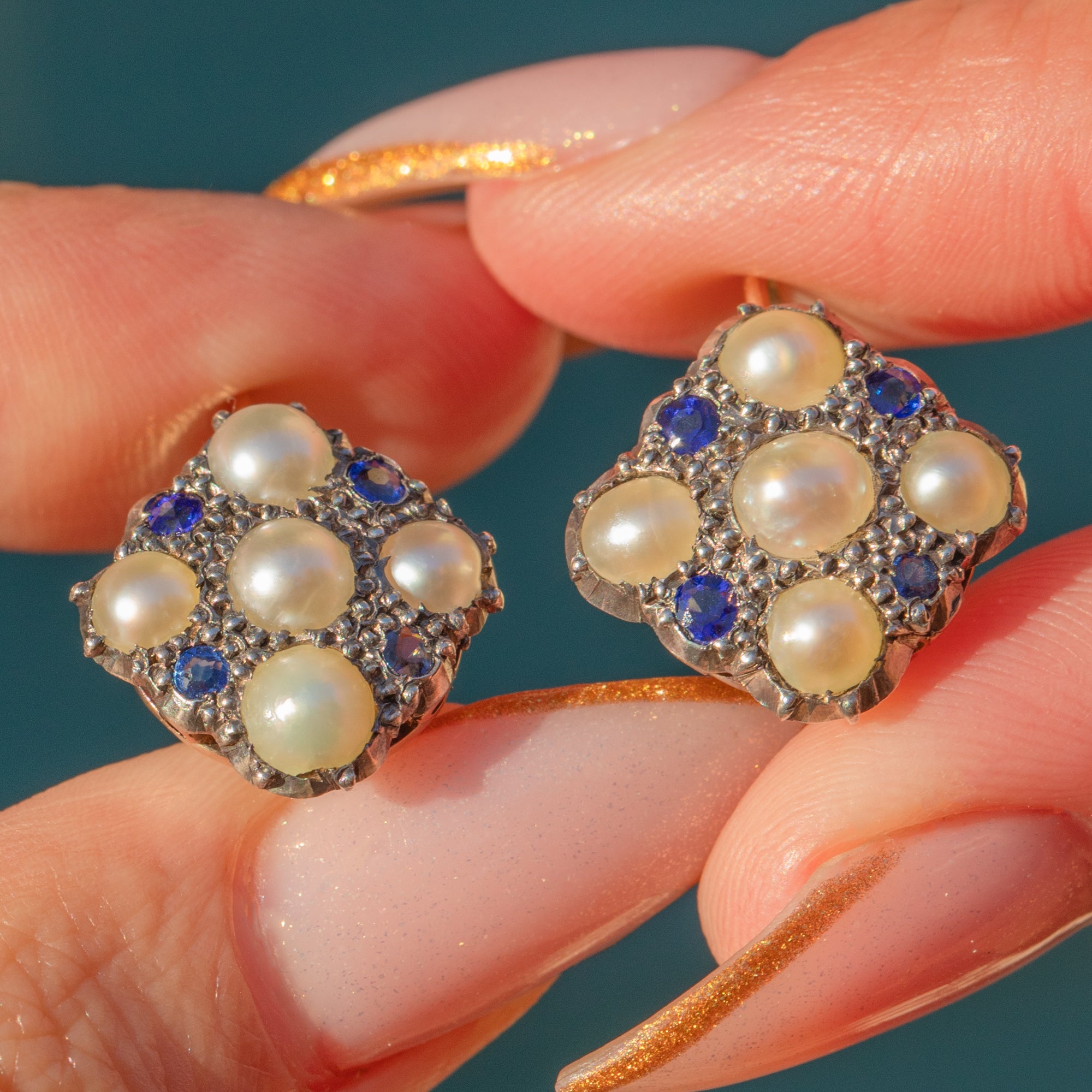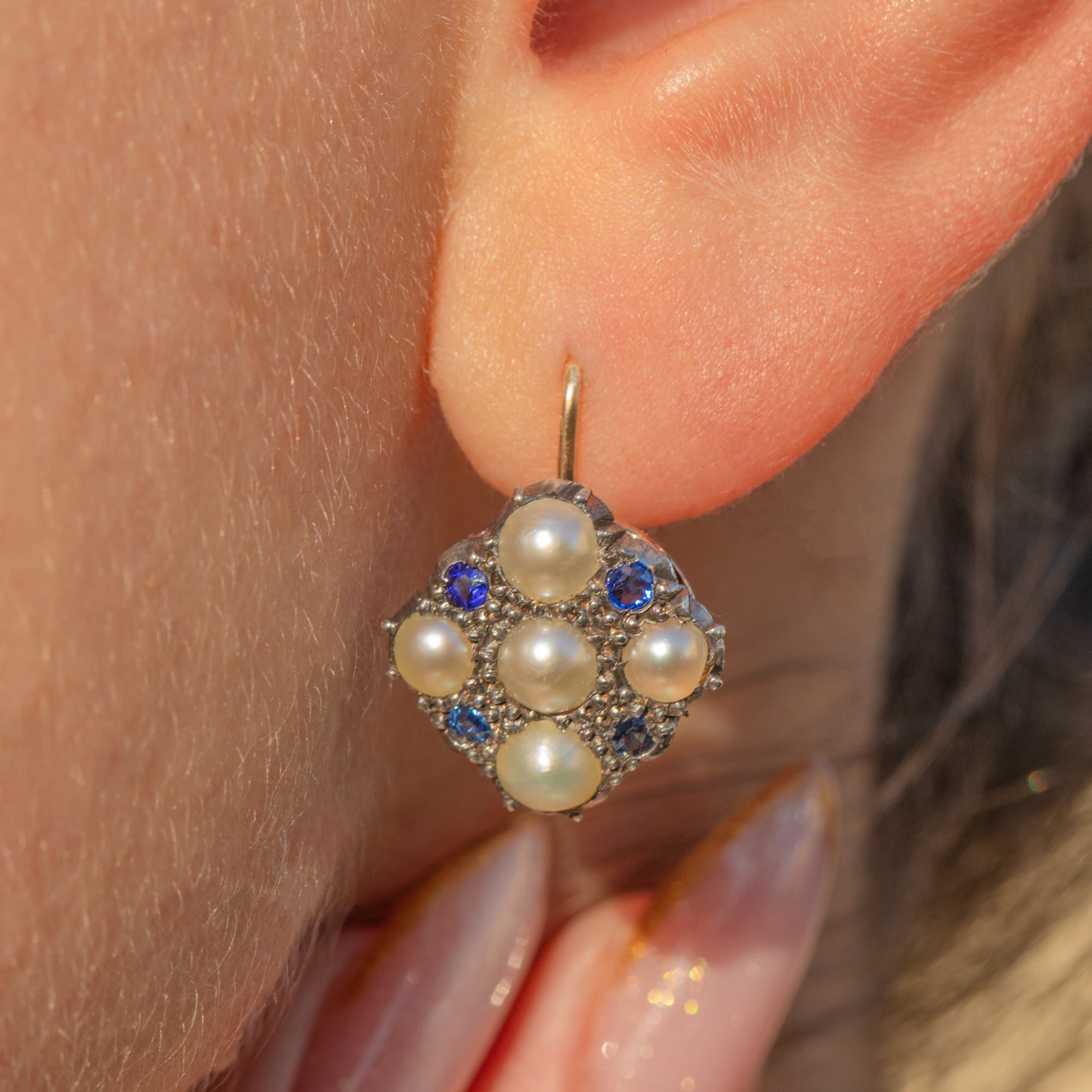 Boucles d'oreilles anciennes en grappe de tanzanite et perle, crochets en or 9ct