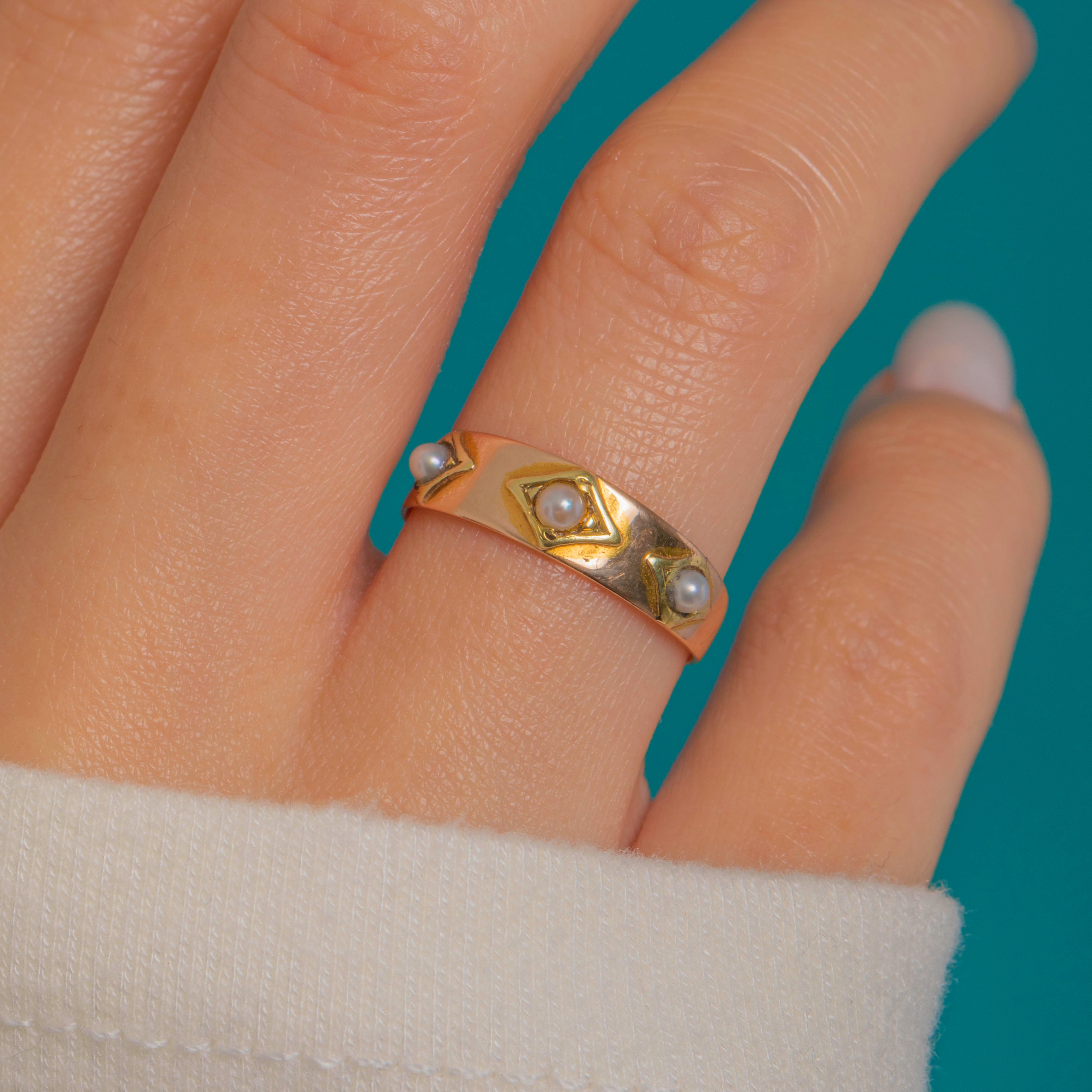 A refined Victorian treasure, this dated 1873 ring marries soft geometry with quiet elegance. Crafted in 15ct Gold with a beautiful two‑tone look, a rosy shank is accented by three lozenge‑shaped yellow Gold panels, each cradling a creamy white Pearl. The central Pearl sits slightly prouder, creating a gentle rhythm across the finger.