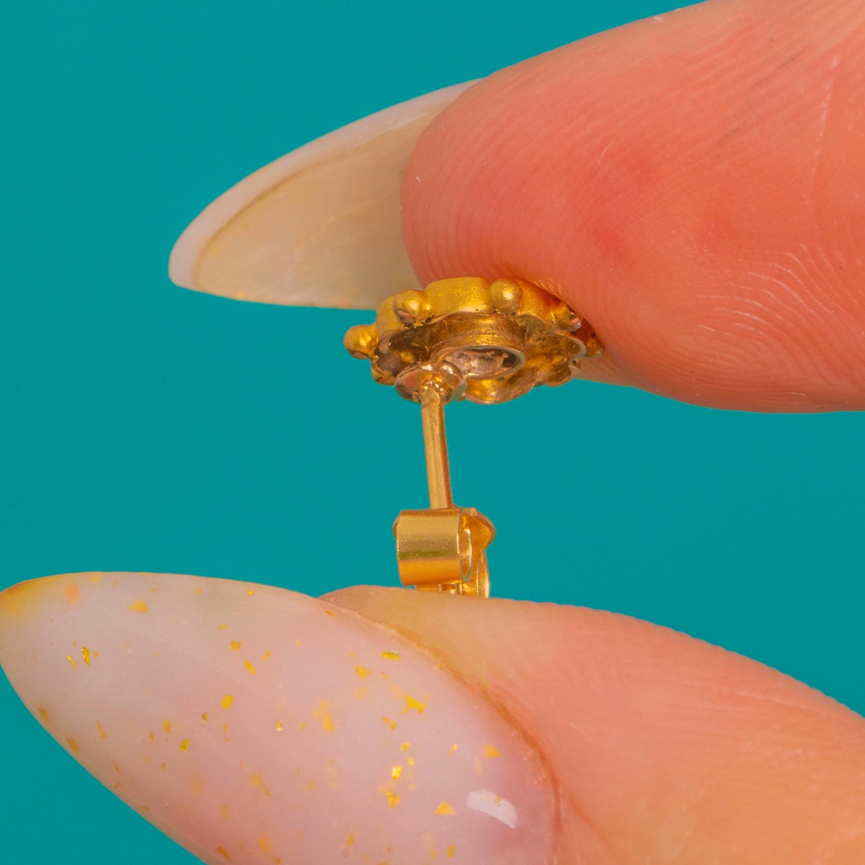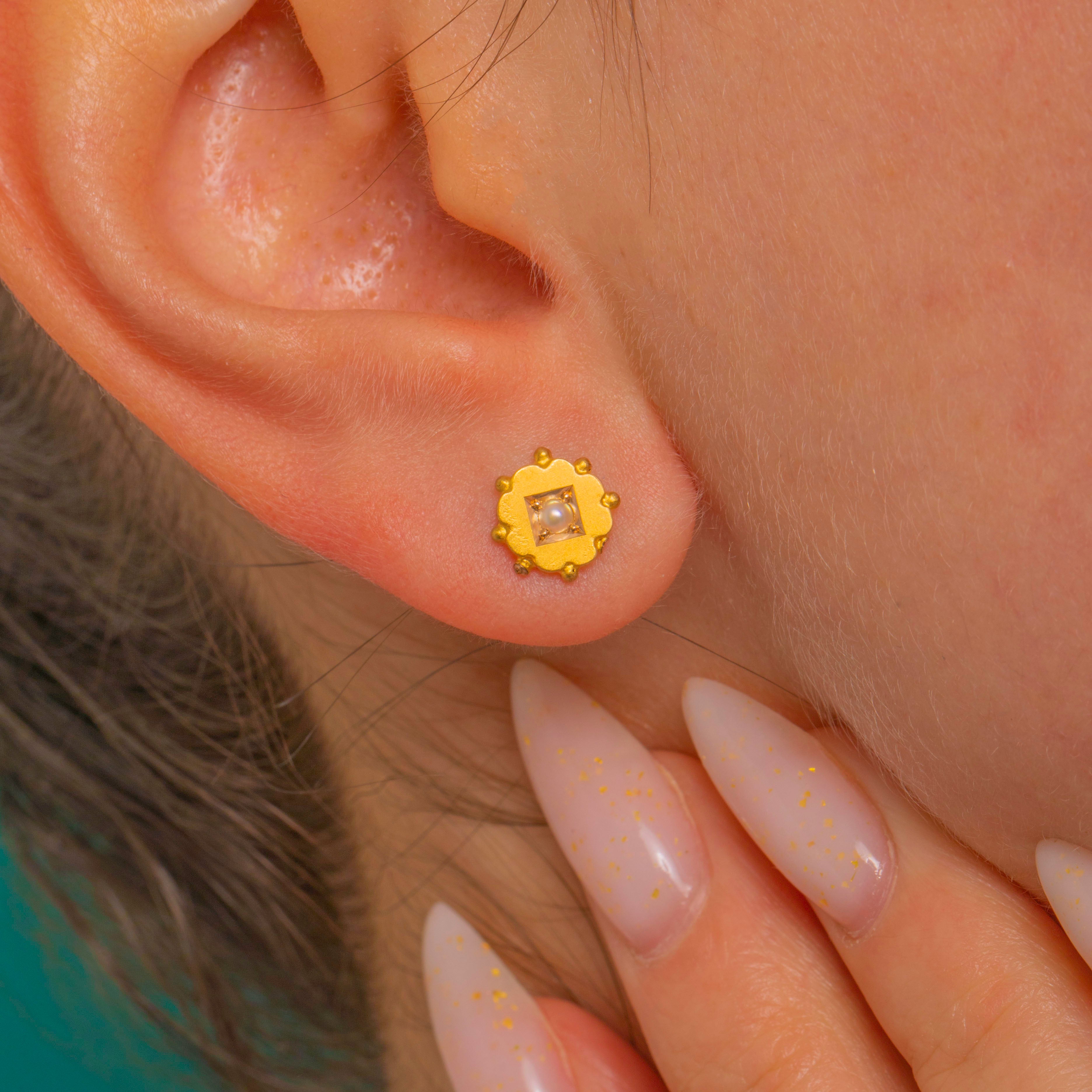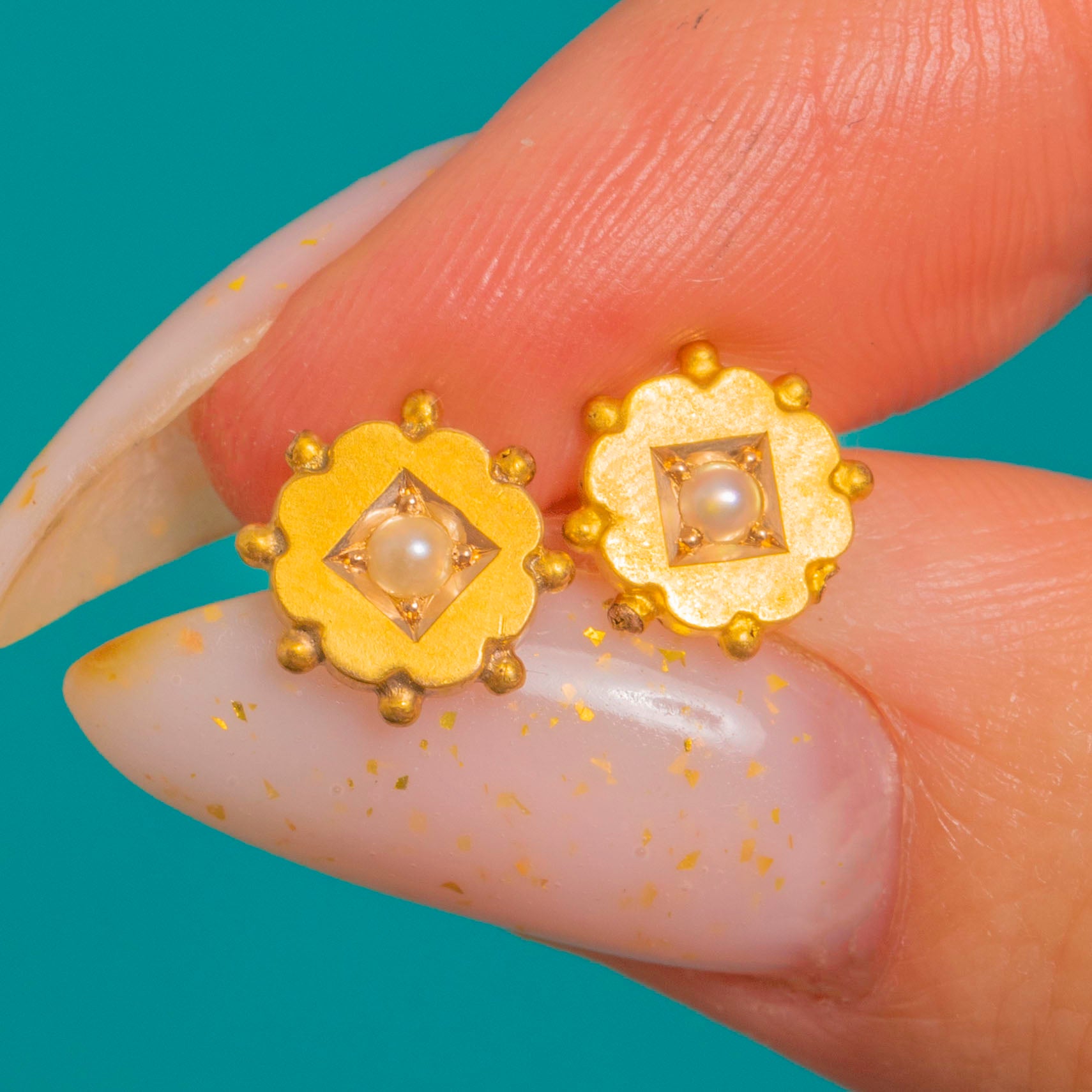 Delicate Victorian stud earrings crafted in warm 15ct Gold and centred with modest, luminous Pearls. Each earring is formed as a small scalloped rosette with applied bead detail that catches the light, offering an intimate, romantic silhouette that sits close to the ear.