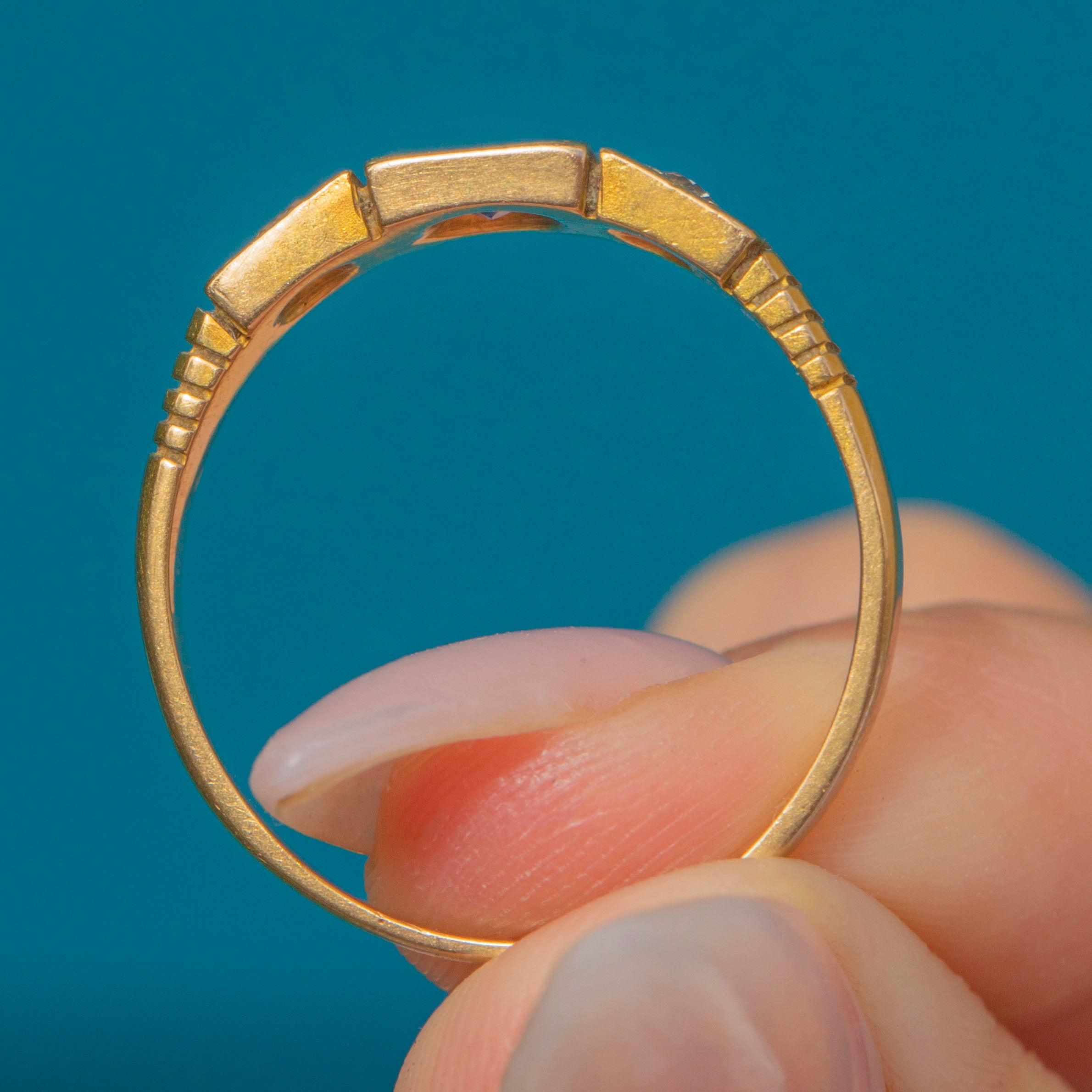 The ring has a bold, geometric profile with stepped shoulders. This classic Victorian design has excellent finger presence, with the gemstones perfectly proportioned within the Gold band.