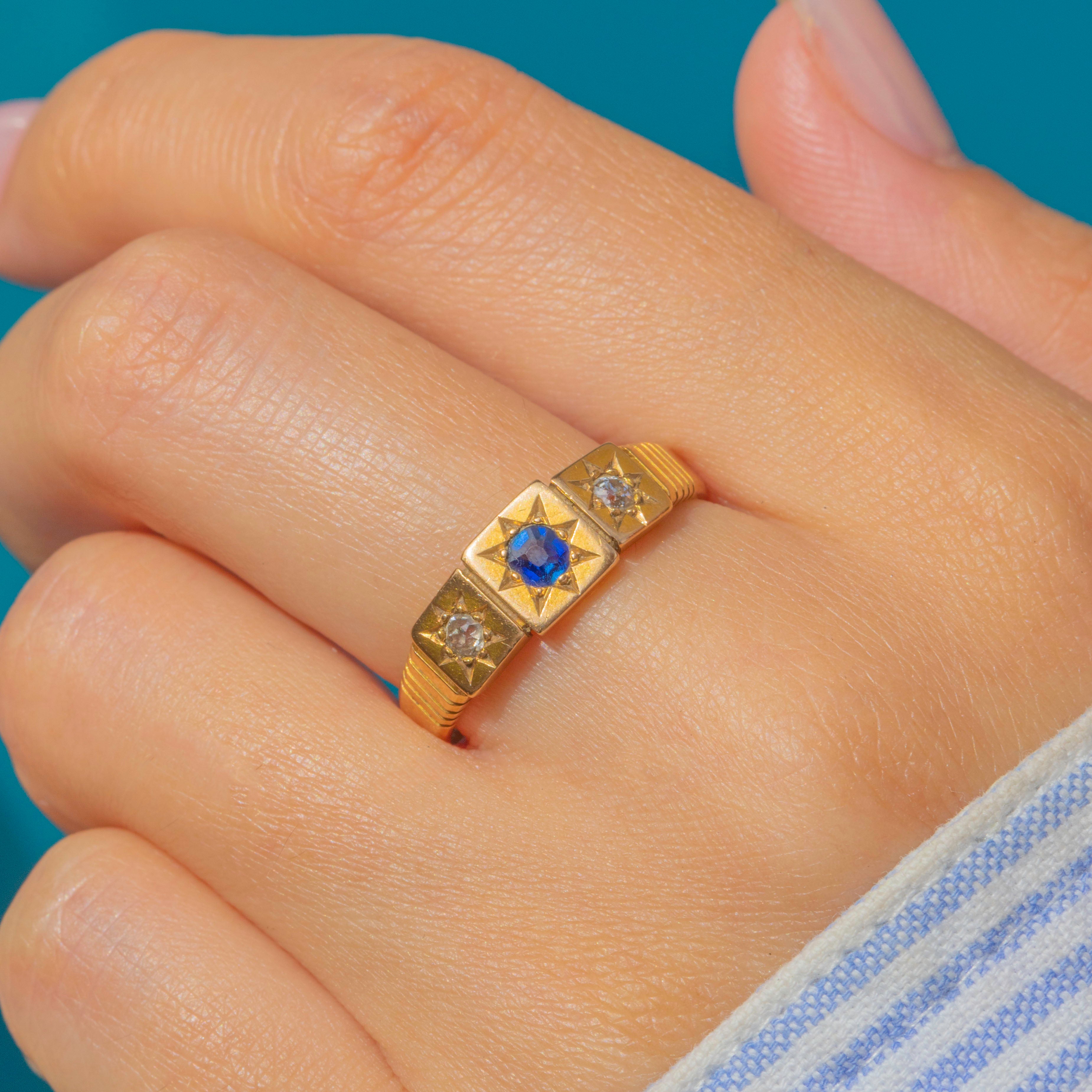 A superb antique Victorian gypsy ring in solid 18ct Gold, star-set with a vivid blue Sapphire and two sparkling Diamonds. Each stone is set within a crisp hand-engraved 8-pointed star, catching the light beautifully.