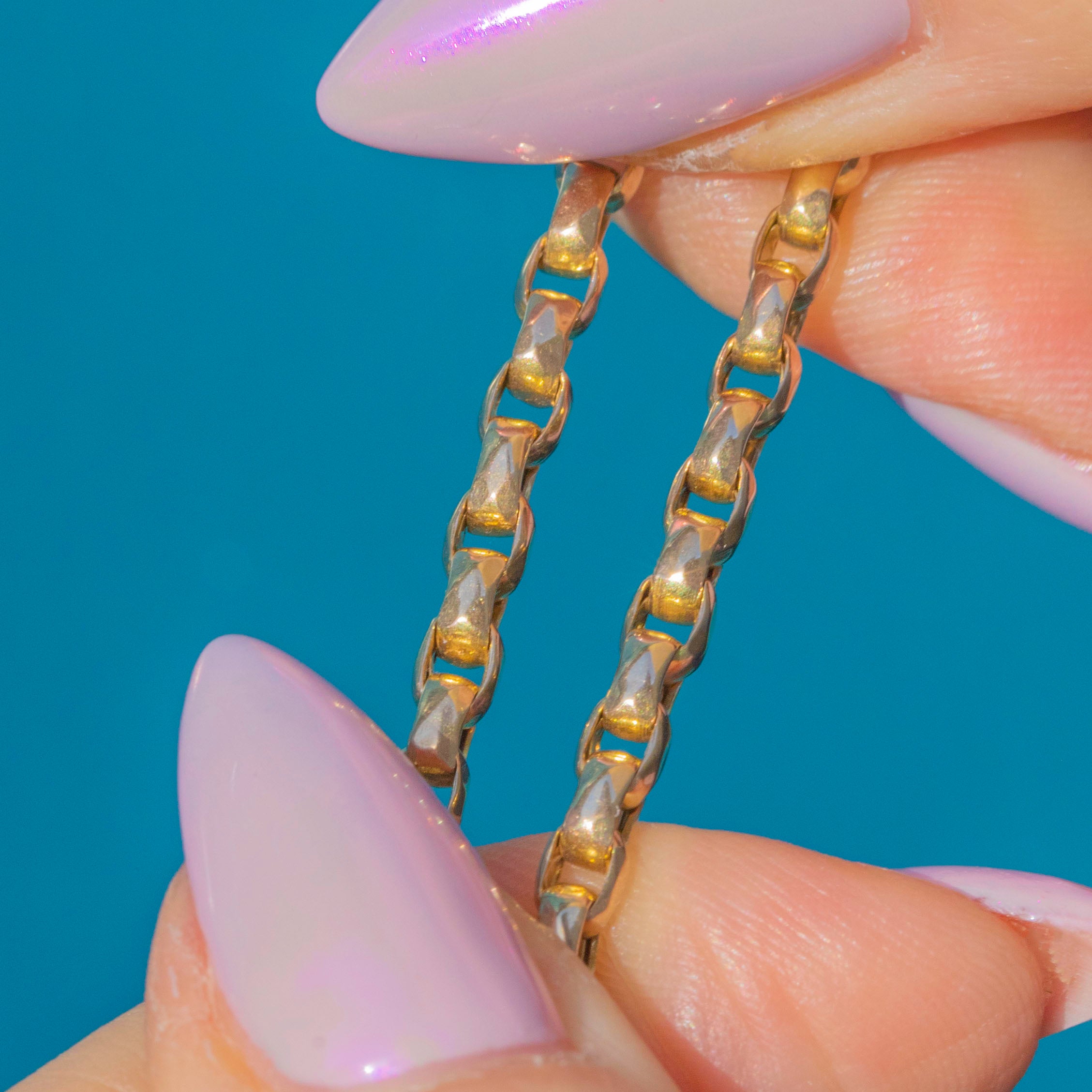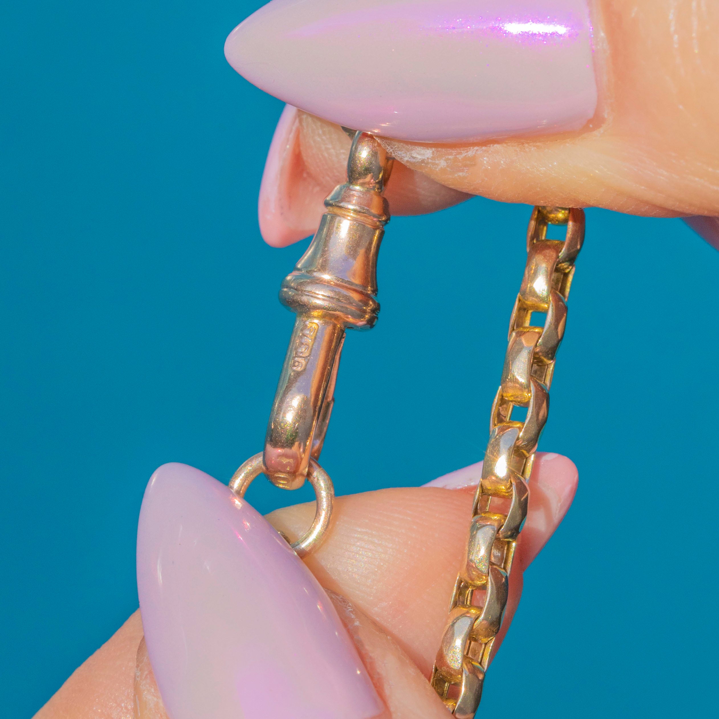 This beautiful Victorian chain is a timeless staple — a solid 9ct Gold antique with wonderful weight and craftsmanship. The faceted fancy links catch the light beautifully, alternating between soft yellow and faint rose tones typical of the era. It’s finished with a sturdy dog clip clasp, making it both decorative and practical for attaching pendants, lockets or fobs.