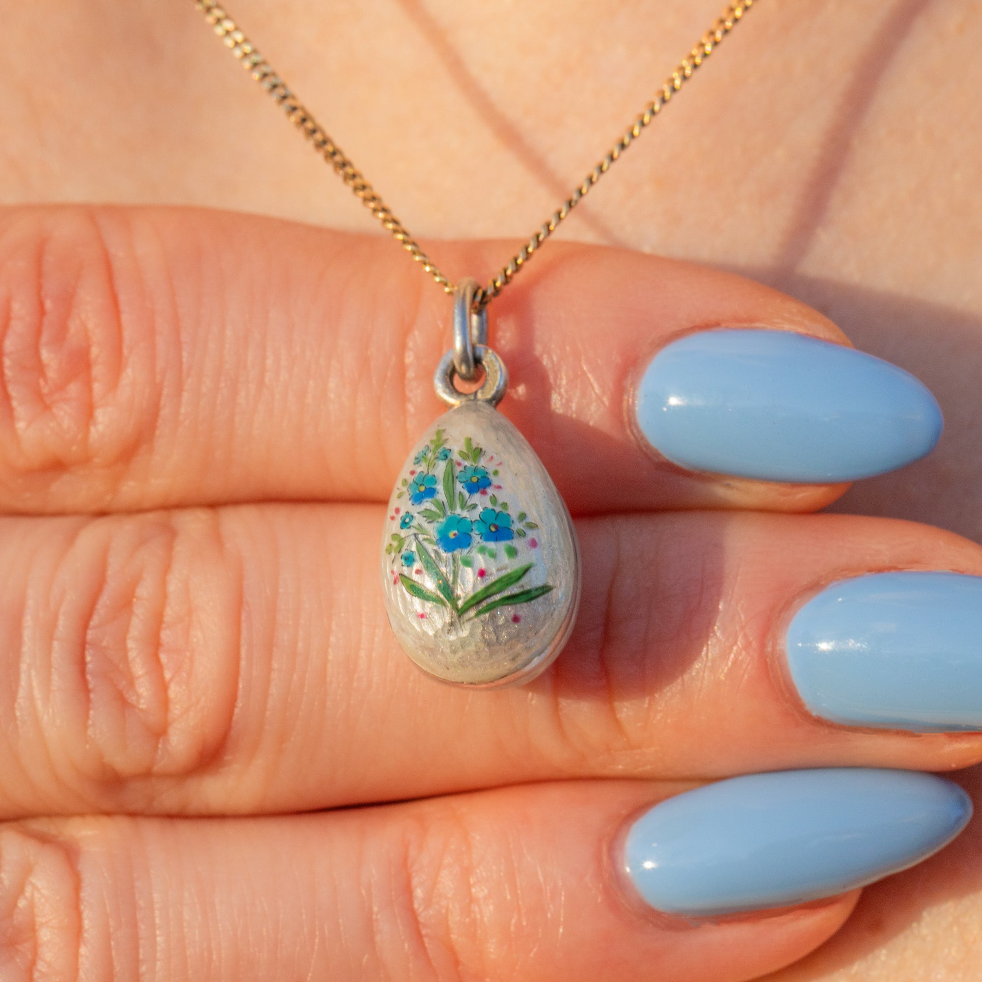A splendid antique Soviet era white Enamel egg pendant, complete with a striking forget-me-not motif! Crafted from Sterling Silver and inlaid with the most gorgeous shimmering white Enamel, this rare authentic antique Faberge style egg is sure to set your jewellery collection apart from the crowd.
