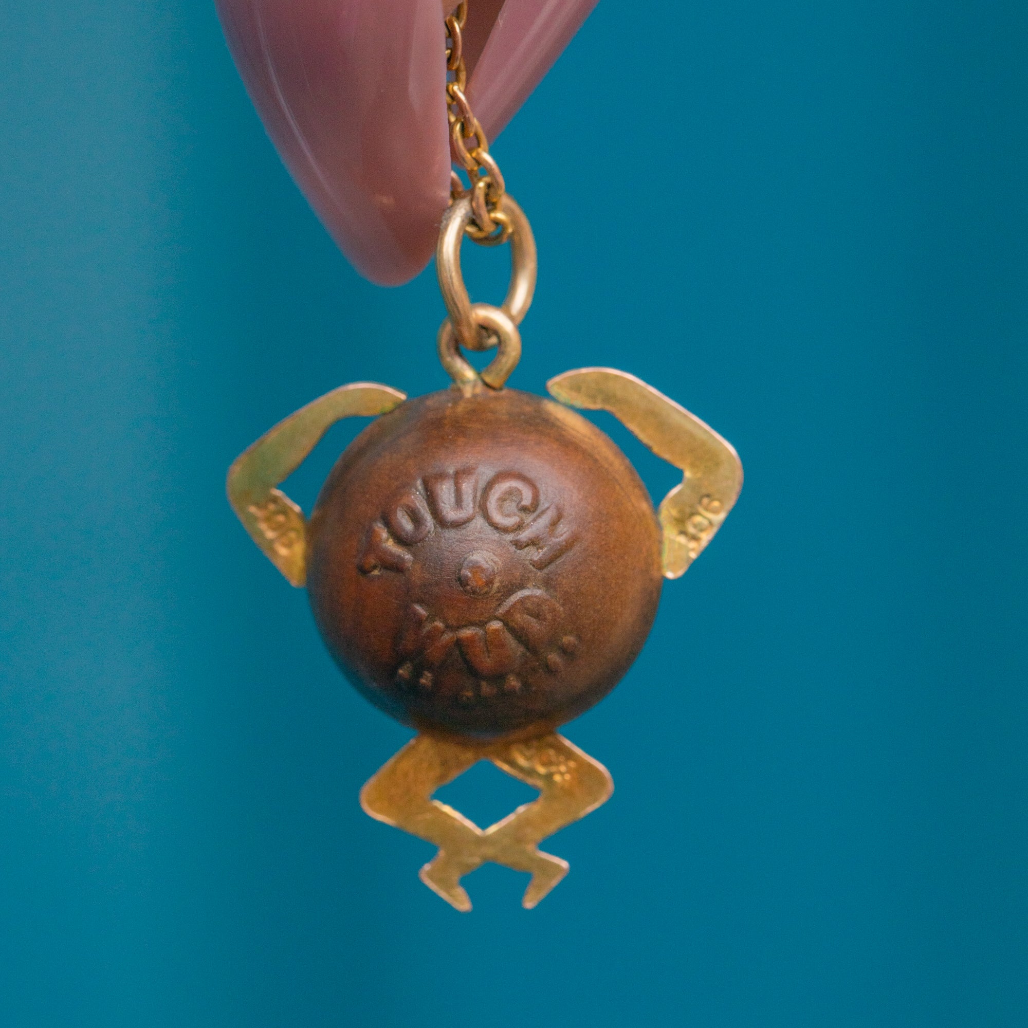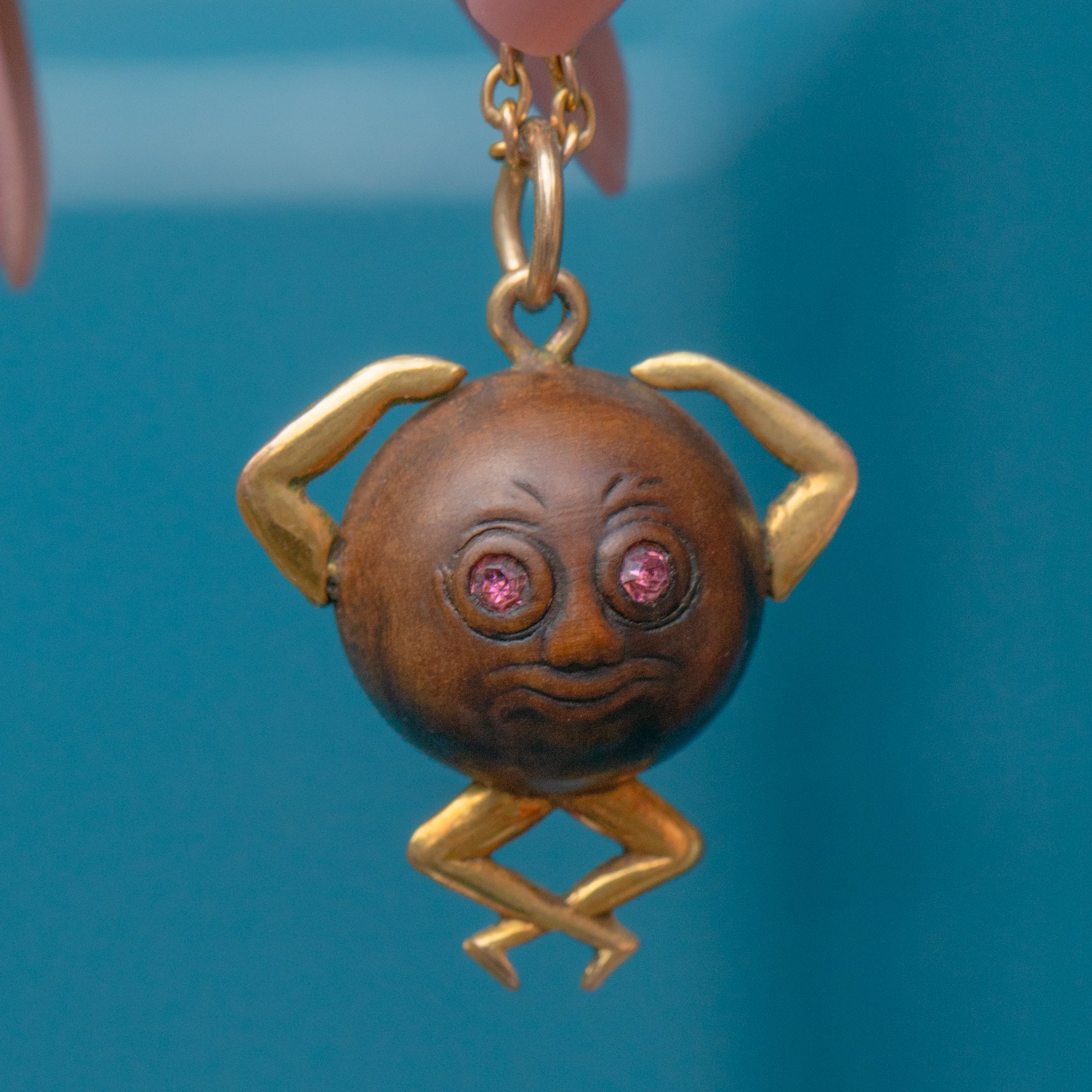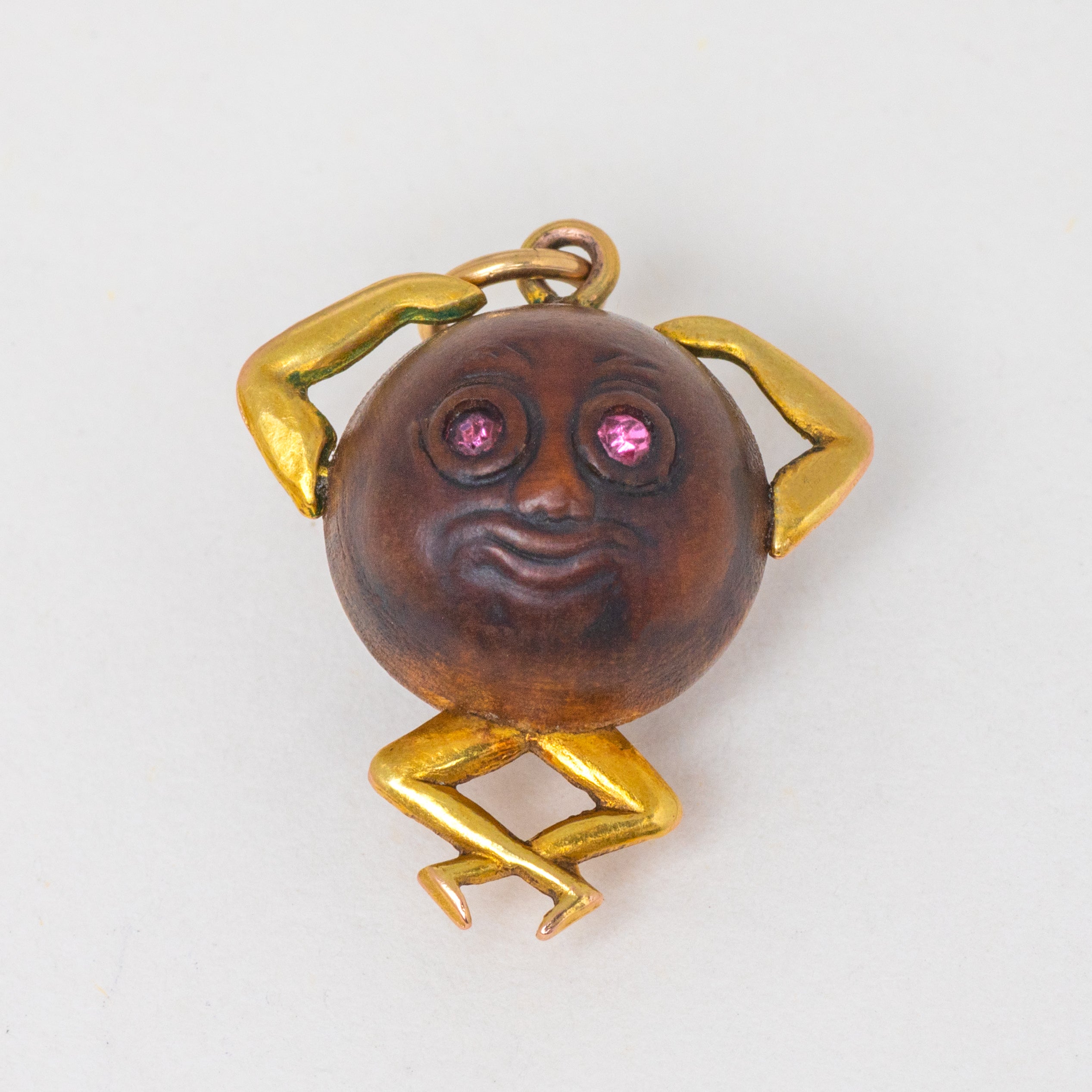 The unique design of this 20th-century pendant is crafted predominantly from a bead of wood, formed into a body with 9ct Gold arms and legs. With pink Paste eyes to finish, the twinkle in the eye of this Touch Wud charm is enough to win you over!