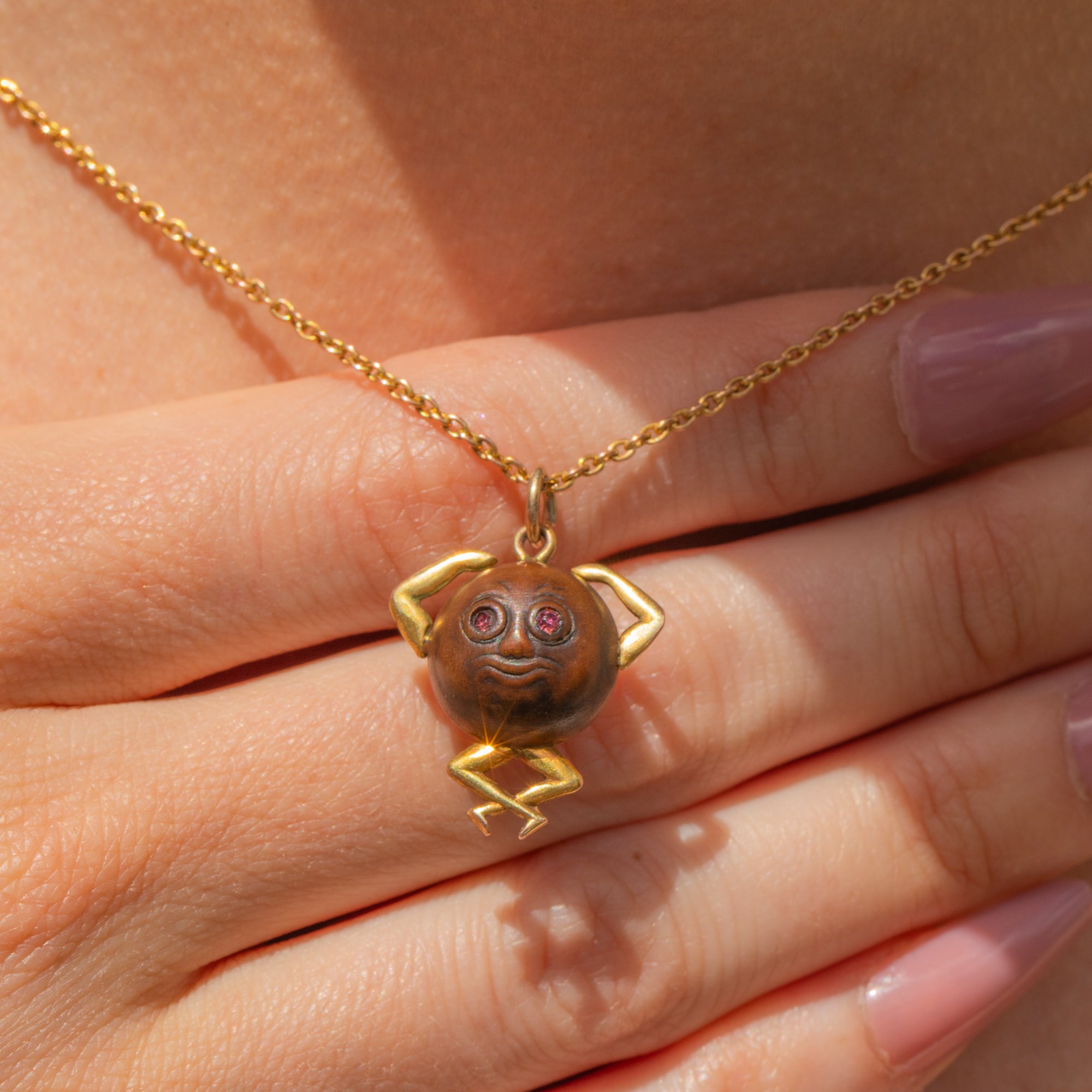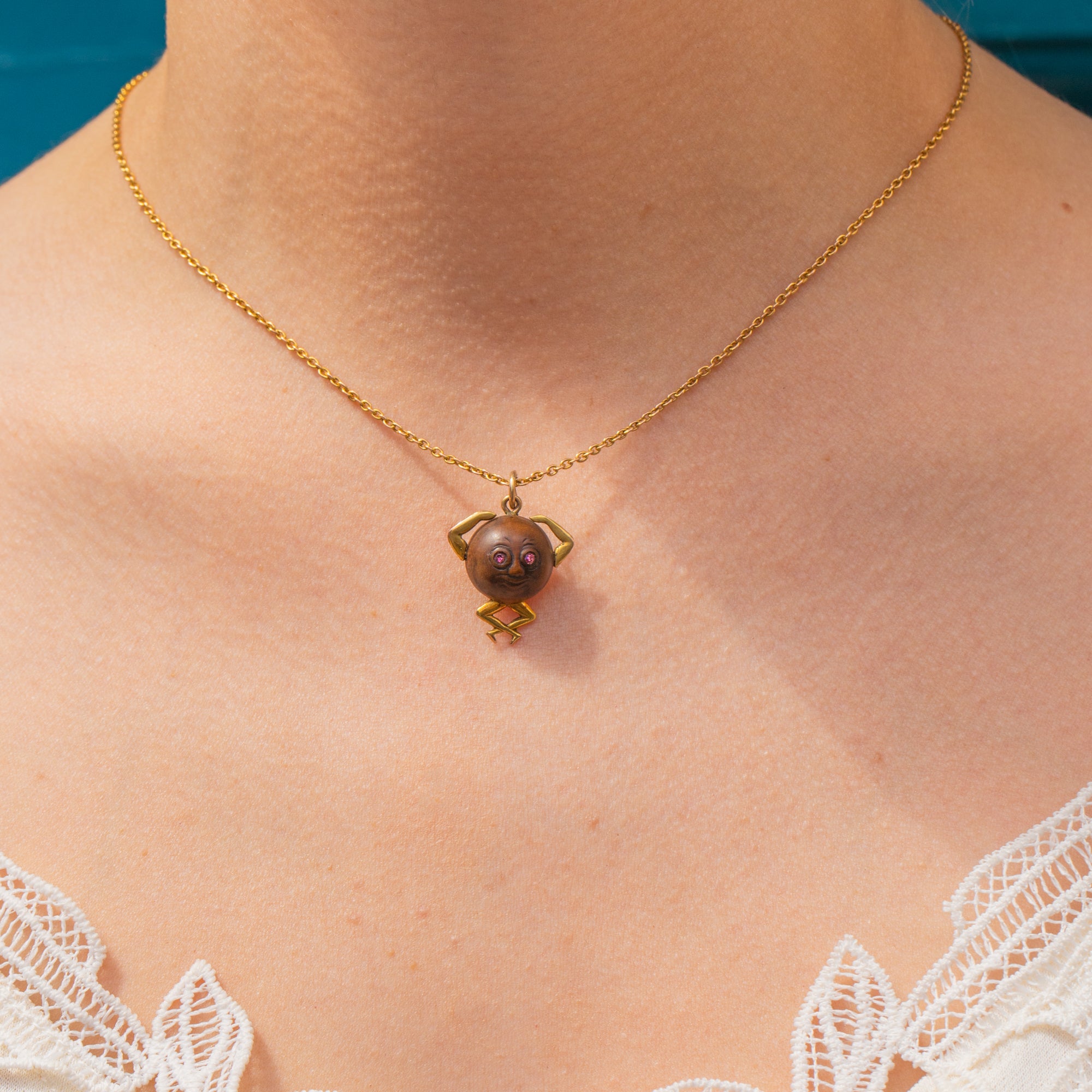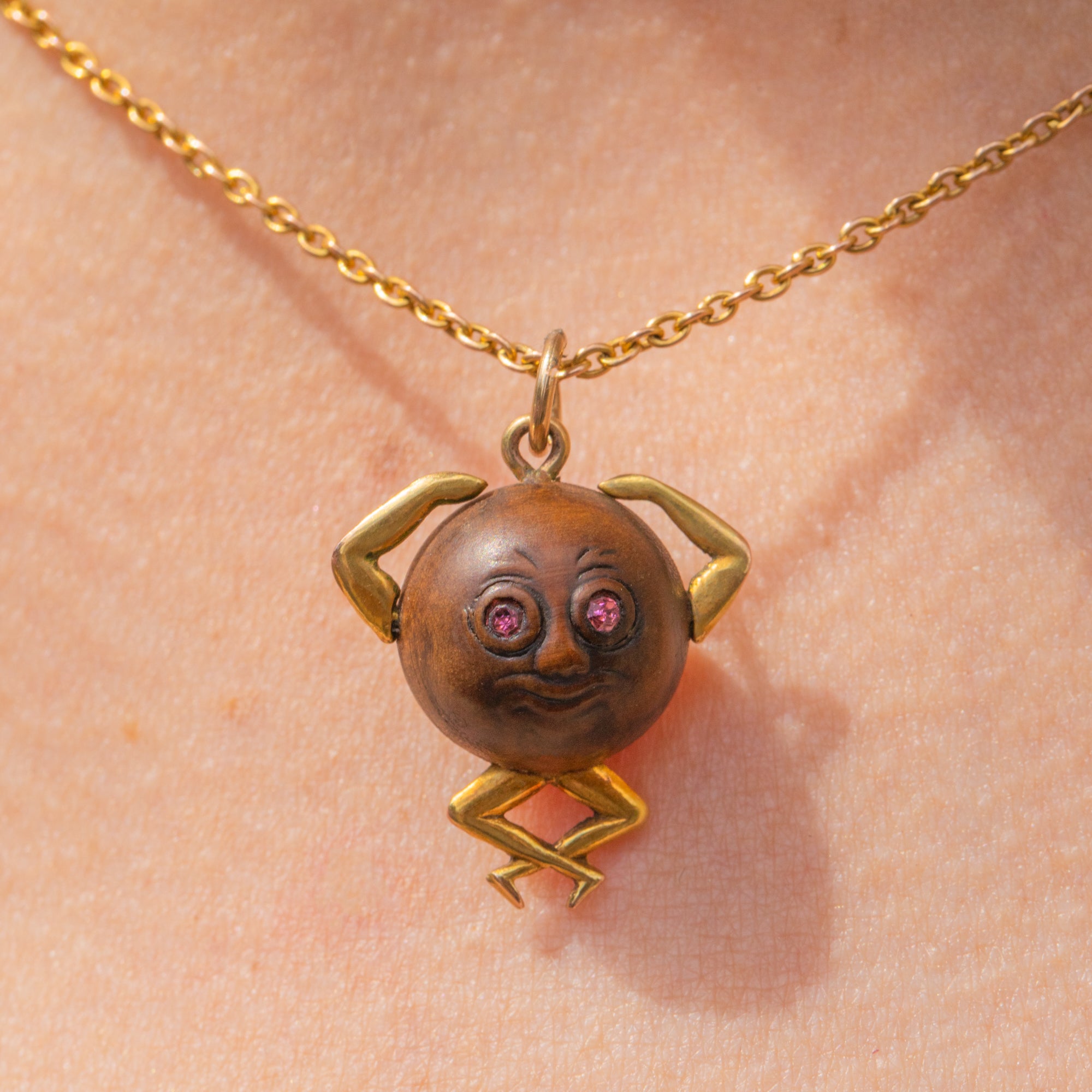 The unique design of this 20th-century pendant is crafted predominantly from a bead of wood, formed into a body with 9ct Gold arms and legs. With pink Paste eyes to finish, the twinkle in the eye of this Touch Wud charm is enough to win you over!