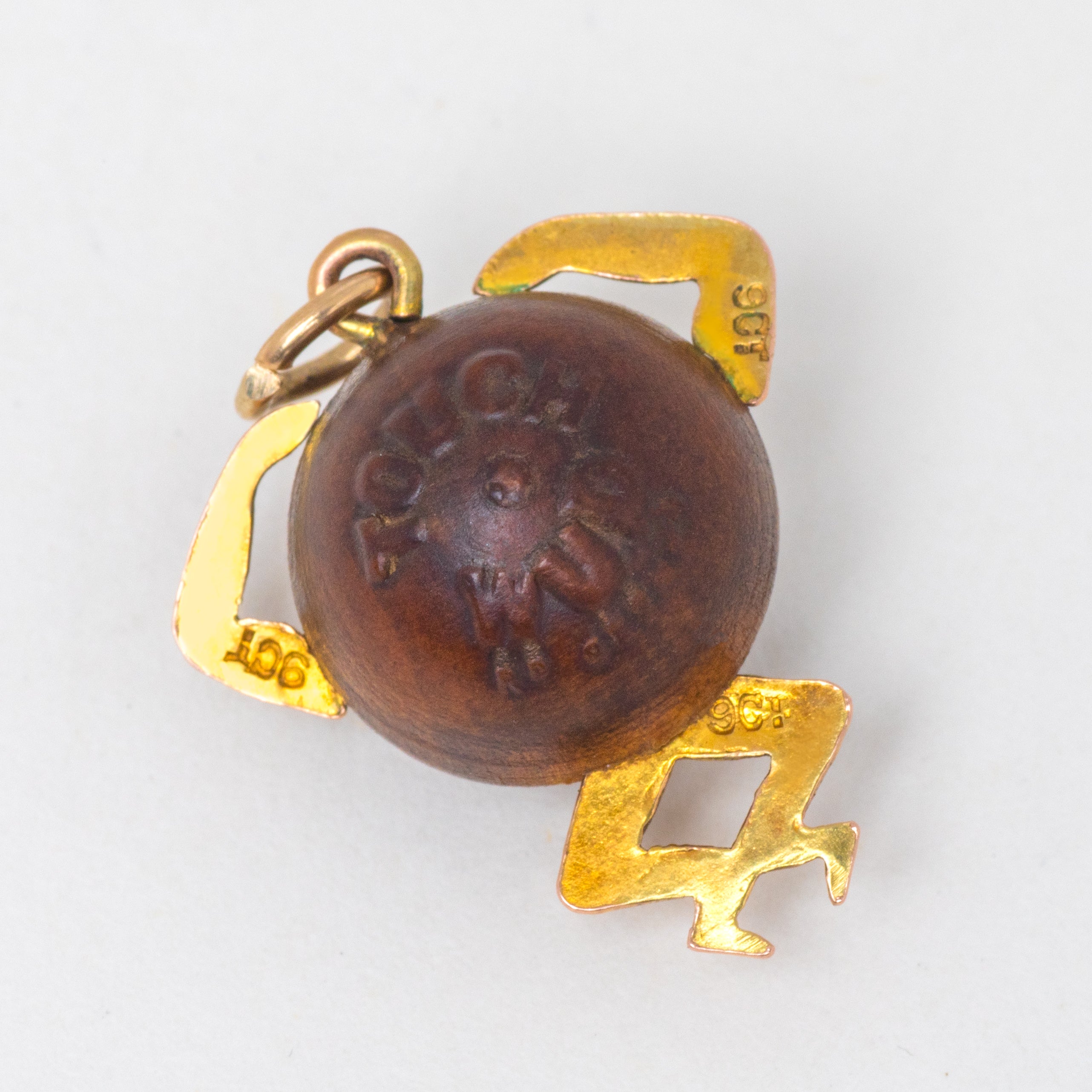 EXCELLENT. Especially when considering her grand age and history, this antique WW1 Touch Wud lucky charm is in excellent condition. Each component is securely connected and the Gold has a lovely buttery hue. The wood is perfectly spherical with no damage to note. With a jump-ring to finish, if you were on the hunt for a new lucky charm this Edwardian pendant could be the one for you!
