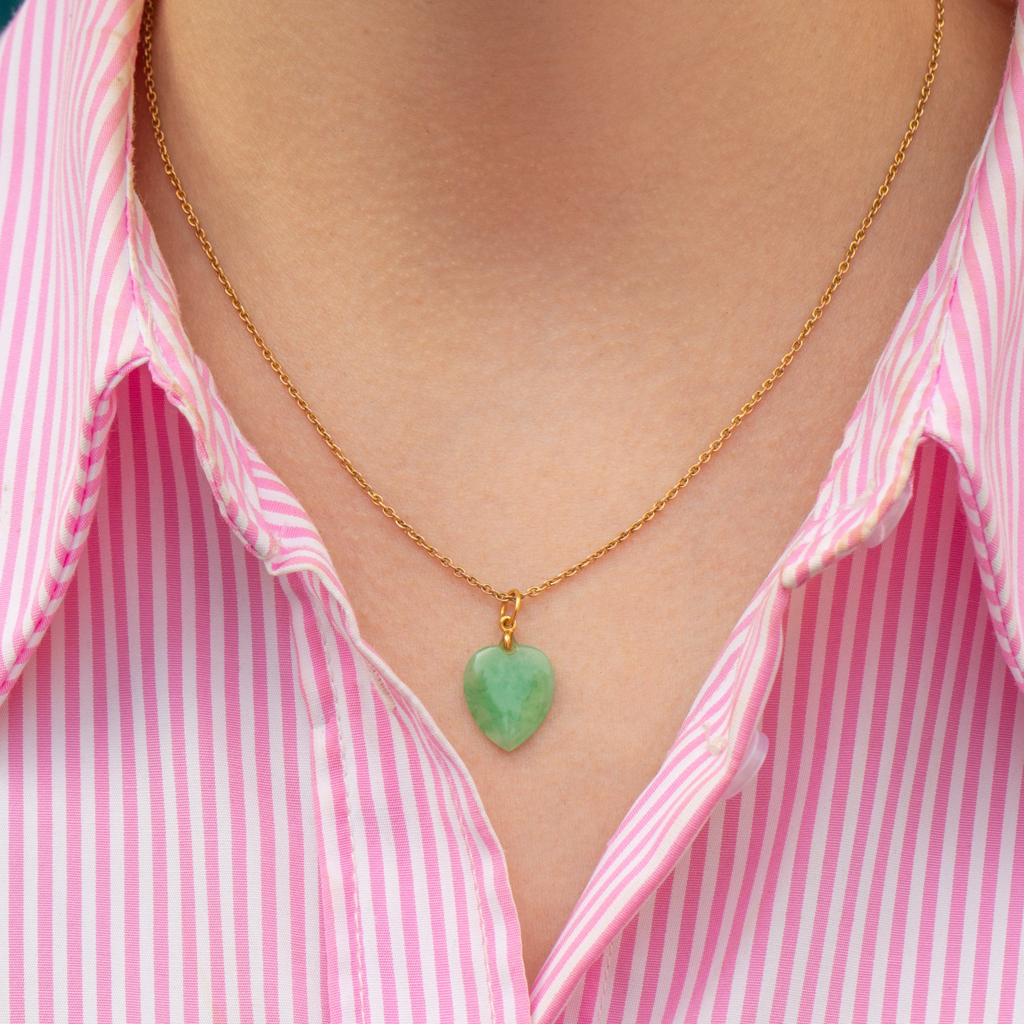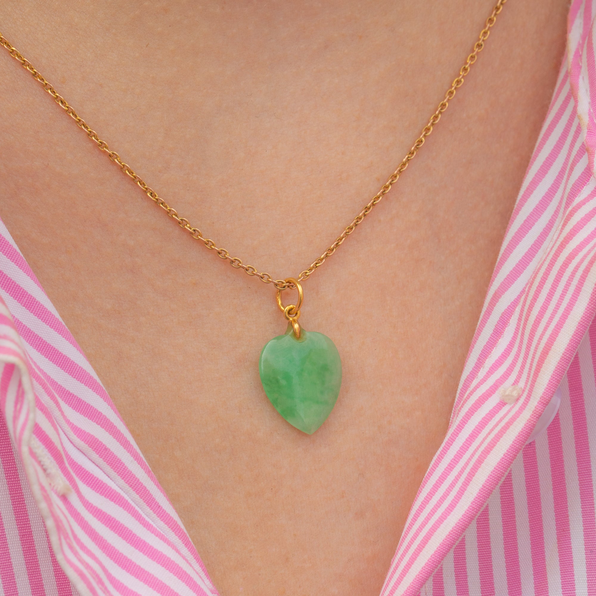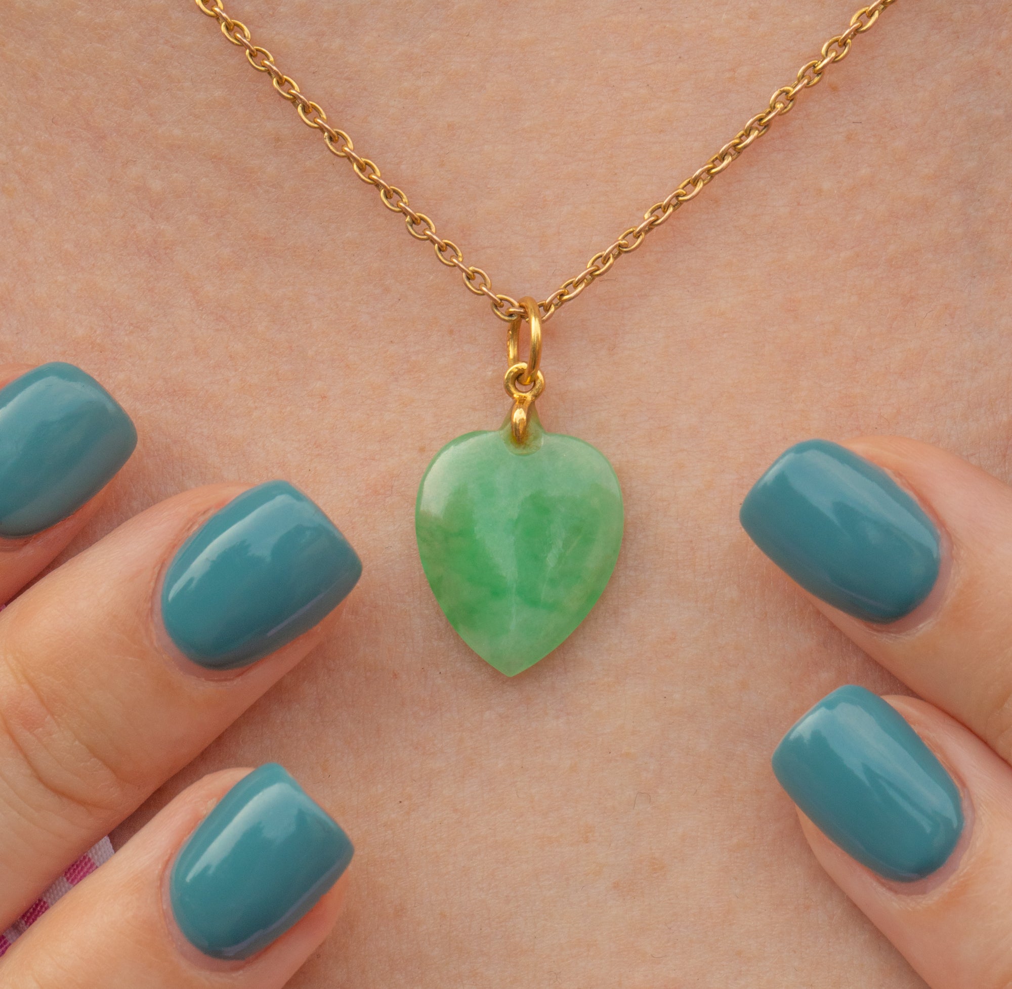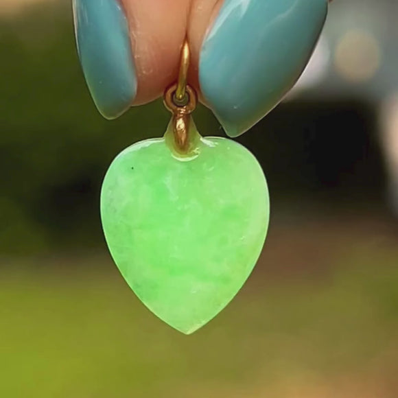 This Art Deco 14ct Gold Jade heart charm will add a wonderful pop of colour to your outfit! Exquisitely hand-cut, the smooth Jade heart boasts a vibrant dappled spring-green hue perfectly complimented by luxurious 14ct Gold.