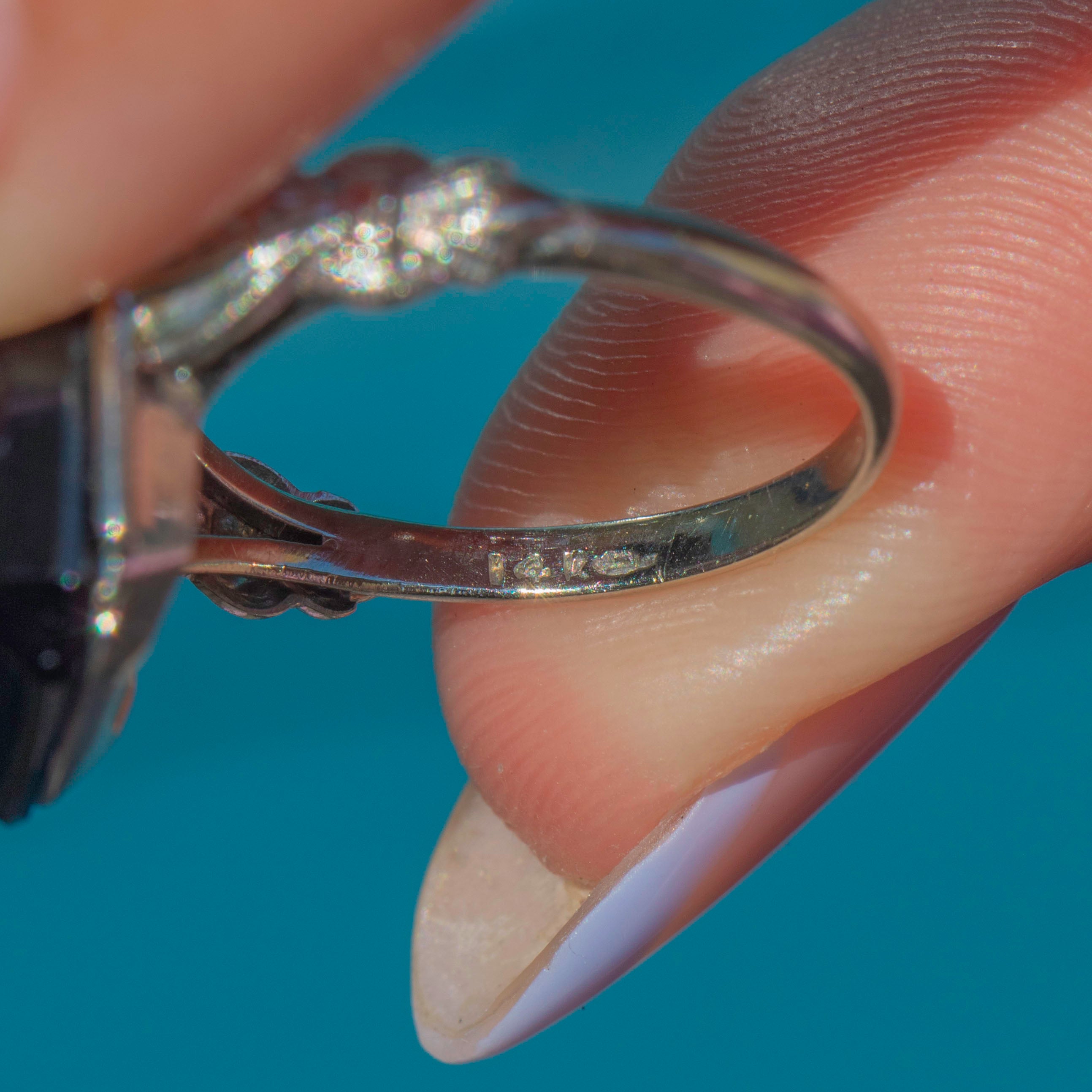The boldly faceted Onyx is flanked by intricately engraved shoulders, boasting delicate geometric details. The craftsmanship of this Art Deco ring is truly exceptional and perfectly captures the opulence of the era. If you have a penchant for outstanding jewels, this antique Onyx Diamond ring is a must for your collection!