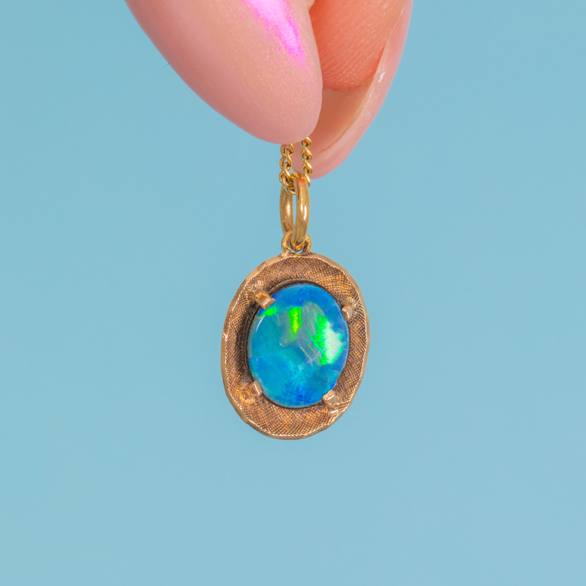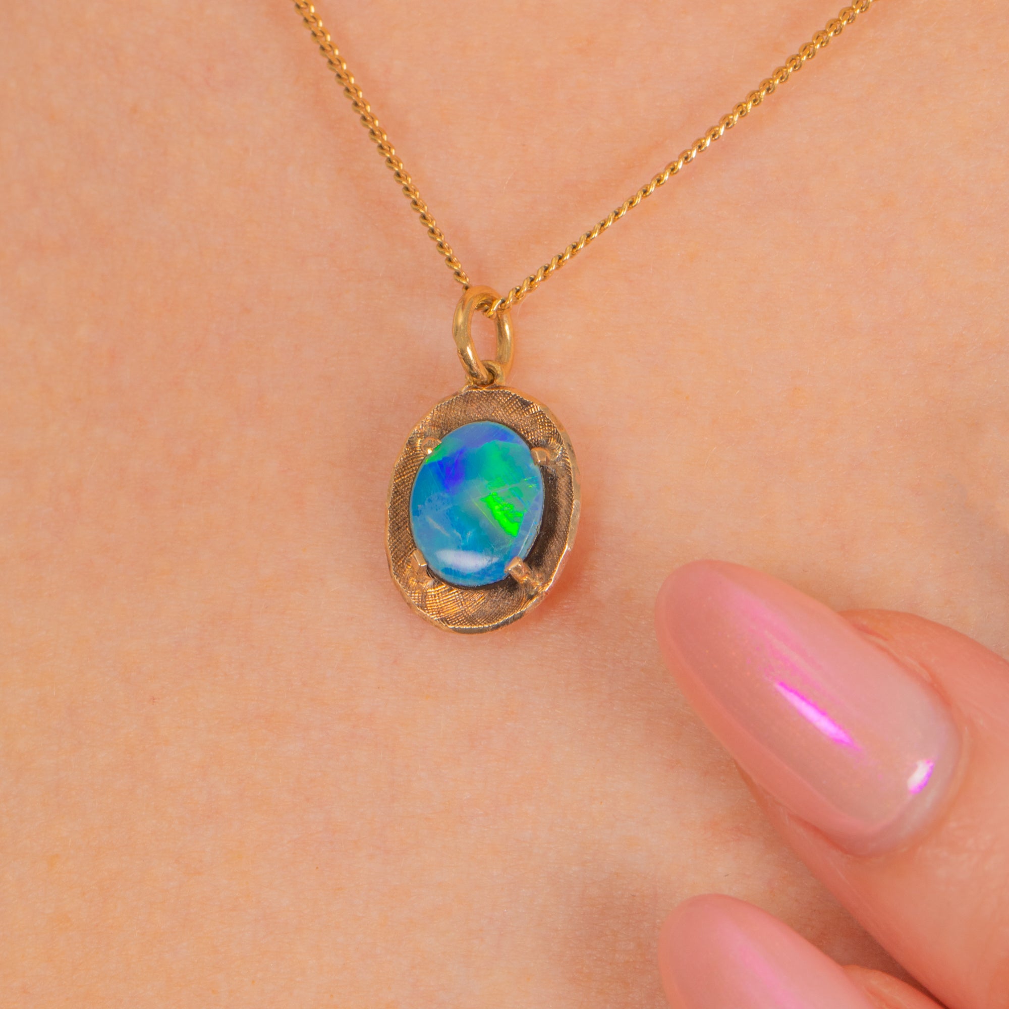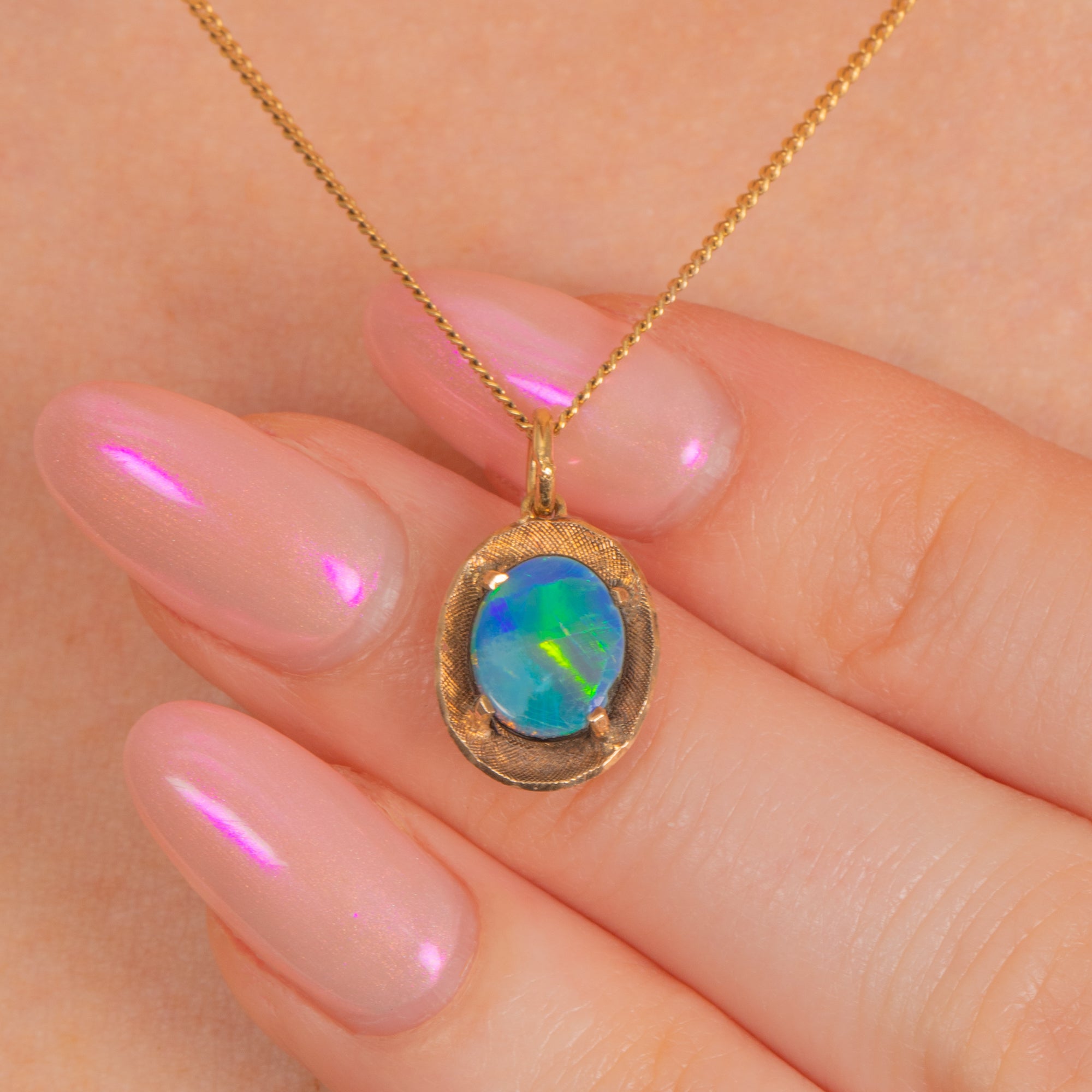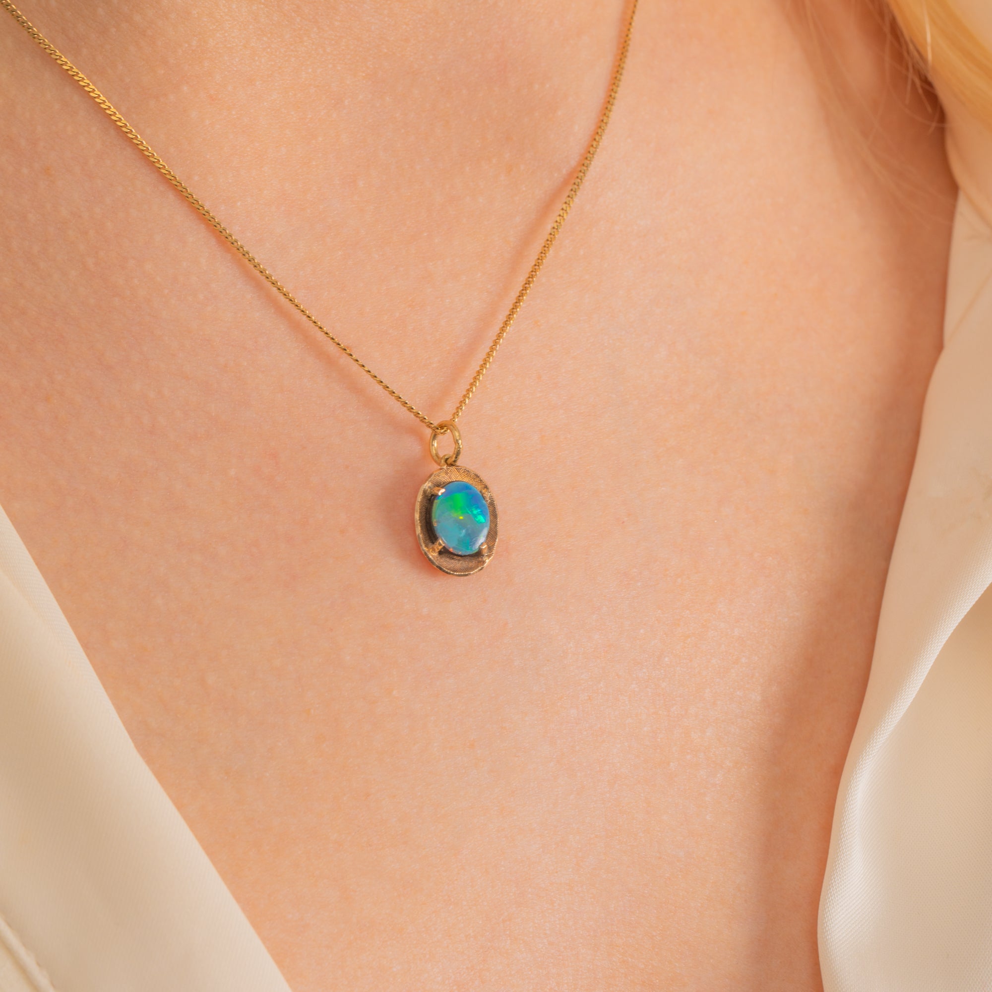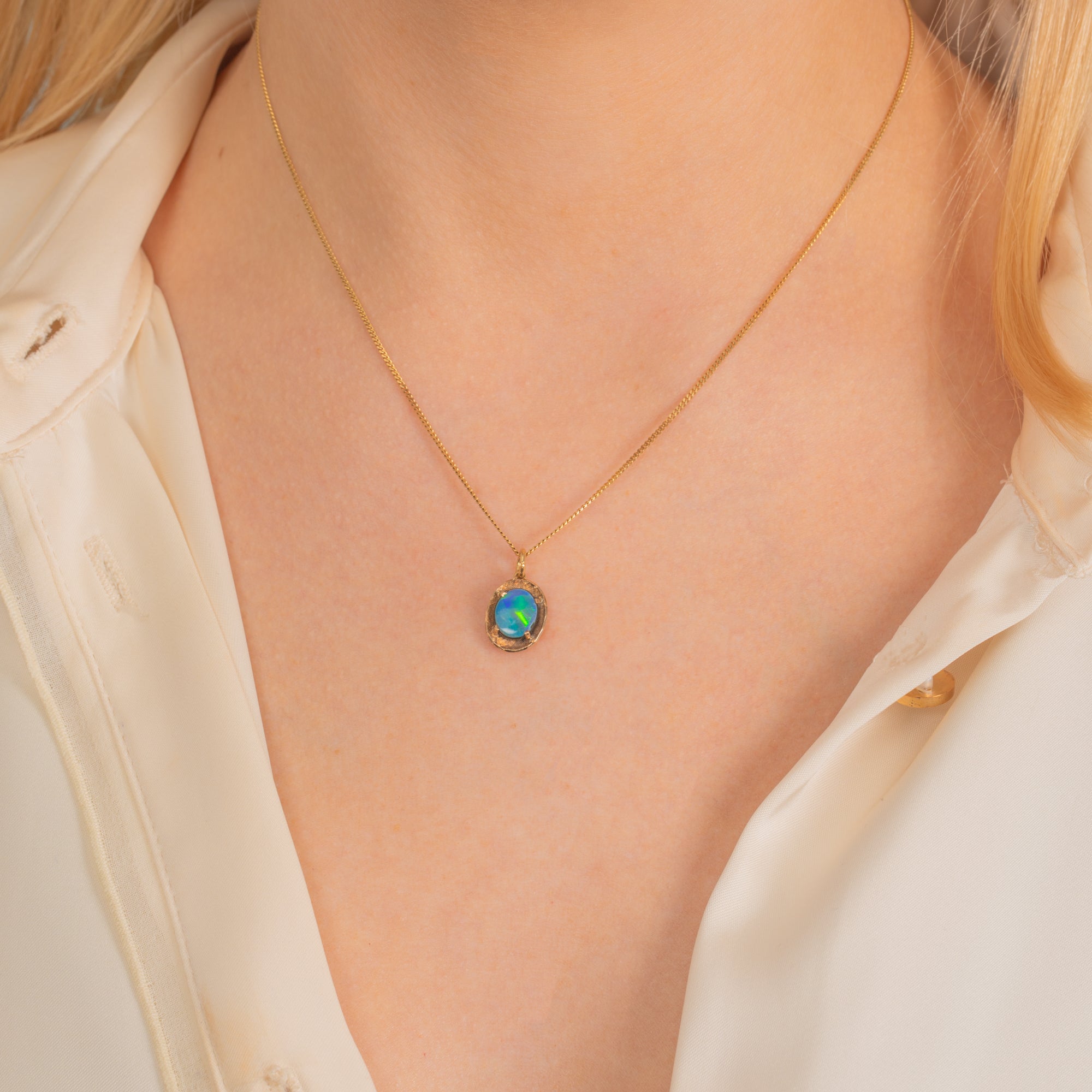 It's difficult not to fall in love with this Opal's wonderful play of colour, with its deep cerulean centre showcasing superb galactic flashes of vibrant green and blue, securely held by her 14ct Gold bezel setting. Suspended from a fine chain, she is the perfect piece for everyday wear.