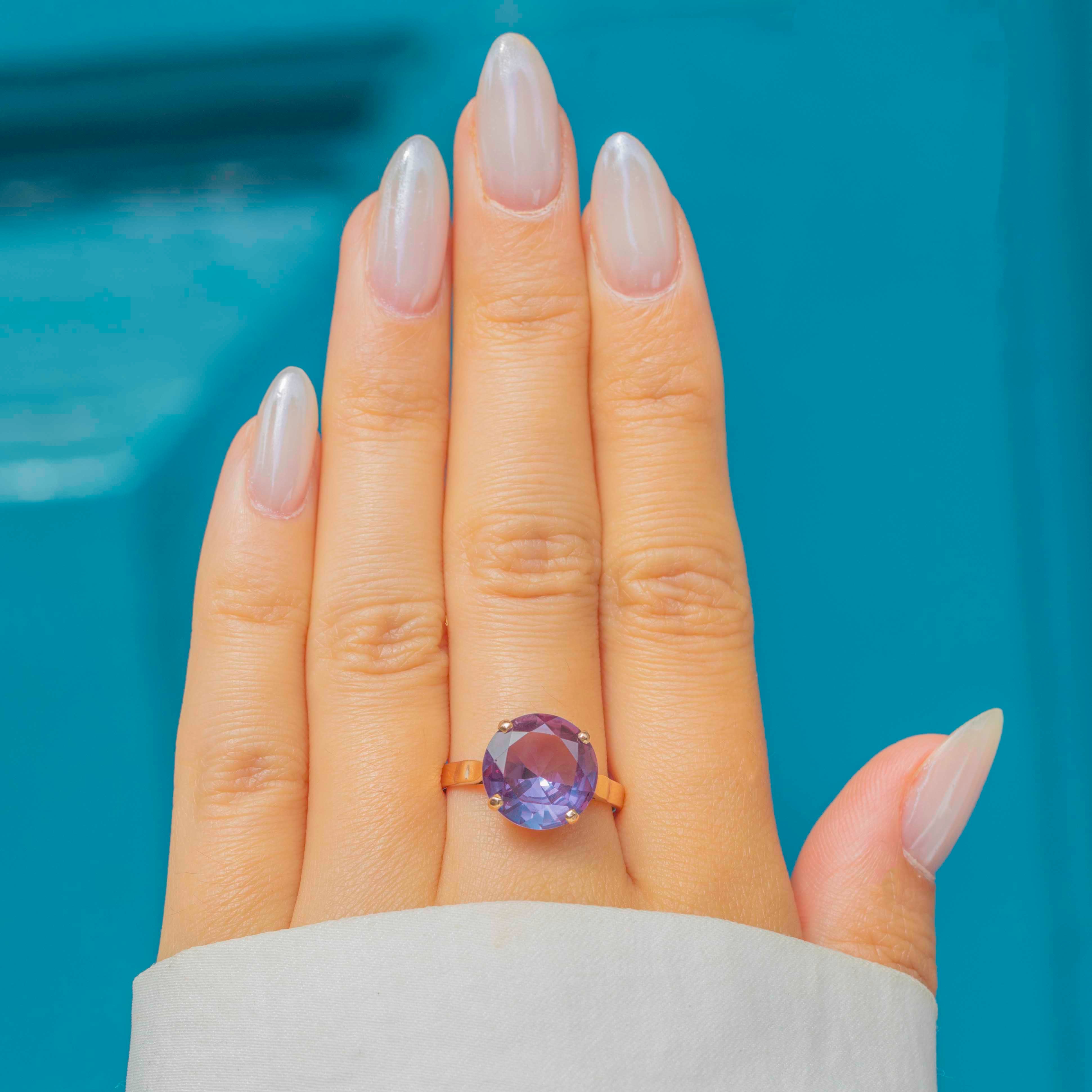 A striking Egyptian Art Deco ring, boasting an impressive 1.63ct colour-changing Sapphire with vivid violet hues that ooze from each one of her perfectly cut geometric facets, twinkling beneath the light.