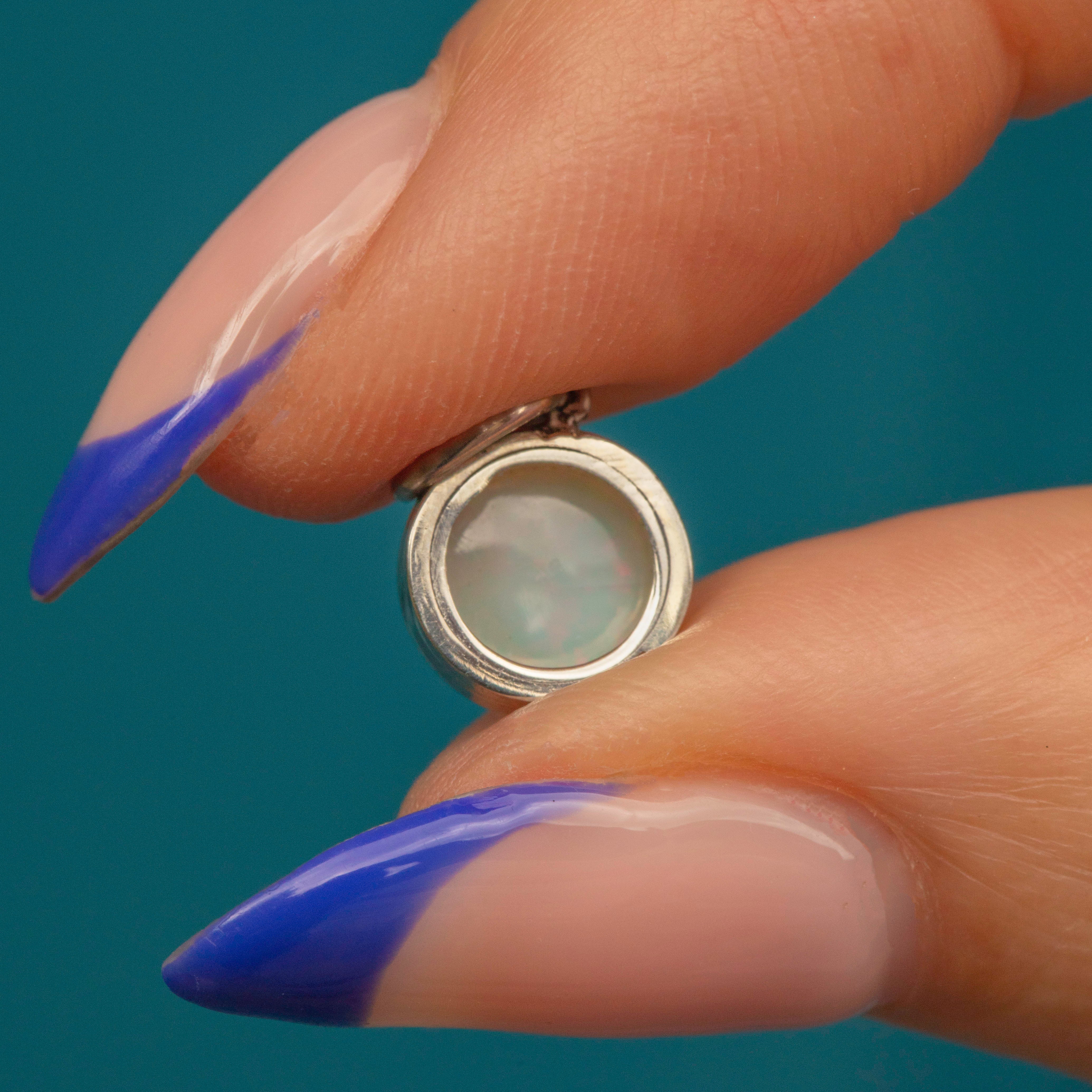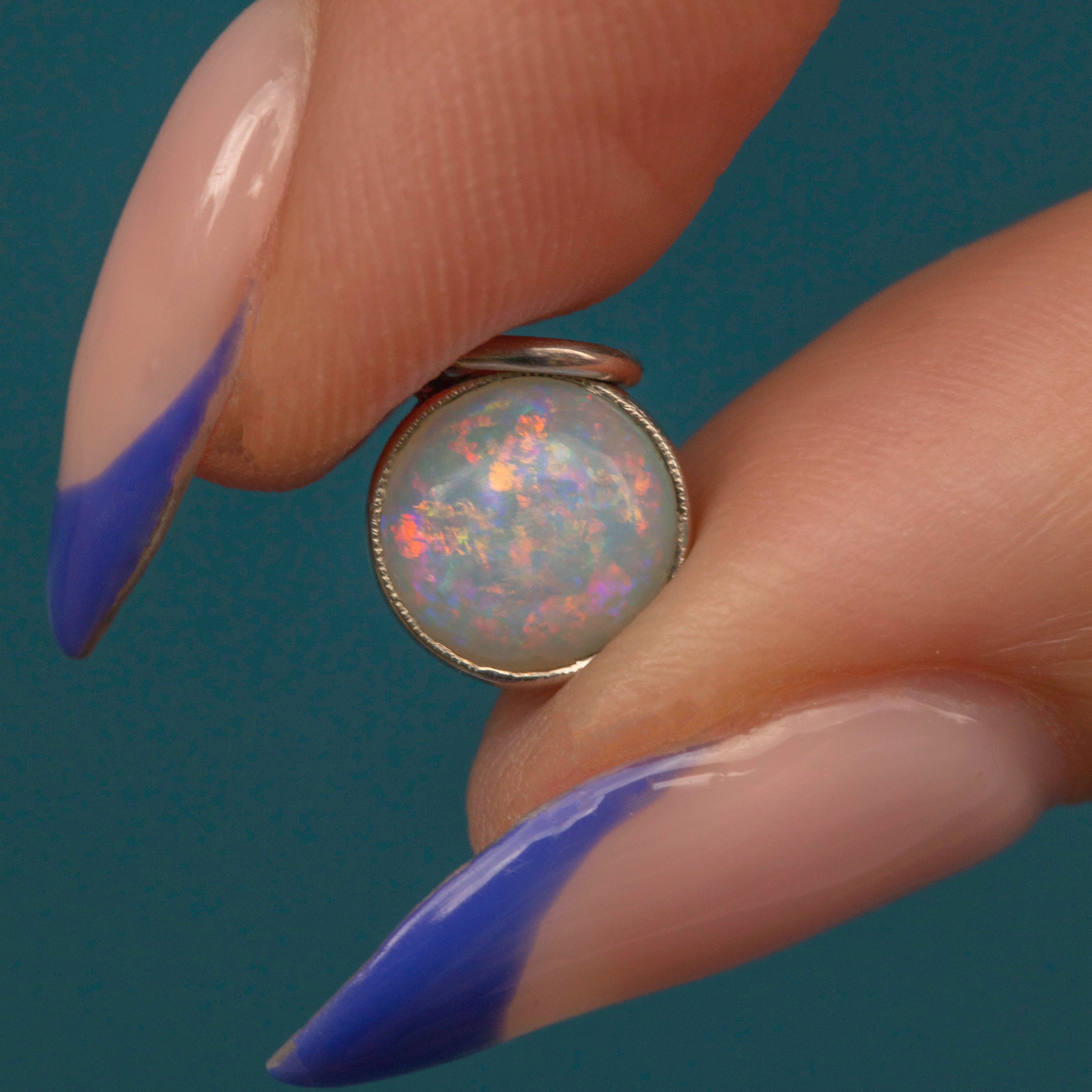 VERY GOOD-EXCELLENT. This Art Deco 14ct white Gold Opal charm is in wonderful condition! The Opal sits securely, with a fiery play of colour and no damage to note. Having been converted from a stick pink into a very wearable charm, this is subtle remanence of this at the back, but this does not affect her structural integrity. A perfect pick for lovers of a pastel colour palette!