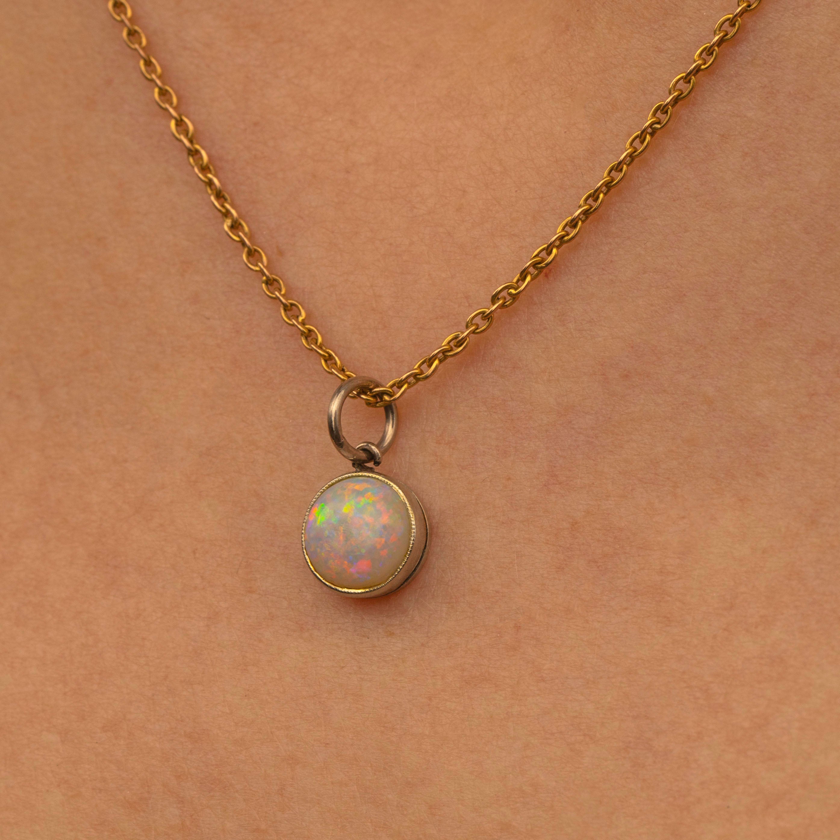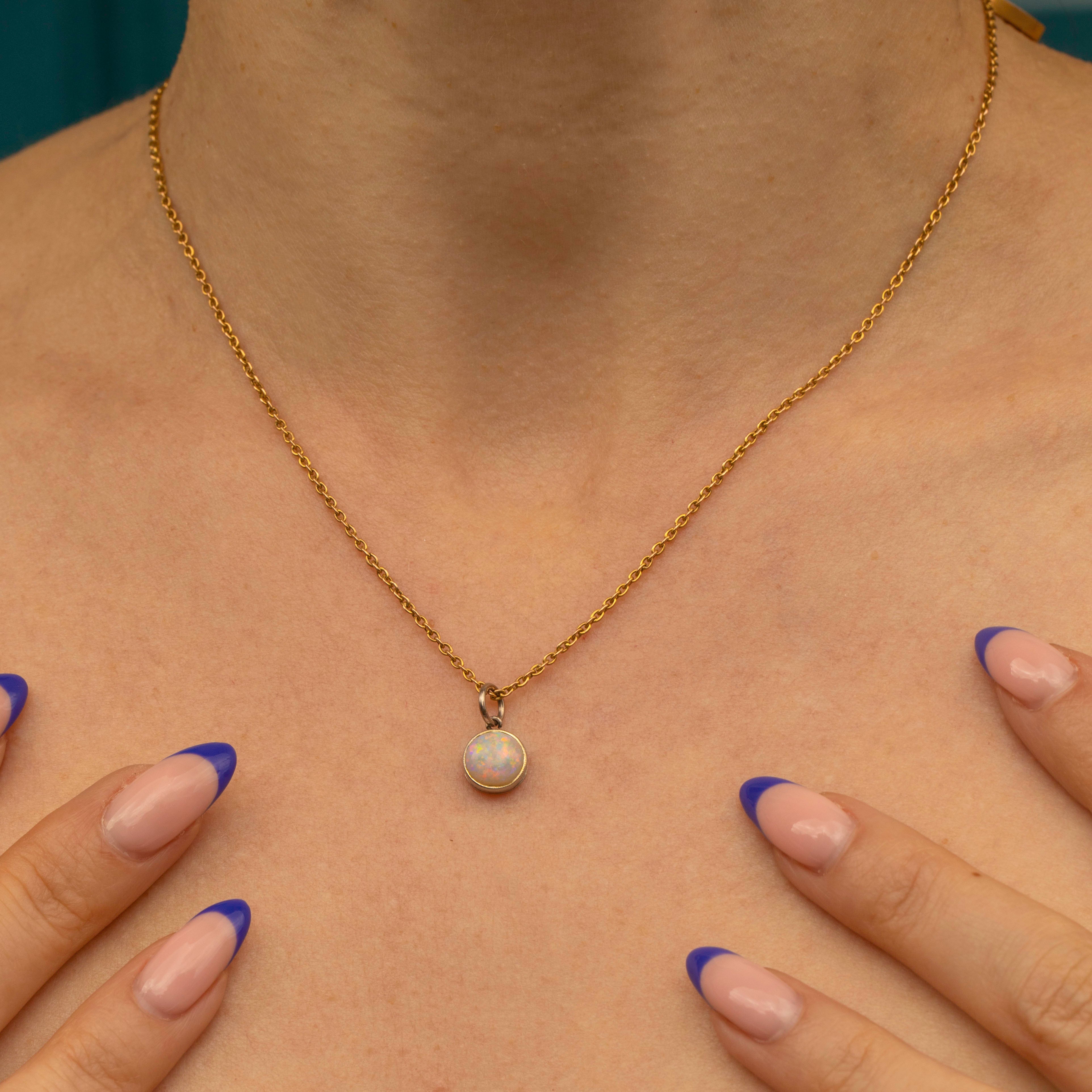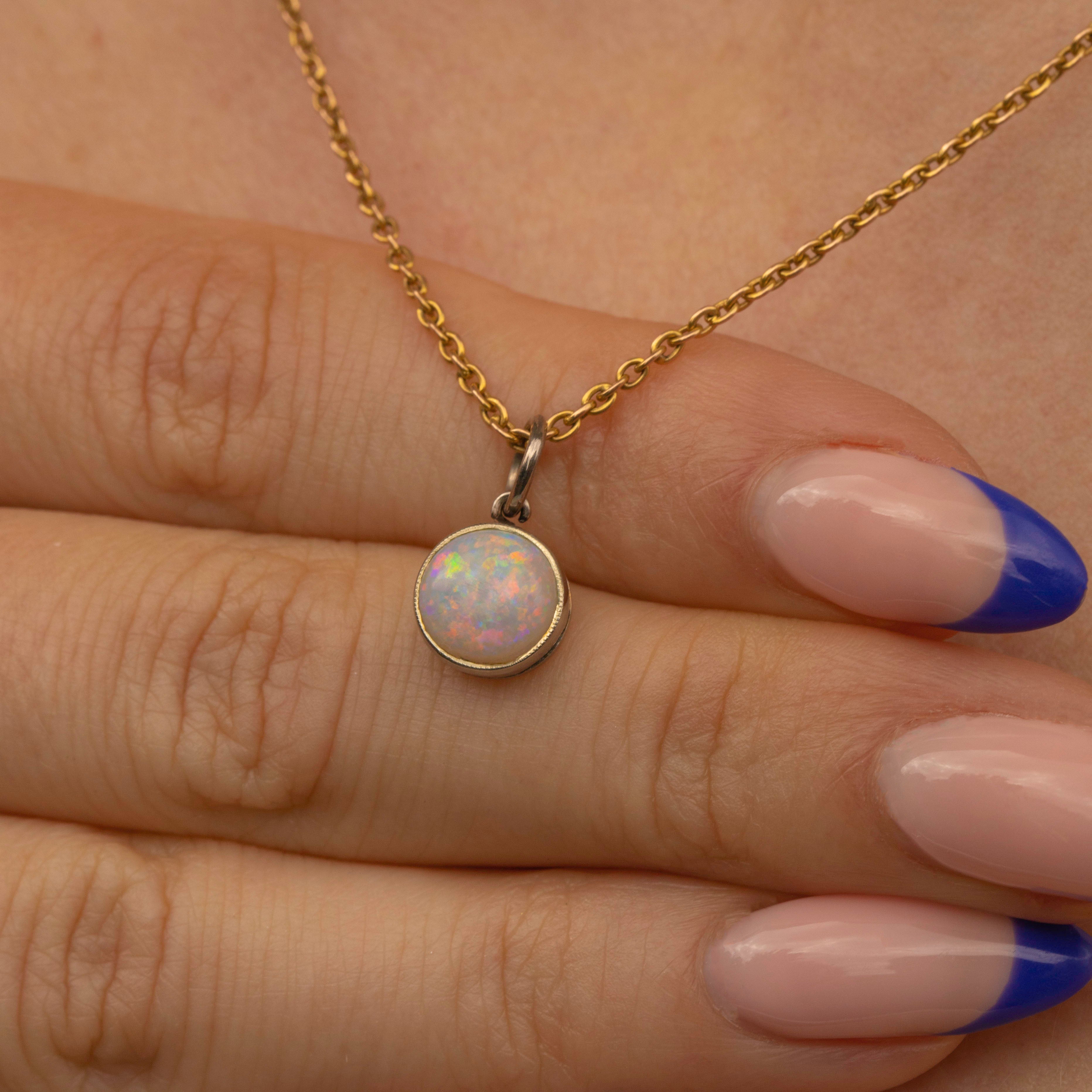 Embraced by a lustrous 14ct white Gold bezel setting, this Gold Opal charm brings elegance and sophistication. Dainty in size but packing a serious punch, this Art Deco pendant will nestle amongst your other Gold goodies seamlessly.