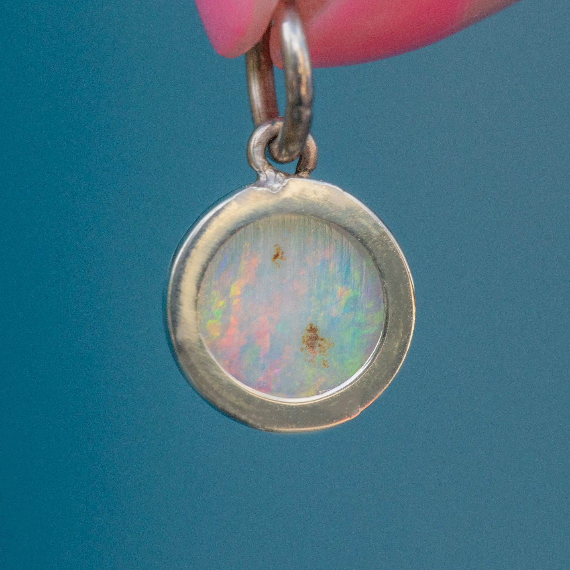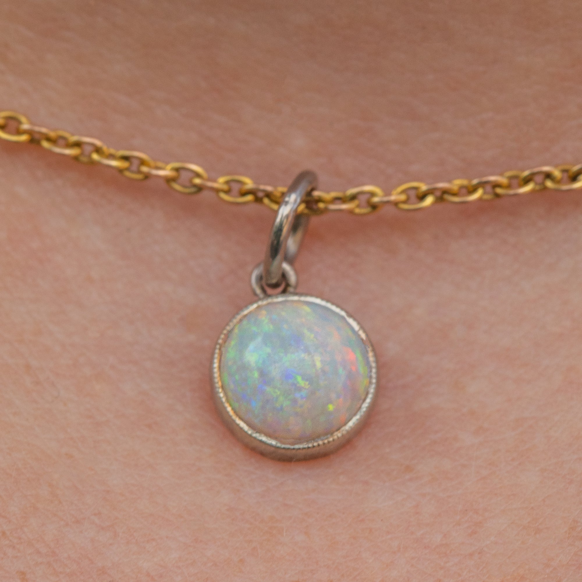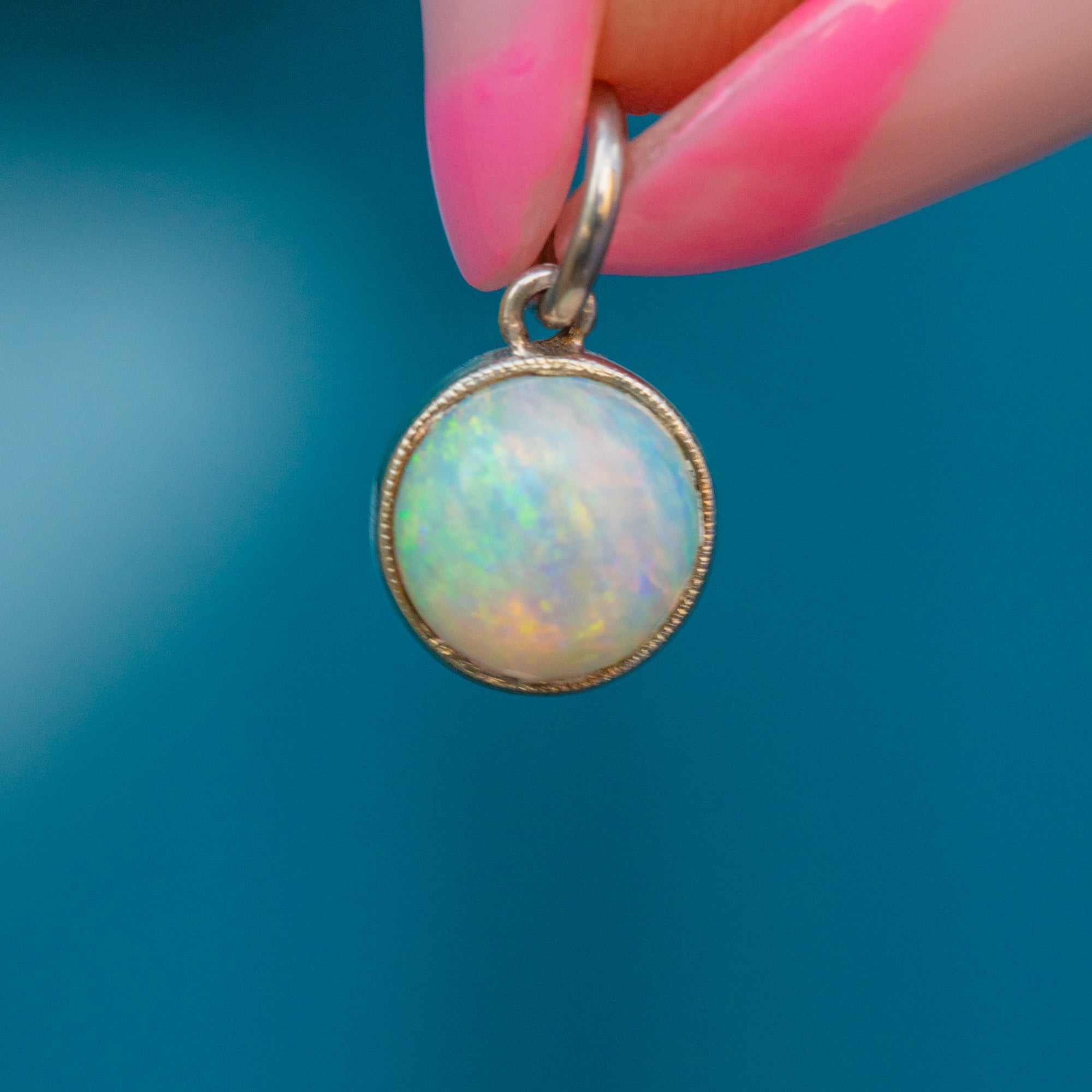This Art Deco 14ct white Gold Opal charm is the sweetest thing! Her Opal cabochon is vibrant, with a firework display of greens and pinks that come to life beneath the light.