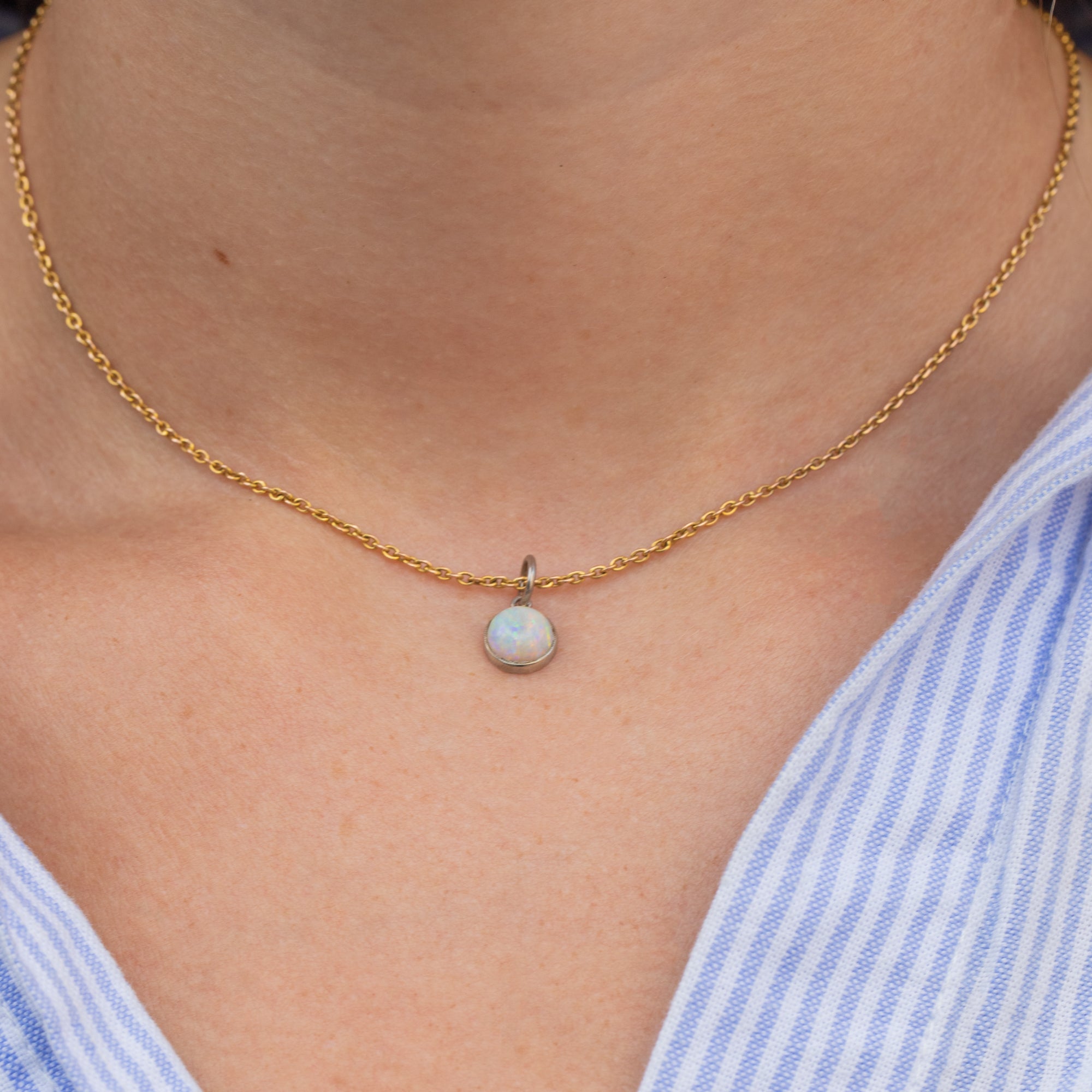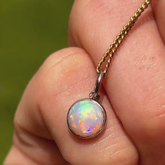 The lustrous 14ct white Gold bezel setting adds a luxurious finish to this Art Deco pendant and holds the Opal securely in place. The perfect pick to add a touch of antique charm to any outfit!