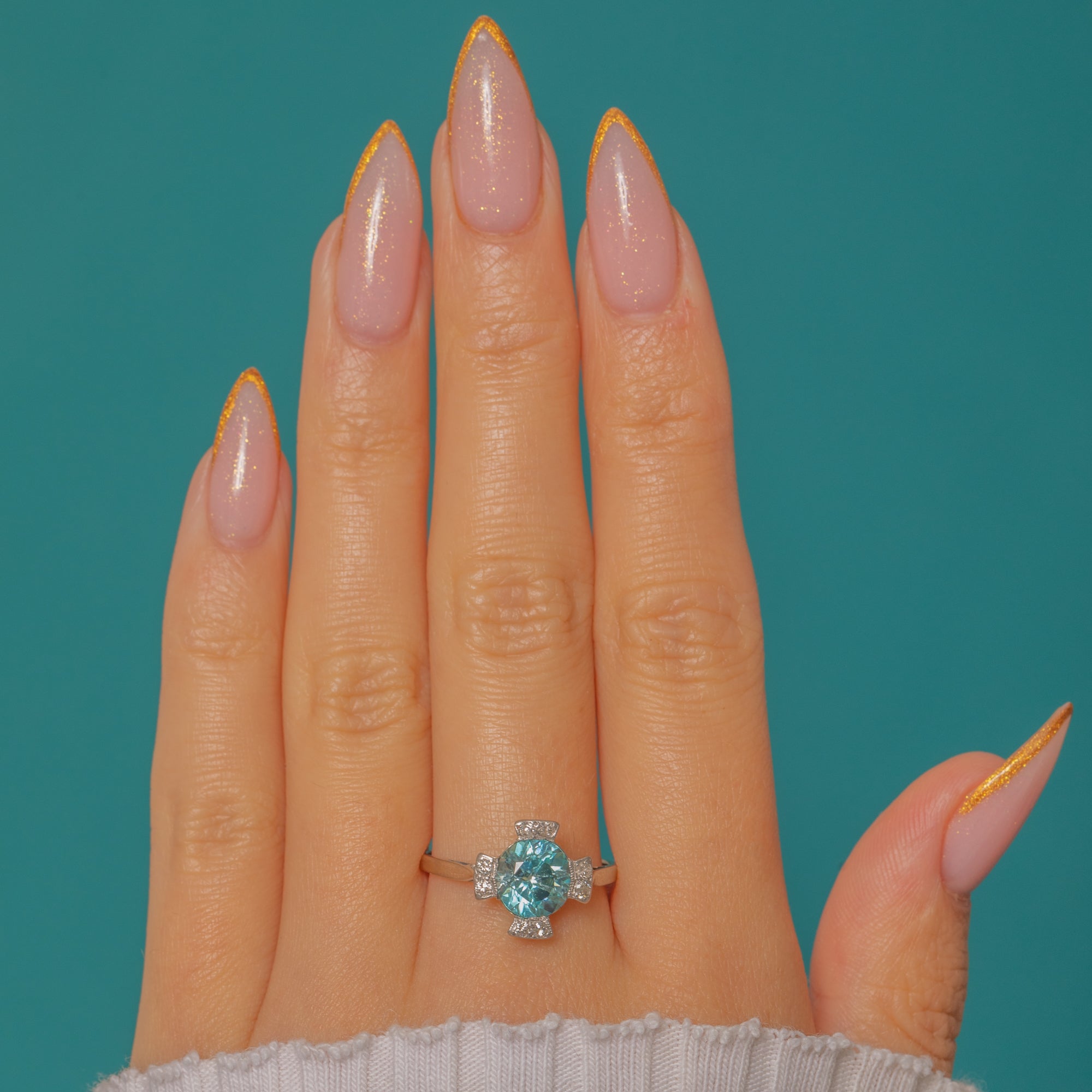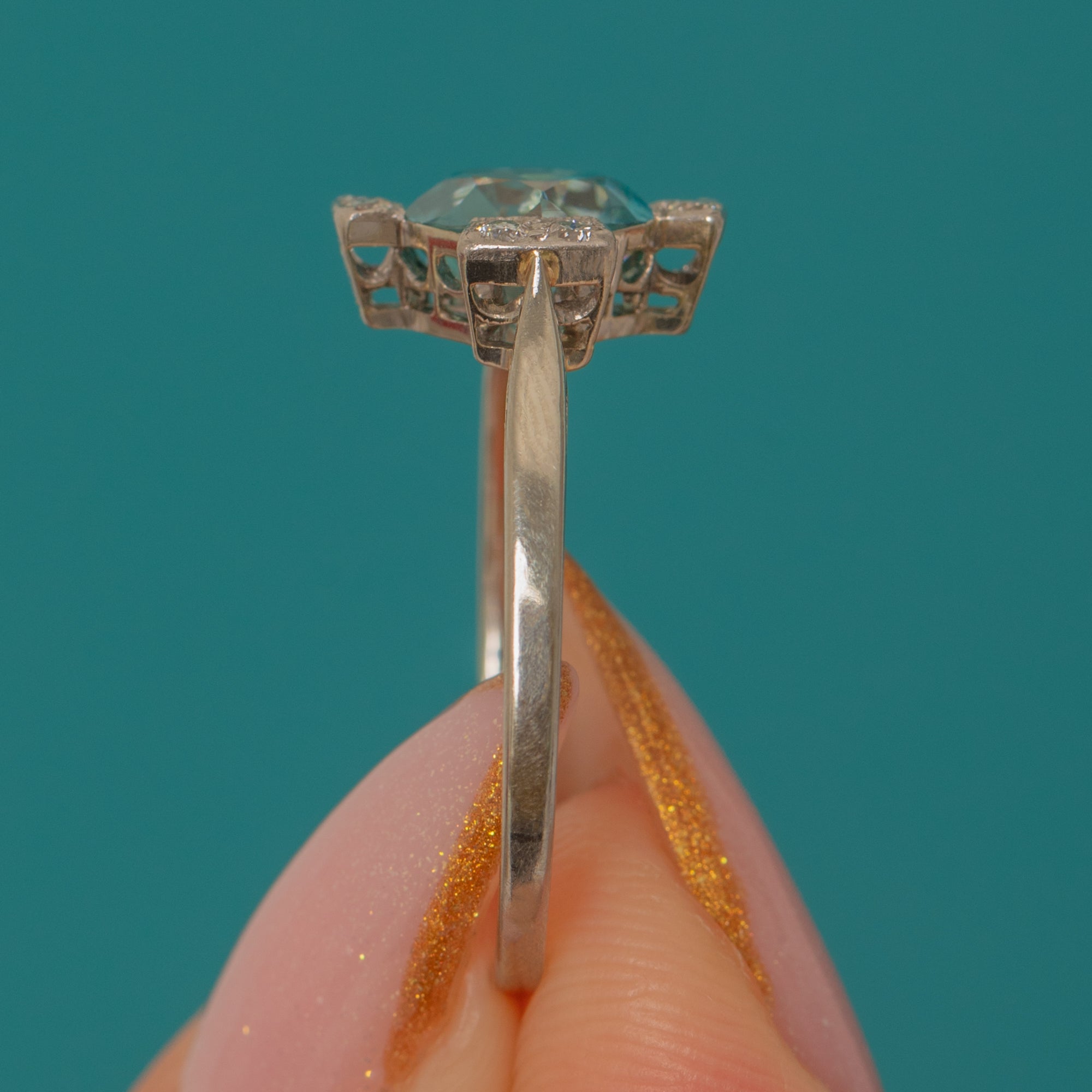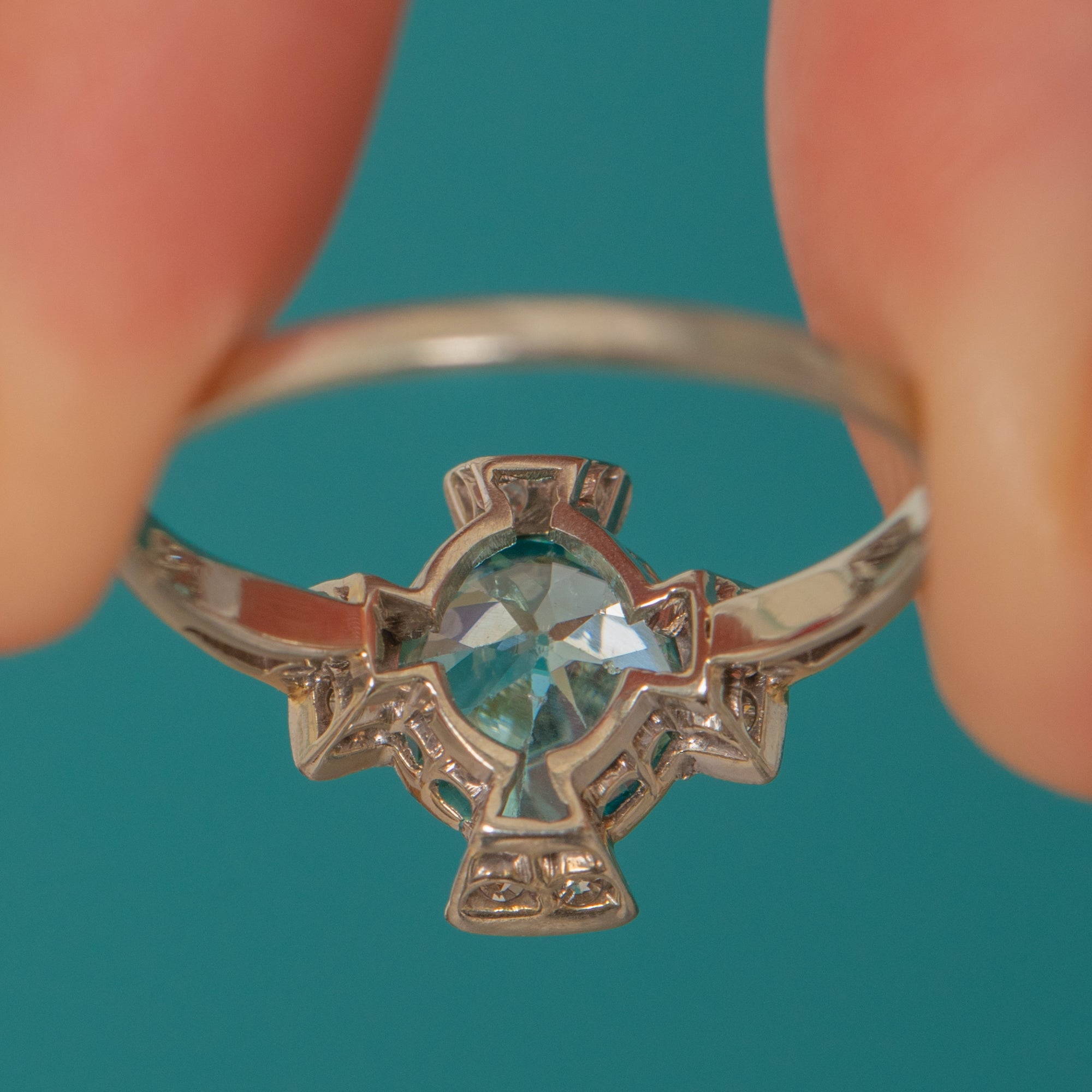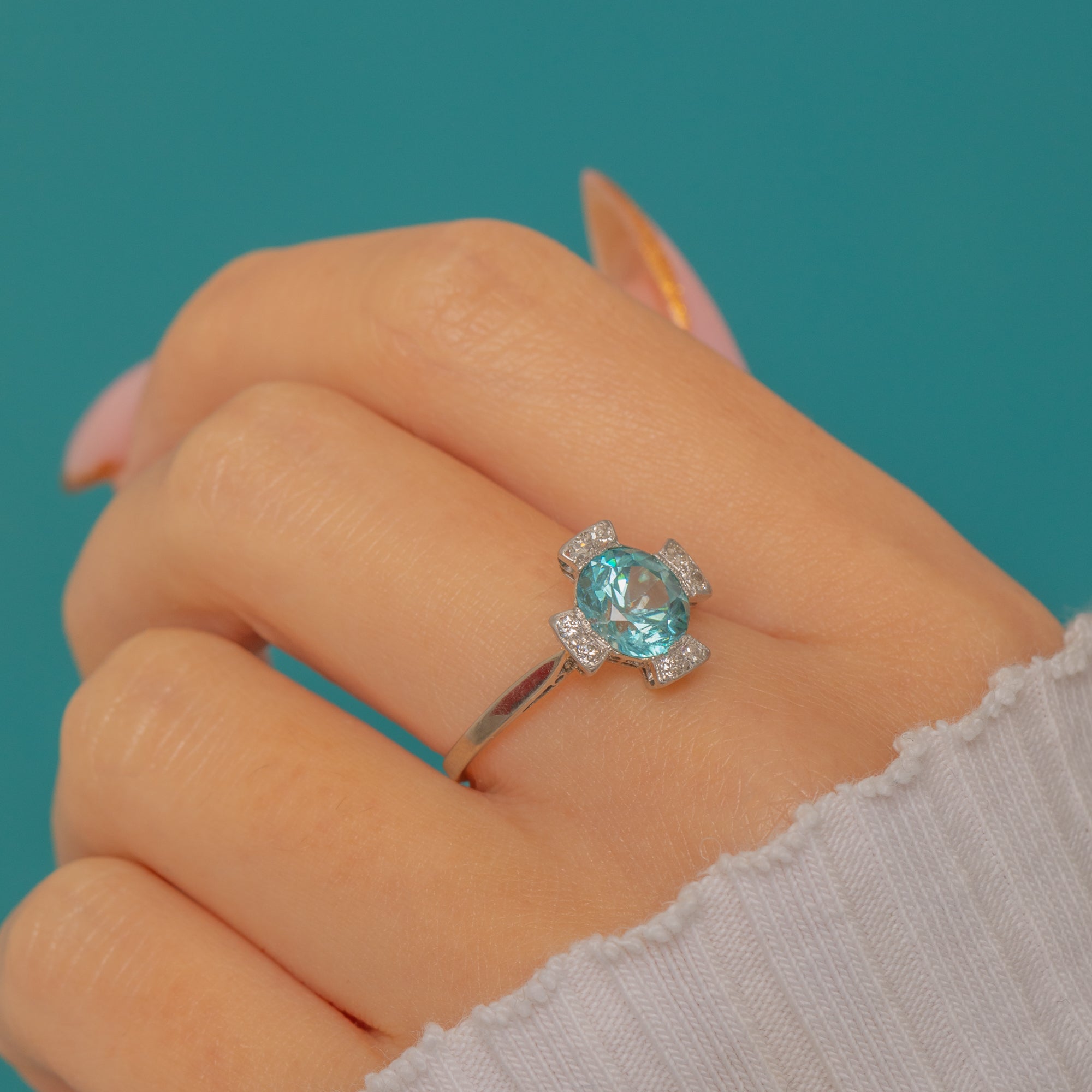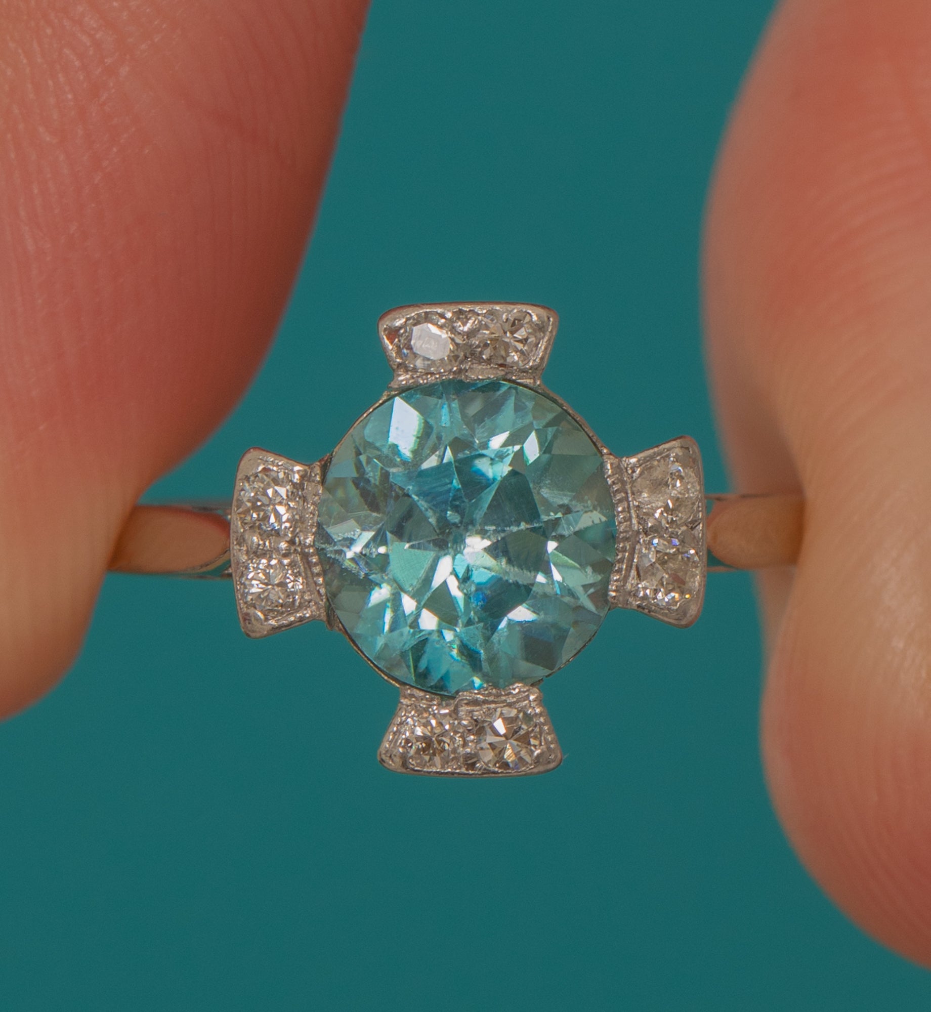 A breathtaking Art Deco ring combining timeless elegance with vivid sparkle. At its heart lies a bright 2.00ct sky-blue Zircon — prized for its natural brilliance and fire — framed by eight twinkling antique Diamonds in Platinum settings.