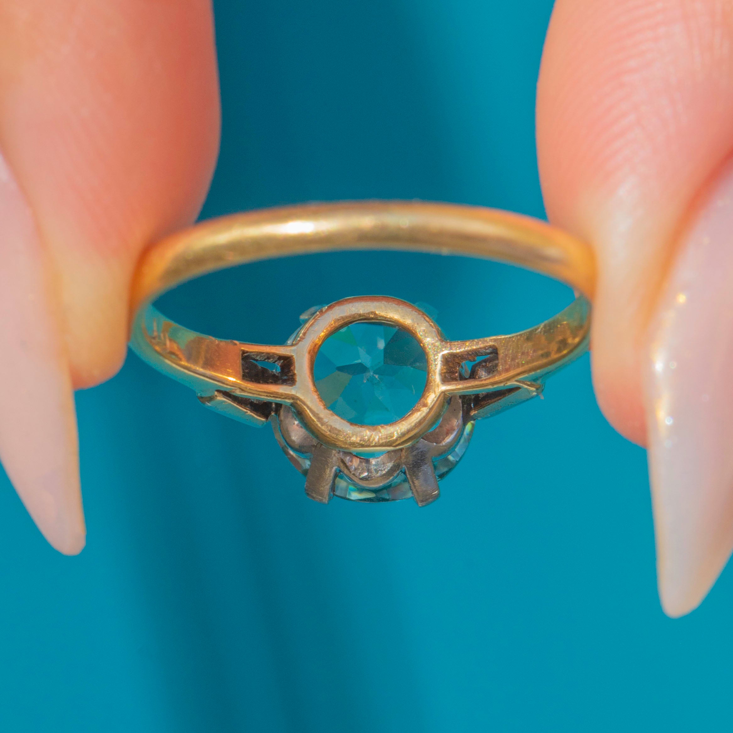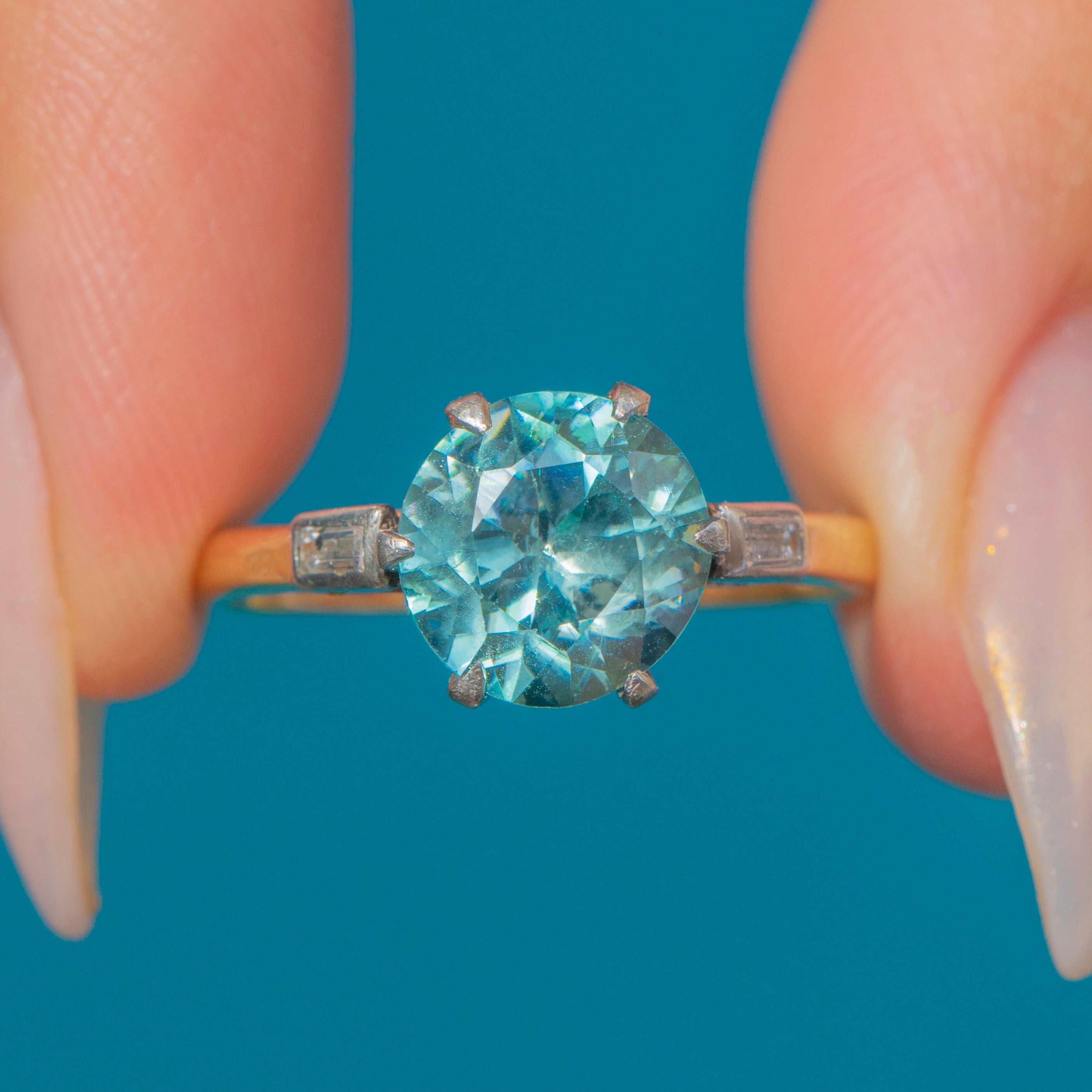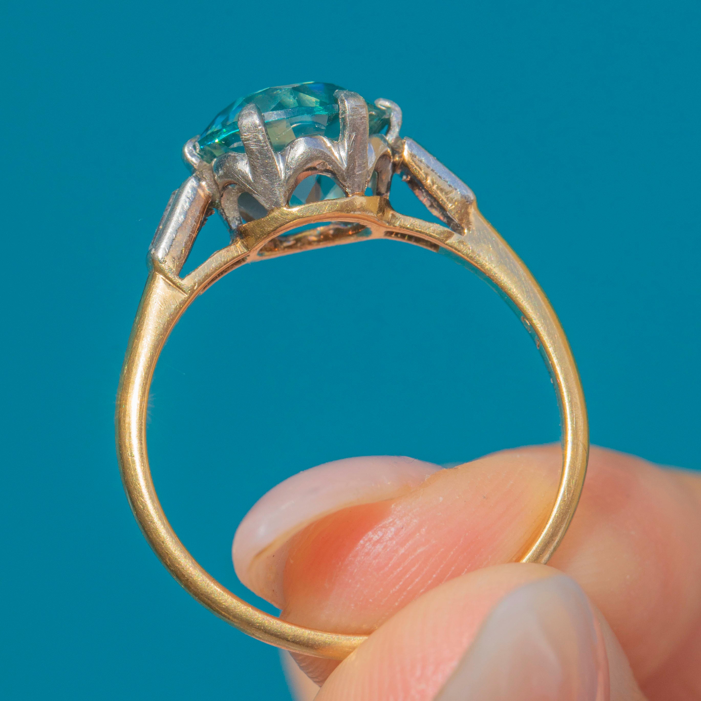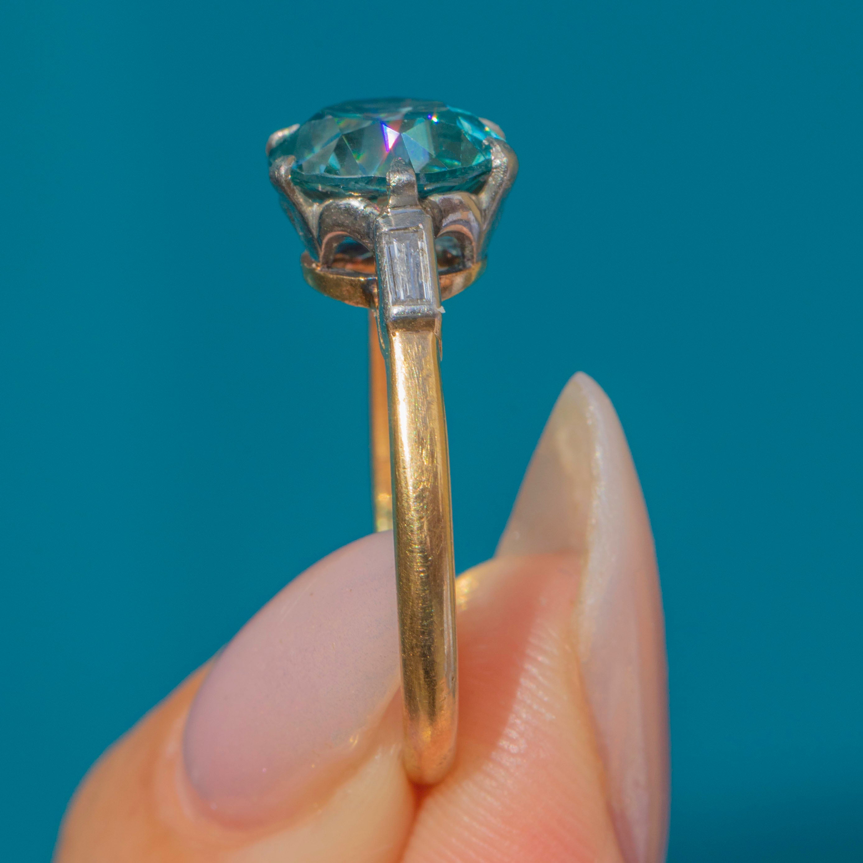 A dazzling Art Deco cocktail ring featuring a vivid blue Zircon of approx. 4.5cts, claw set in Platinum with baguette Diamond shoulders. The Zircon measures 9mm in diameter, with crisp facet edges and a lively brilliance that rivals a Diamond in sparkle. Its vibrant aqua-blue hue makes it a striking centrepiece, perfectly reflecting the bold glamour of the 1930s.