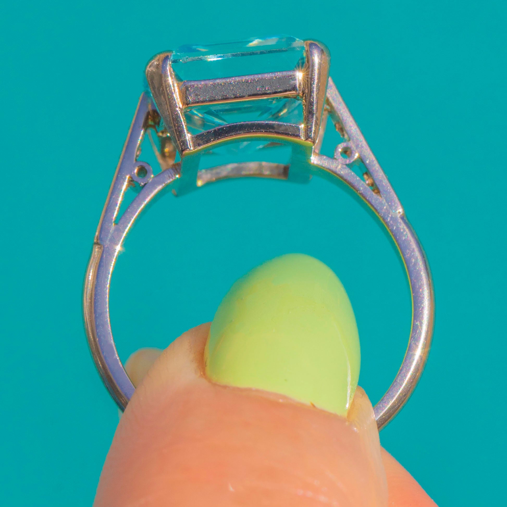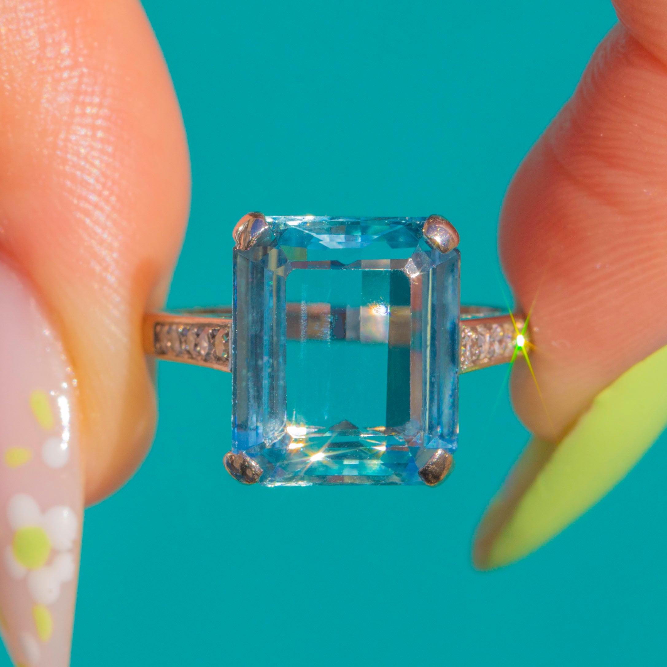 VERY GOOD-EXCELLENT: The Aquamarine is bright with crisp step facets; a minute corner abrasion is visible only on close inspection. The Diamonds are lively and securely set. Light surface wear to the shank and setting commensurate with age; claws and structure are sound with no obvious resizing.