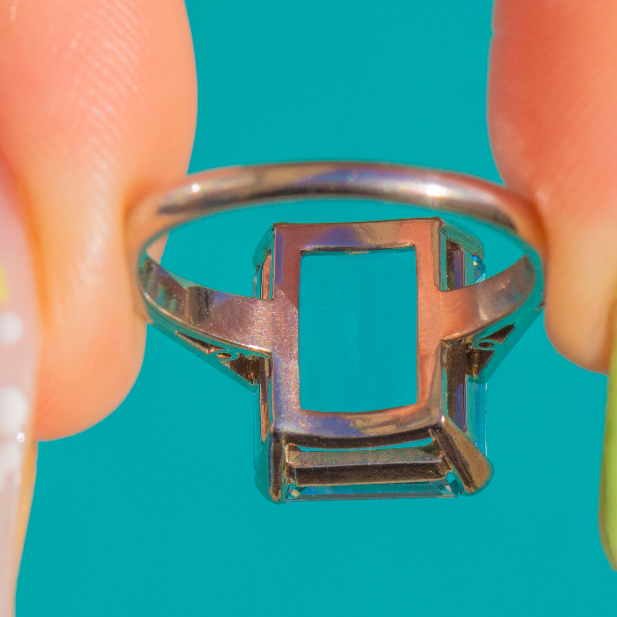 A breathtaking Vintage statement ring showcasing a luminous 8.00ct emerald-cut Aquamarine in sleek 18ct White Gold. The crisp four-corner setting and streamlined shoulders give this piece its elegant, architectural poise, while the Aquamarine’s cool sea-blue hue sits front and centre with captivating clarity.