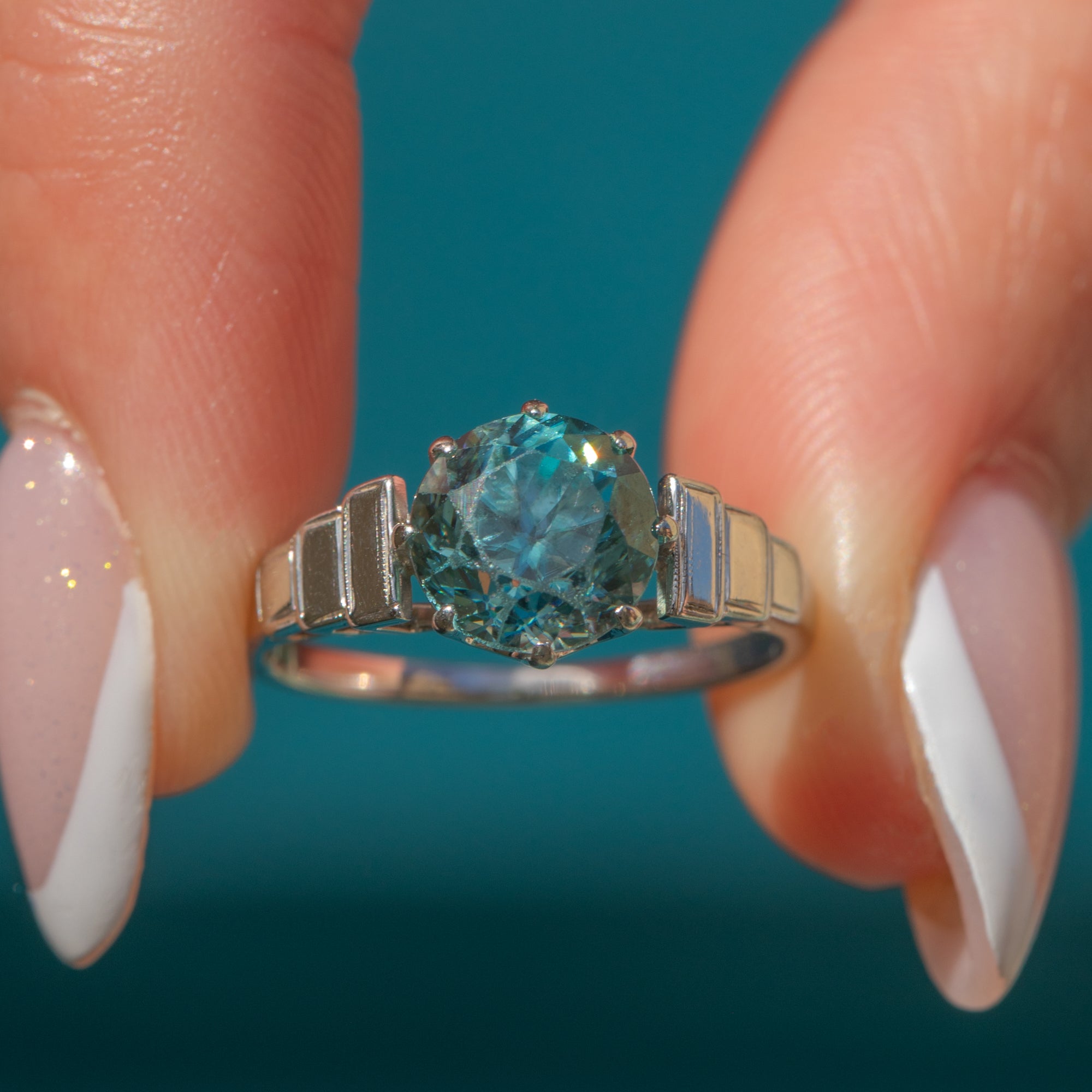 VERY GOOD: This Art Deco 18ct Gold Blue Zircon solitaire ring is tip-top condition. The Zircon is snug in its settings and the White Gold has a high-shine polish and luminescence! While there is evidence on the back of a previous resize, this does not affect the overall impact of the piece.