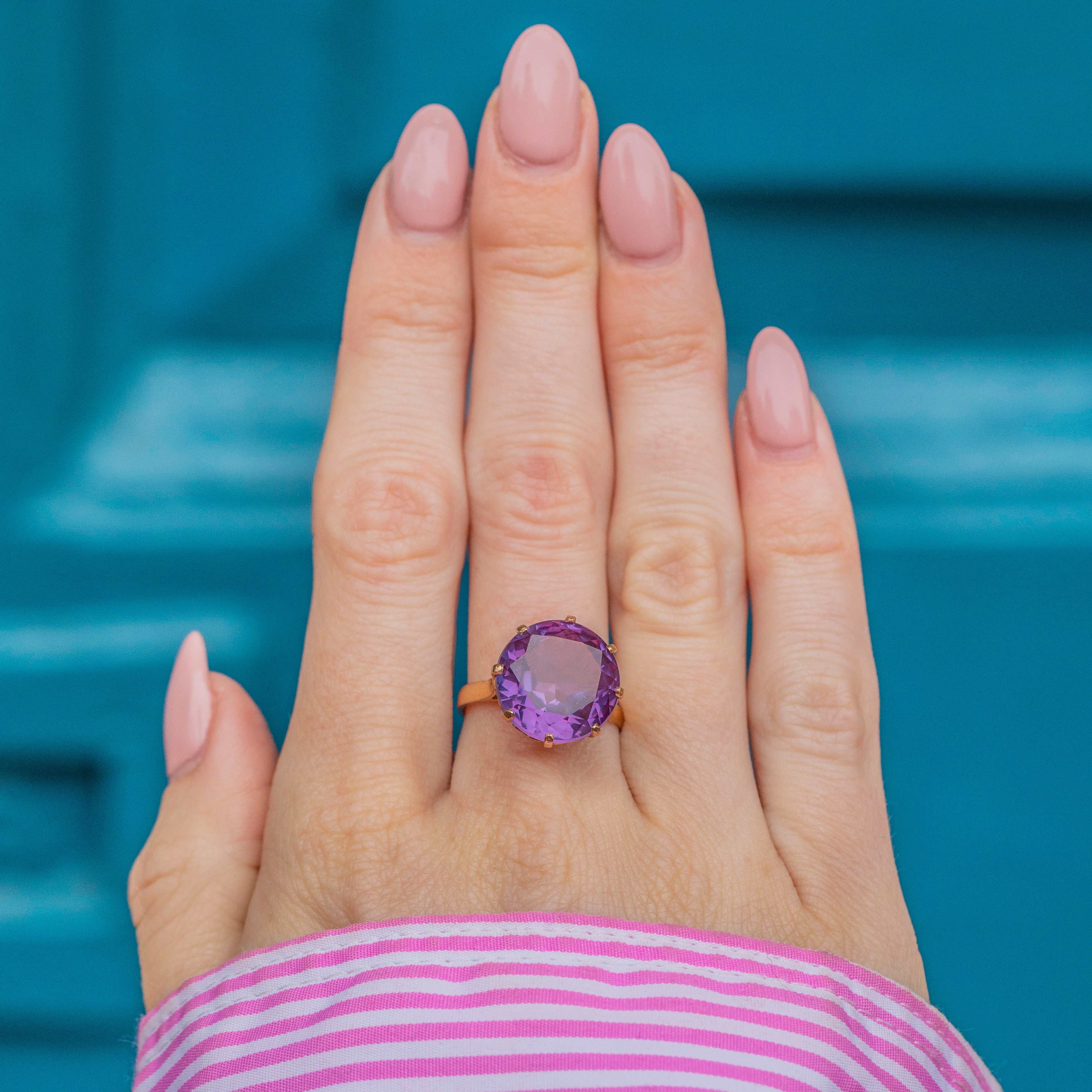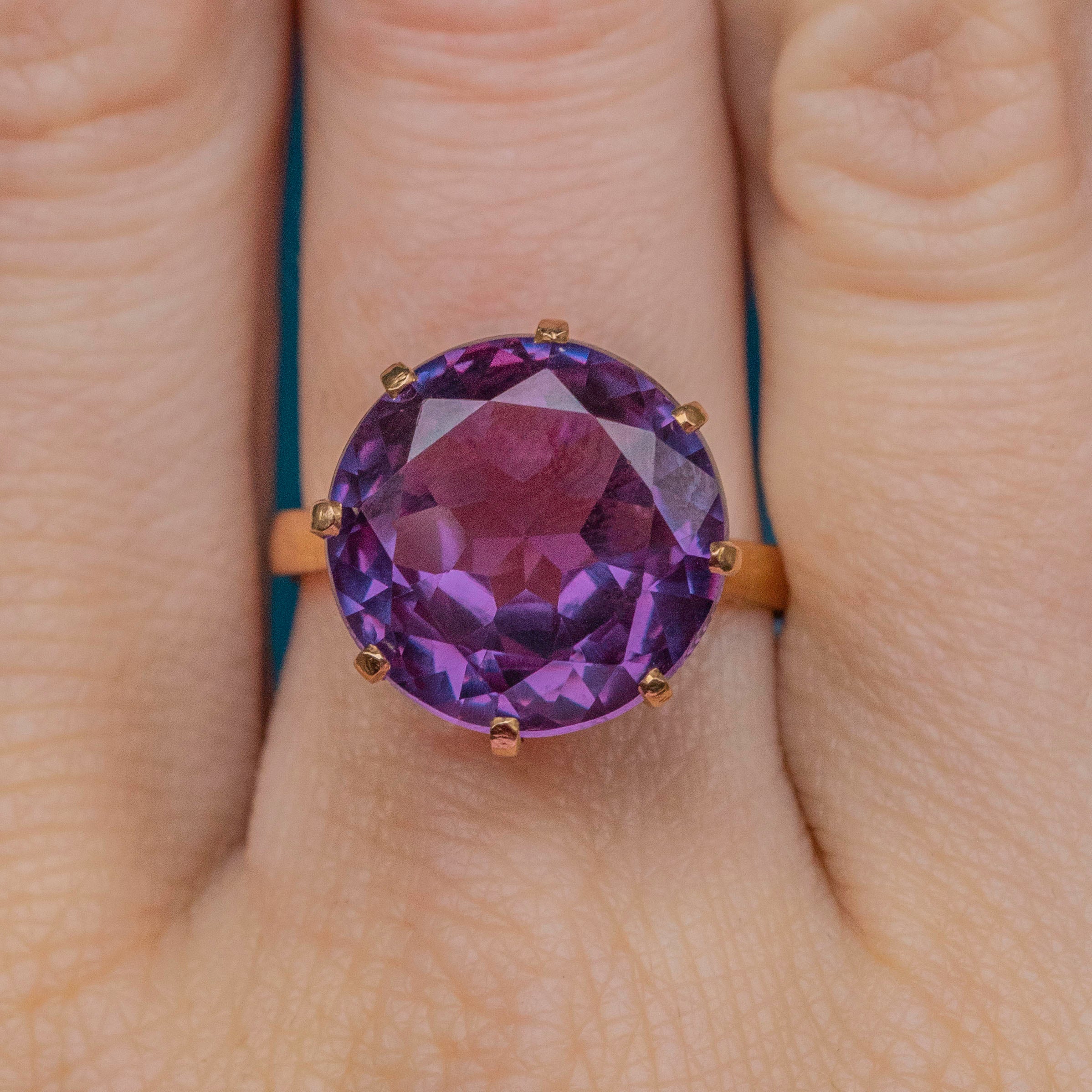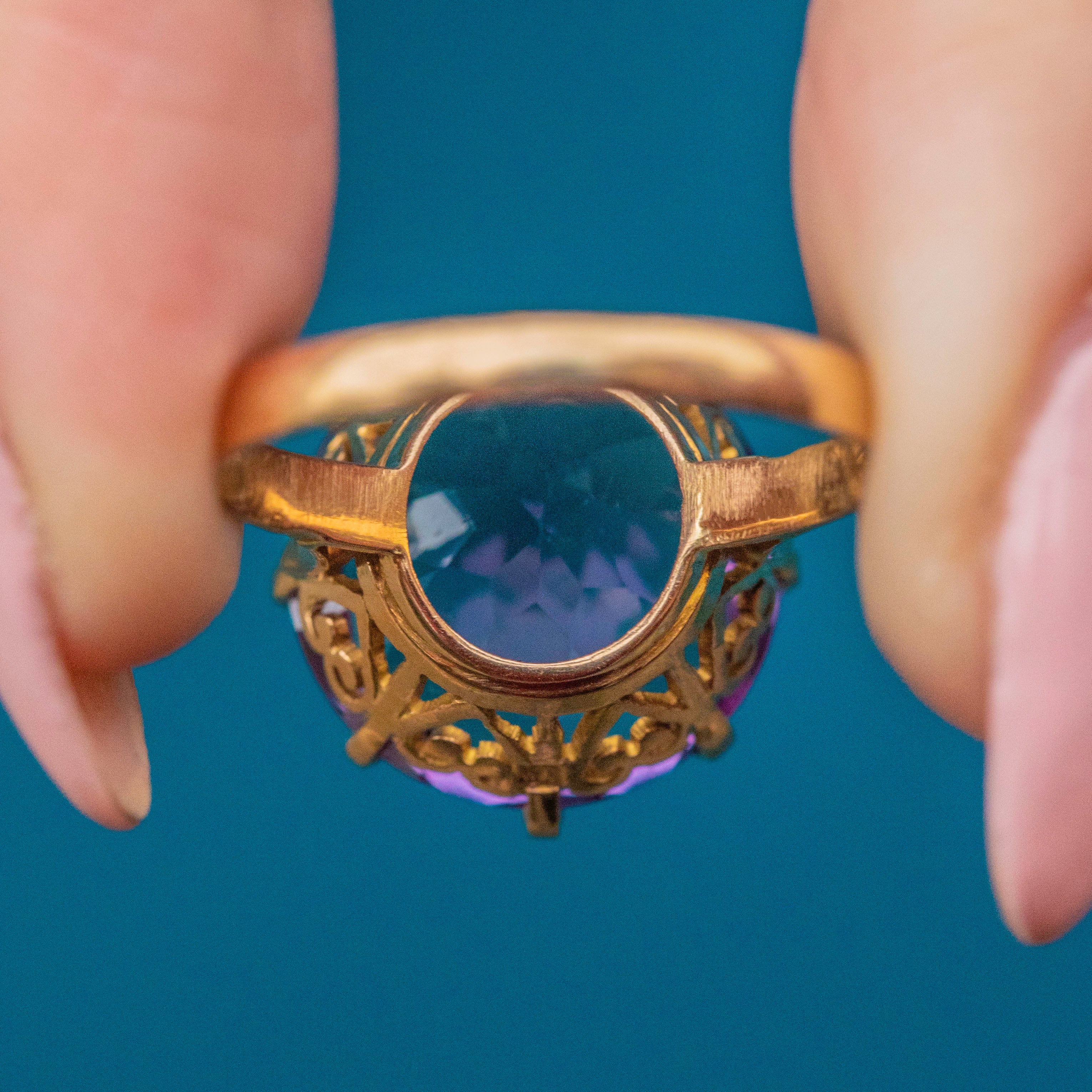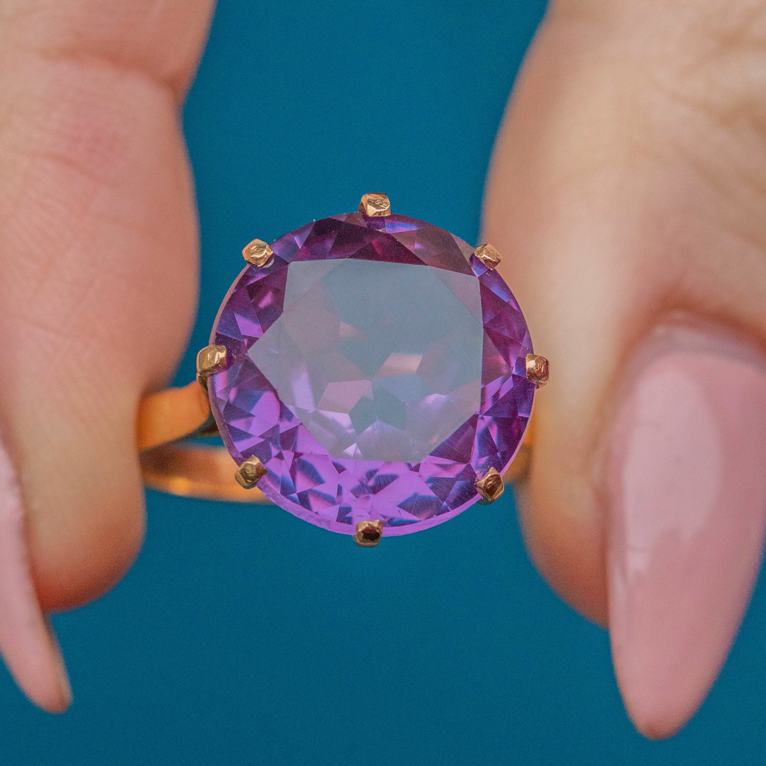 EXCELLENT. This Art Deco 18ct Gold colour change Sapphire cocktail ring is in pristine condition. Her Sapphire is immaculate, displaying a beautiful purple glow through her facets under the light with no visible scuffs or chips. Her 18ct Gold band has a gorgeously rich tone and is free from resize marks. All in all, she's a tantalising treat!