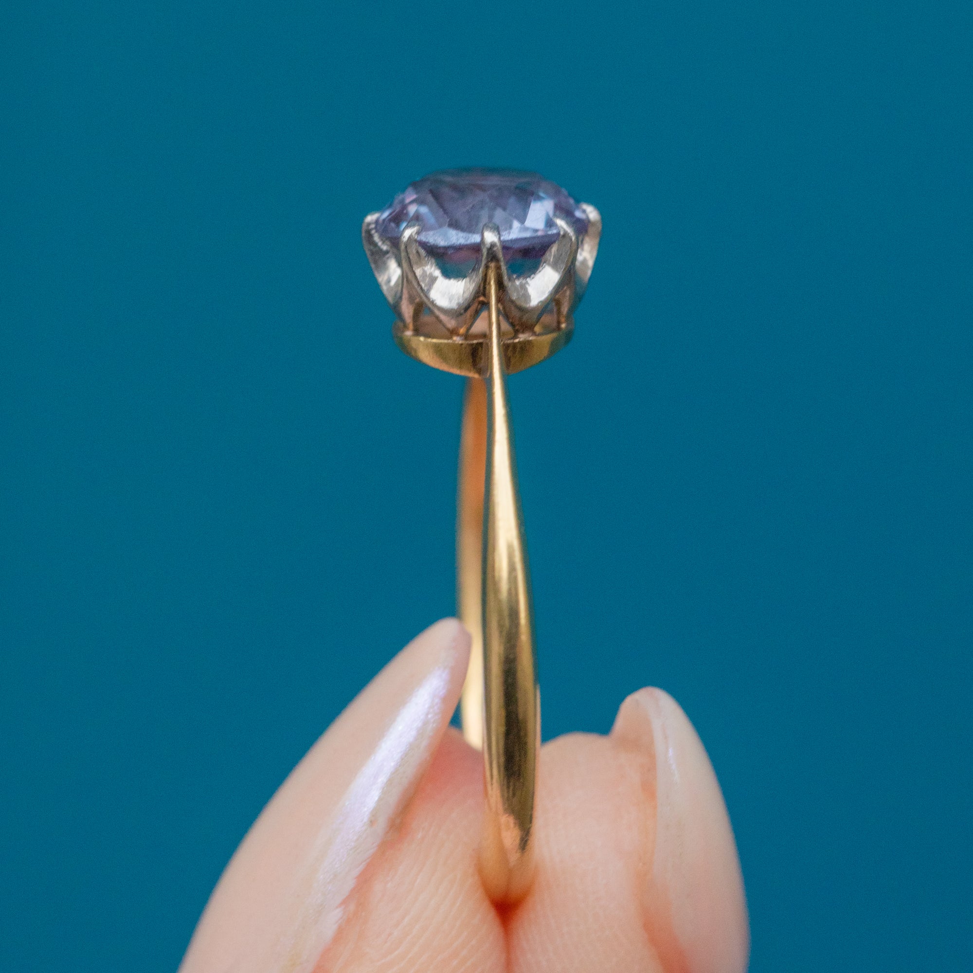 EXCELLENT. This Art Deco 18ct Gold colour change Sapphire solitaire ring is in excellent condition. The Sapphire is securely set into Platinum and meets a buttery 18ct Gold band that will allow you to wear this piece comfortably and confidently.
