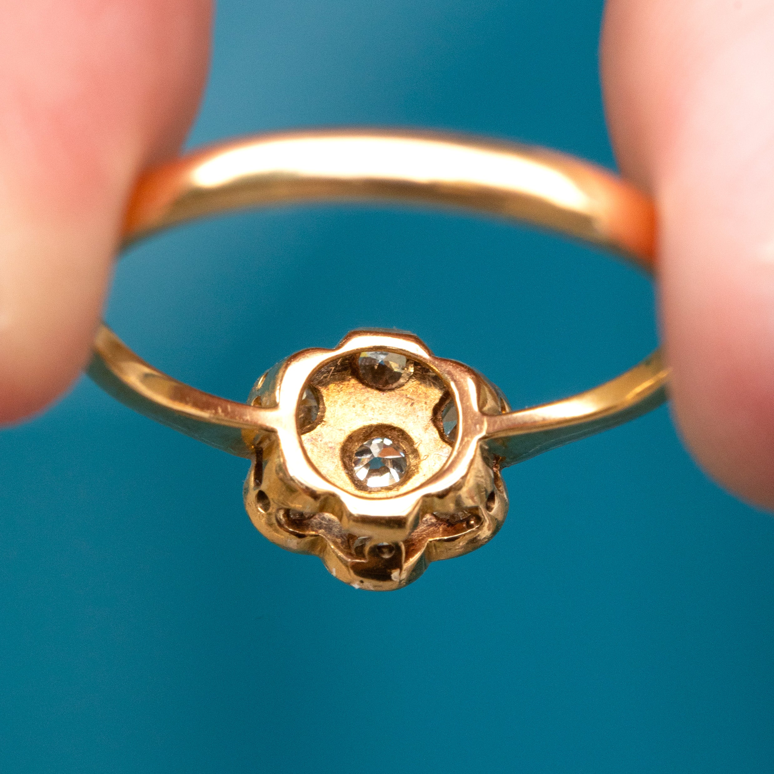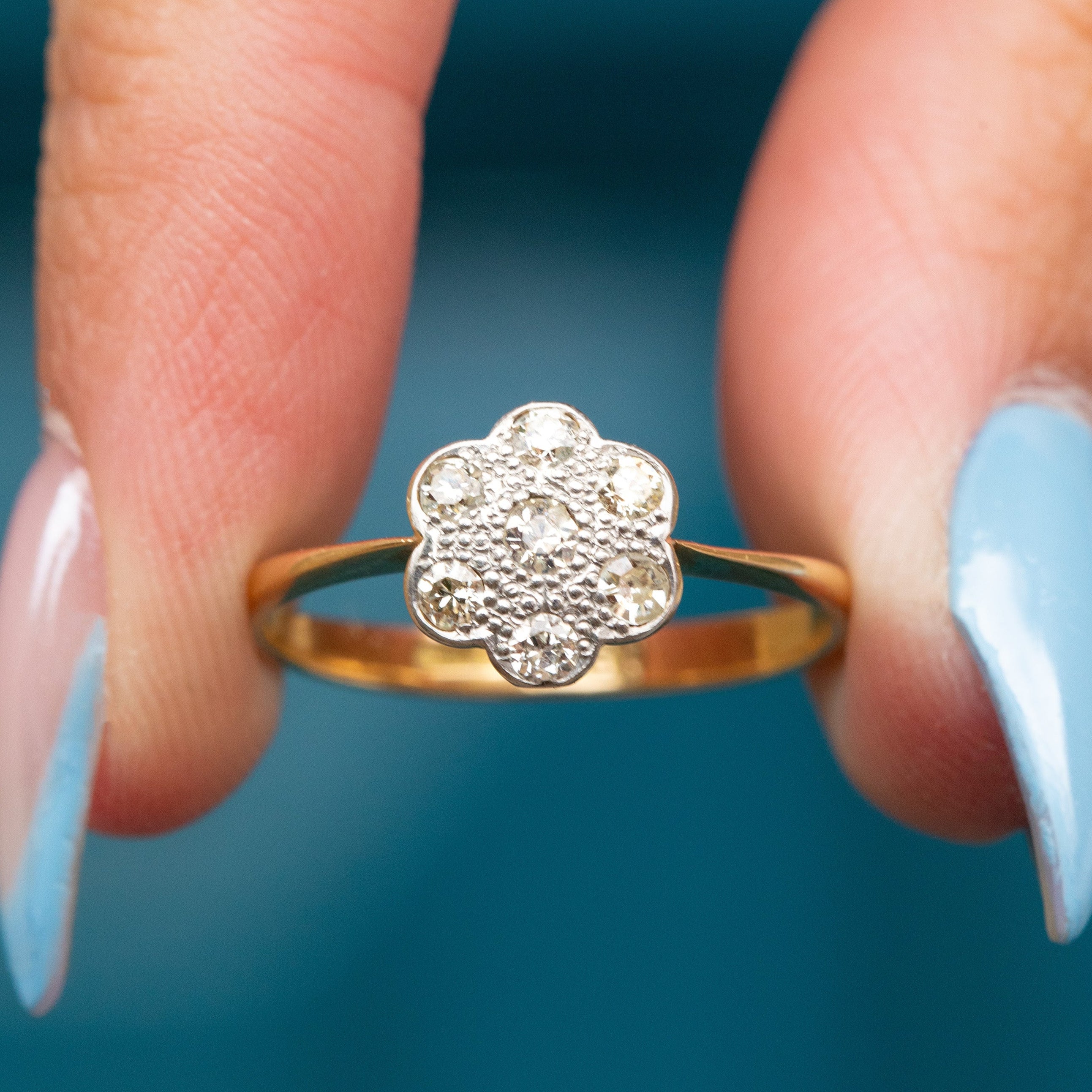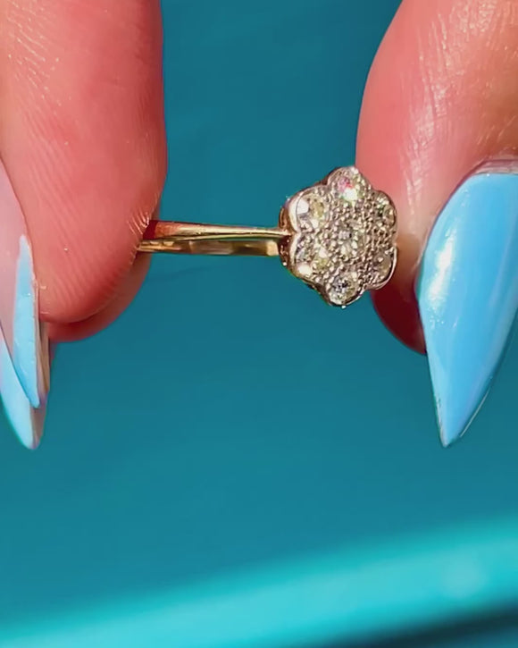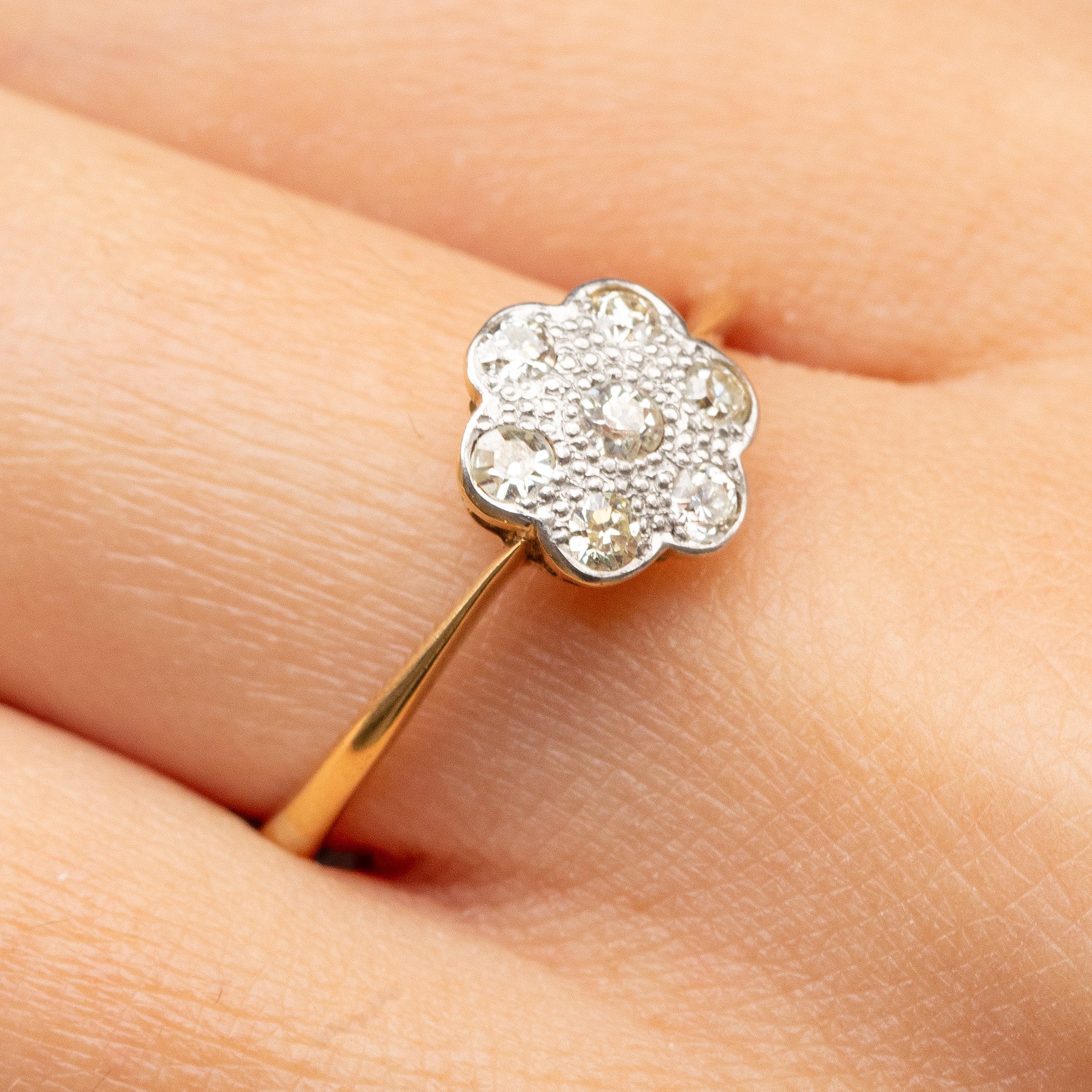EXCELLENT: Each Diamond is radiant and secure within its Platinum settings, and the 18ct Gold band is free from any notable signs of wear. Smooth and glossy, this daisy ring can be worn with confidence and comfort.