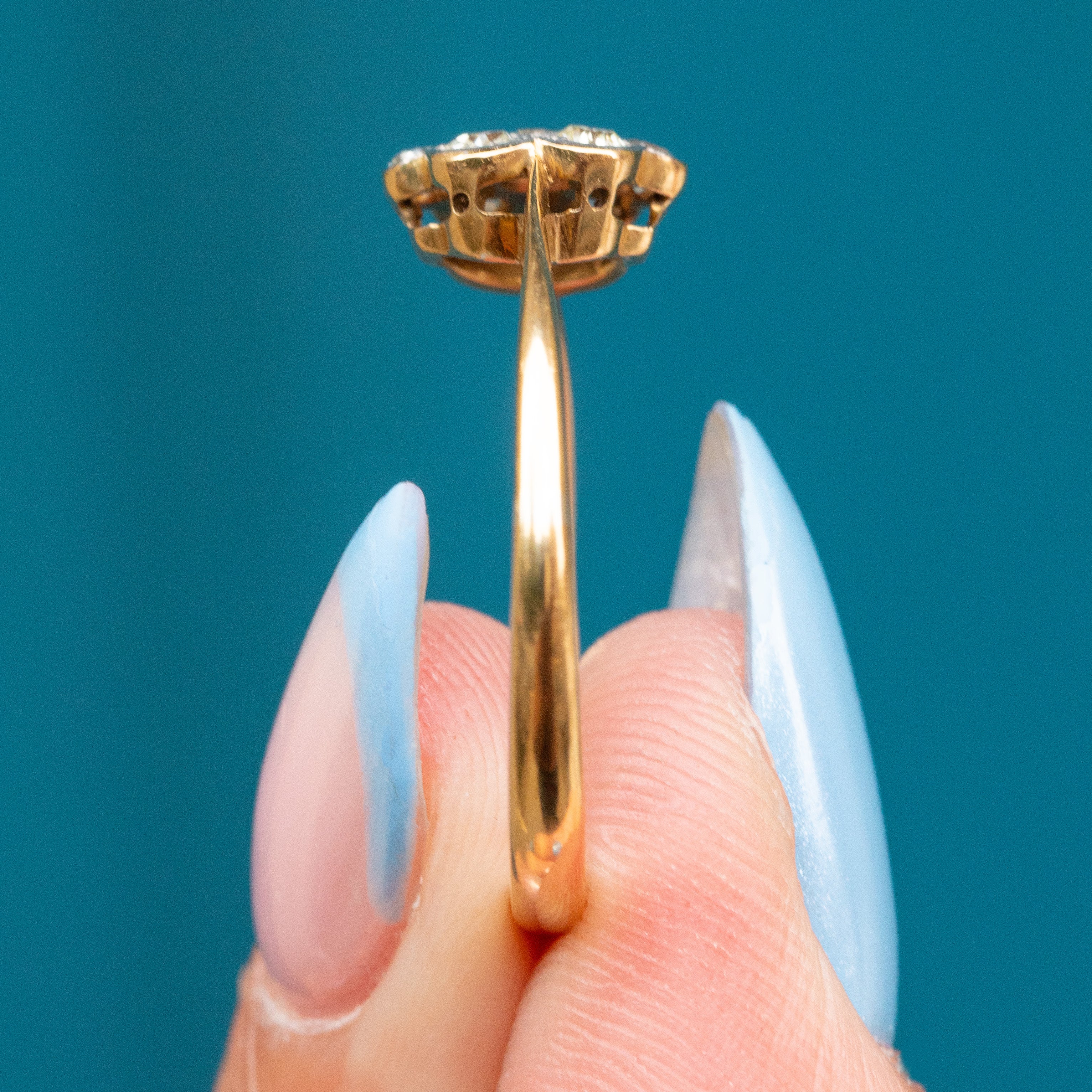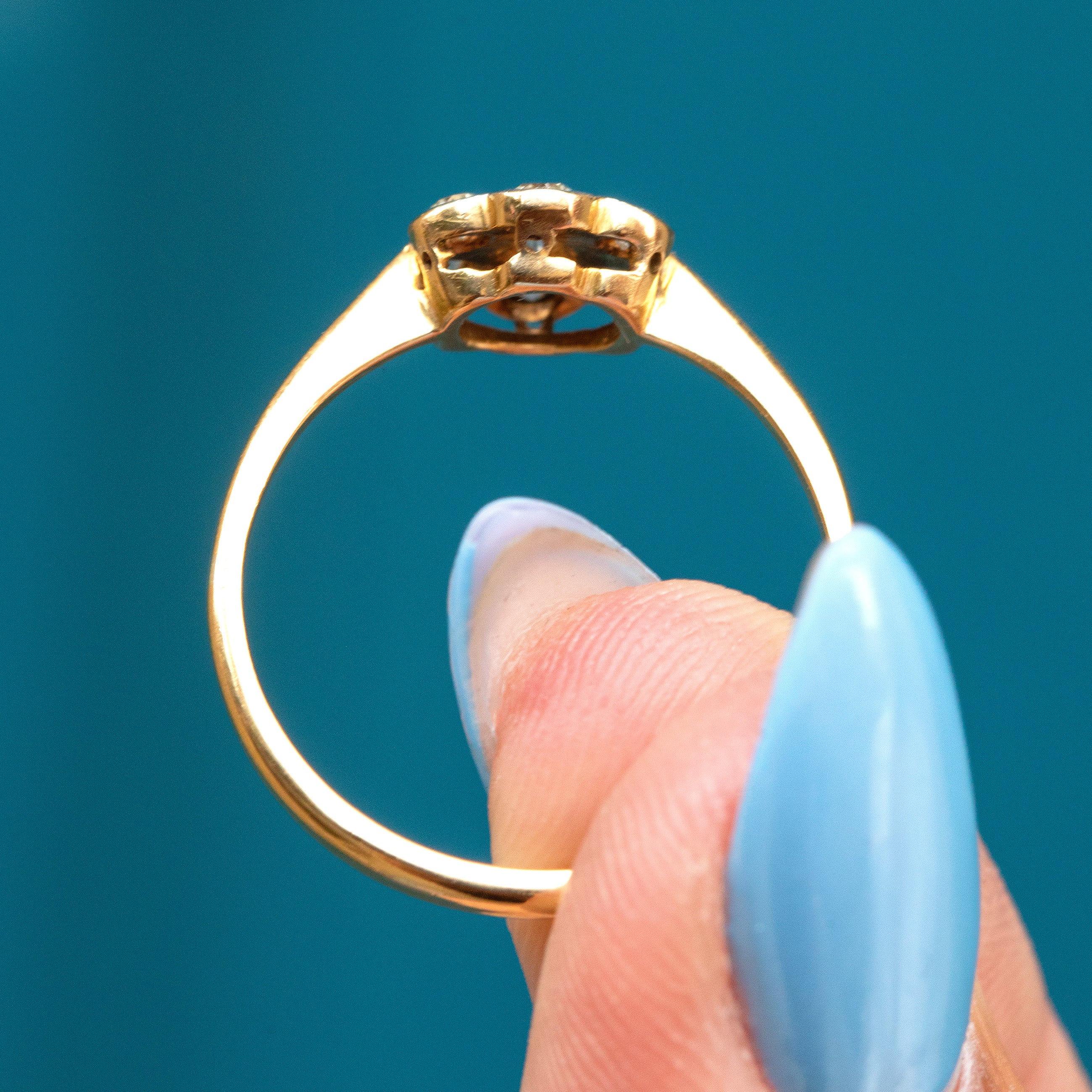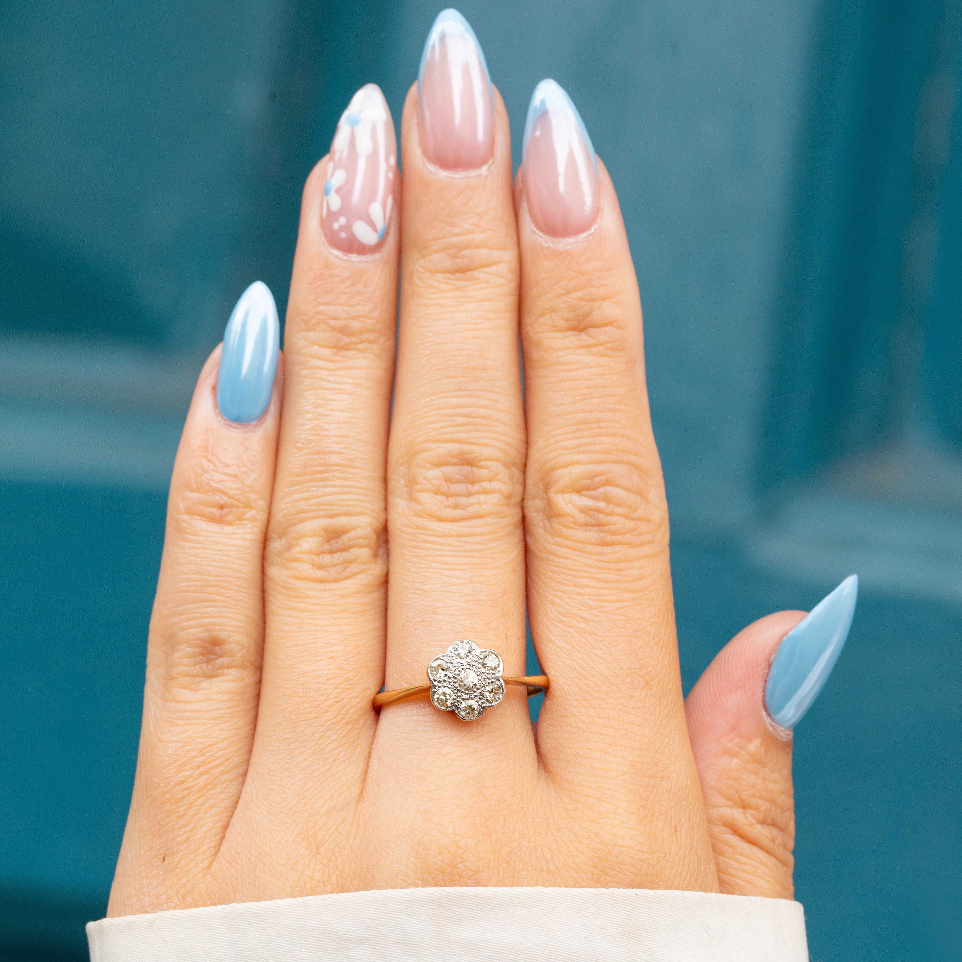 EXCELLENT: Each Diamond is radiant and secure within its Platinum settings, and the 18ct Gold band is free from any notable signs of wear. Smooth and glossy, this daisy ring can be worn with confidence and comfort.