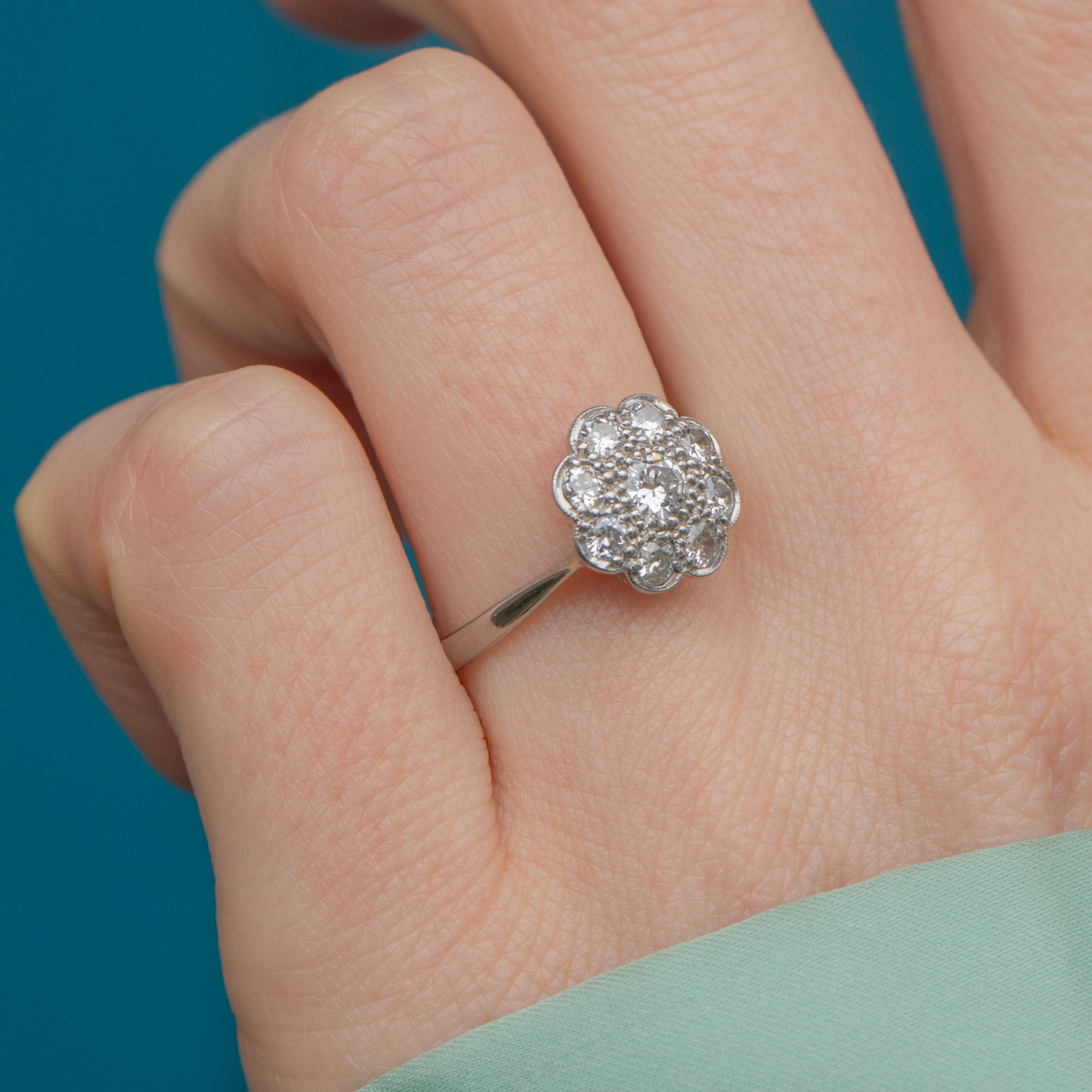 A gorgeous Art Deco 18ct Gold Diamond daisy cluster ring! This Art Deco delight has been crafted from solid 18ct White Gold and showcases a feminine daisy cluster of Diamonds set in Platinum.