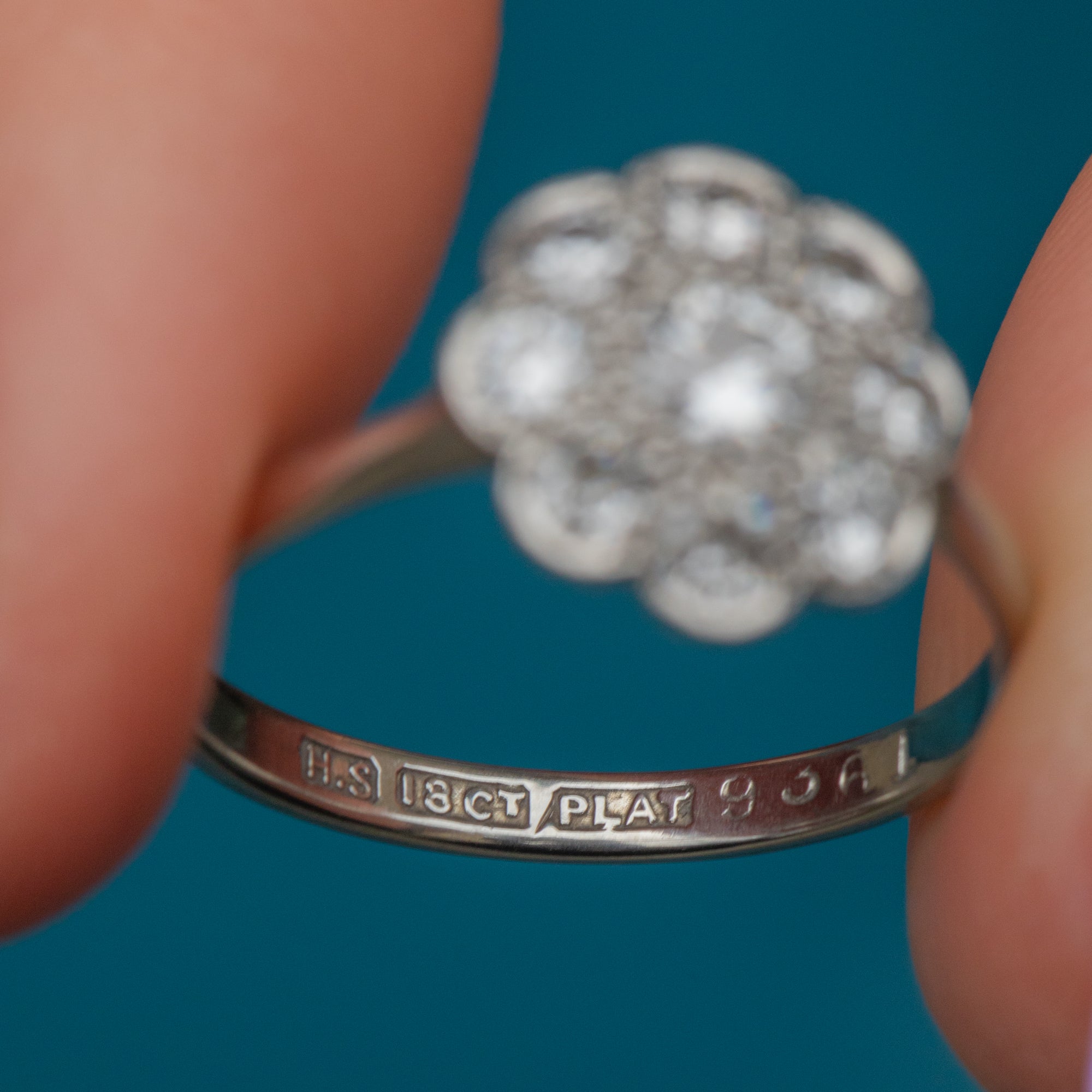 EXCELLENT. This Art Deco 18ct Gold Diamond daisy cluster ring is in excellent condition. This piece has a beautiful daisy cluster of Diamonds, sparkling prettily, with no surface wear and the band is robust and comfortable to wear. This is a gorgeous piece for your collection.