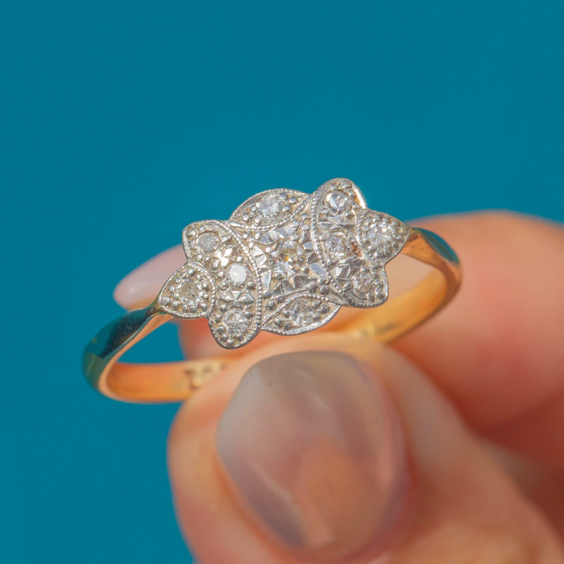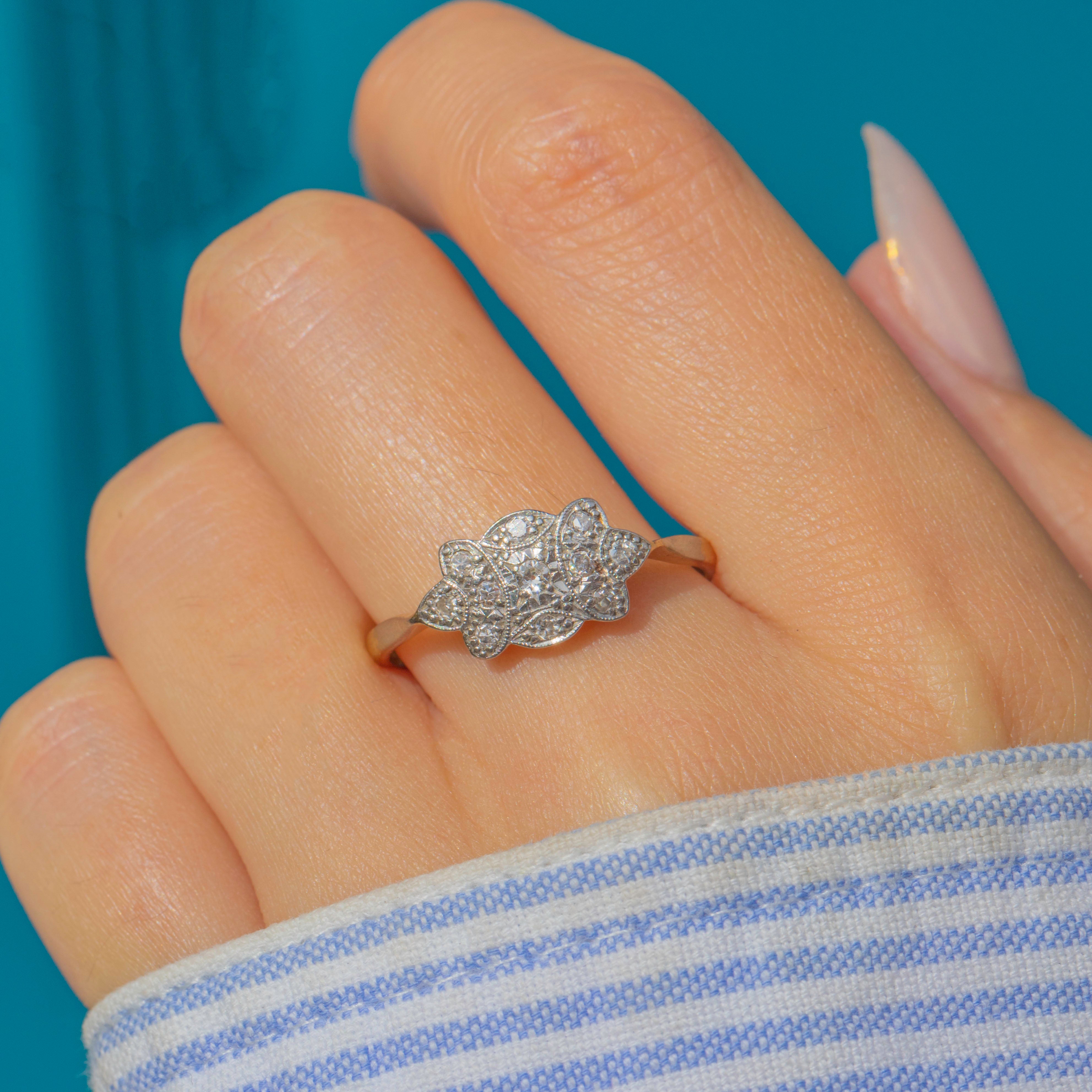 A classic Art Deco Diamond cluster ring in 18ct Gold and Platinum, c.1920. The cluster is designed in an elongated floral or starburst form, set with bright, well-matched natural Diamonds that shimmer beautifully in the light.