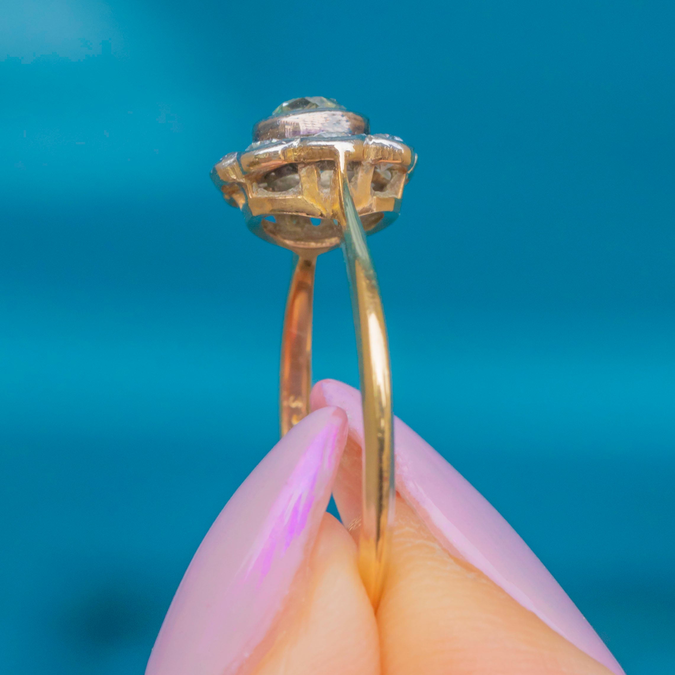 The centre Diamond weighs approximately 0.50ct and measures 5mm across, encircled by eight 3mm old-cut white Diamonds of around 0.07ct each, for a total of approximately 1.06ct combined weight. The cluster sits proudly atop an elegant knife-edge 18ct Gold band, a classic Art Deco design detail that enhances the brilliance of the Diamonds while keeping the ring light and refined on the hand.