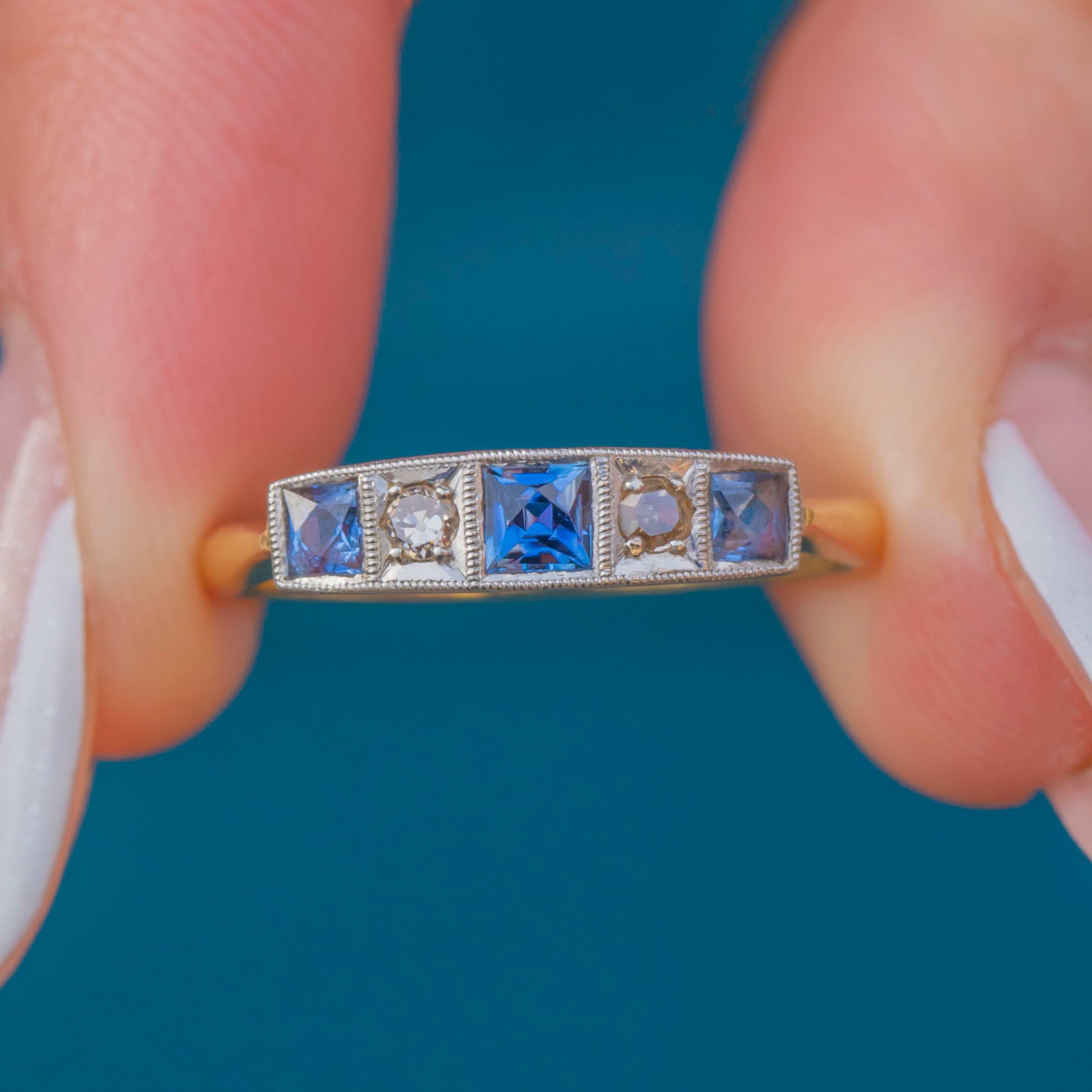 Art Deco 18ct Gold French Cut Sapphire Diamond Five Stone Ring