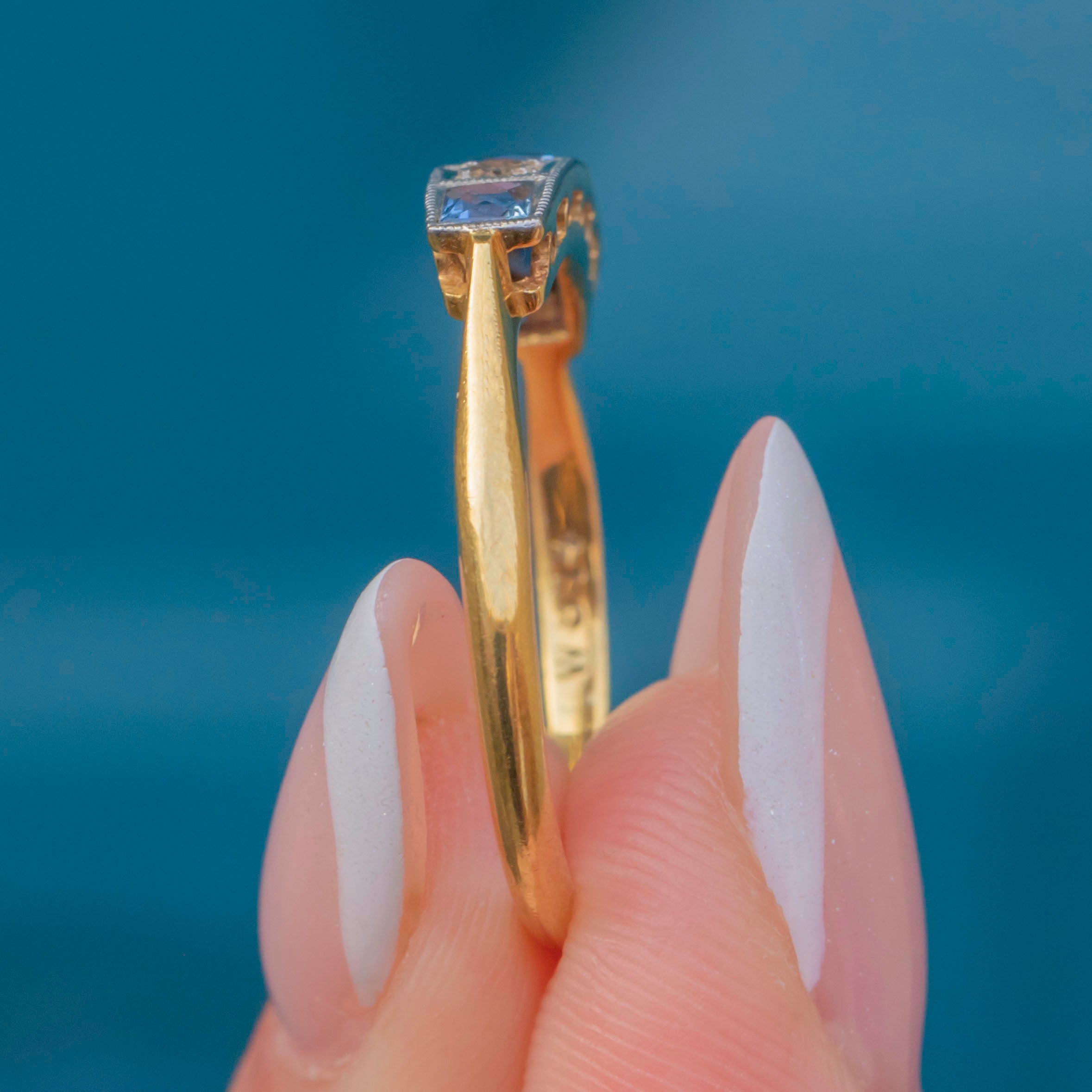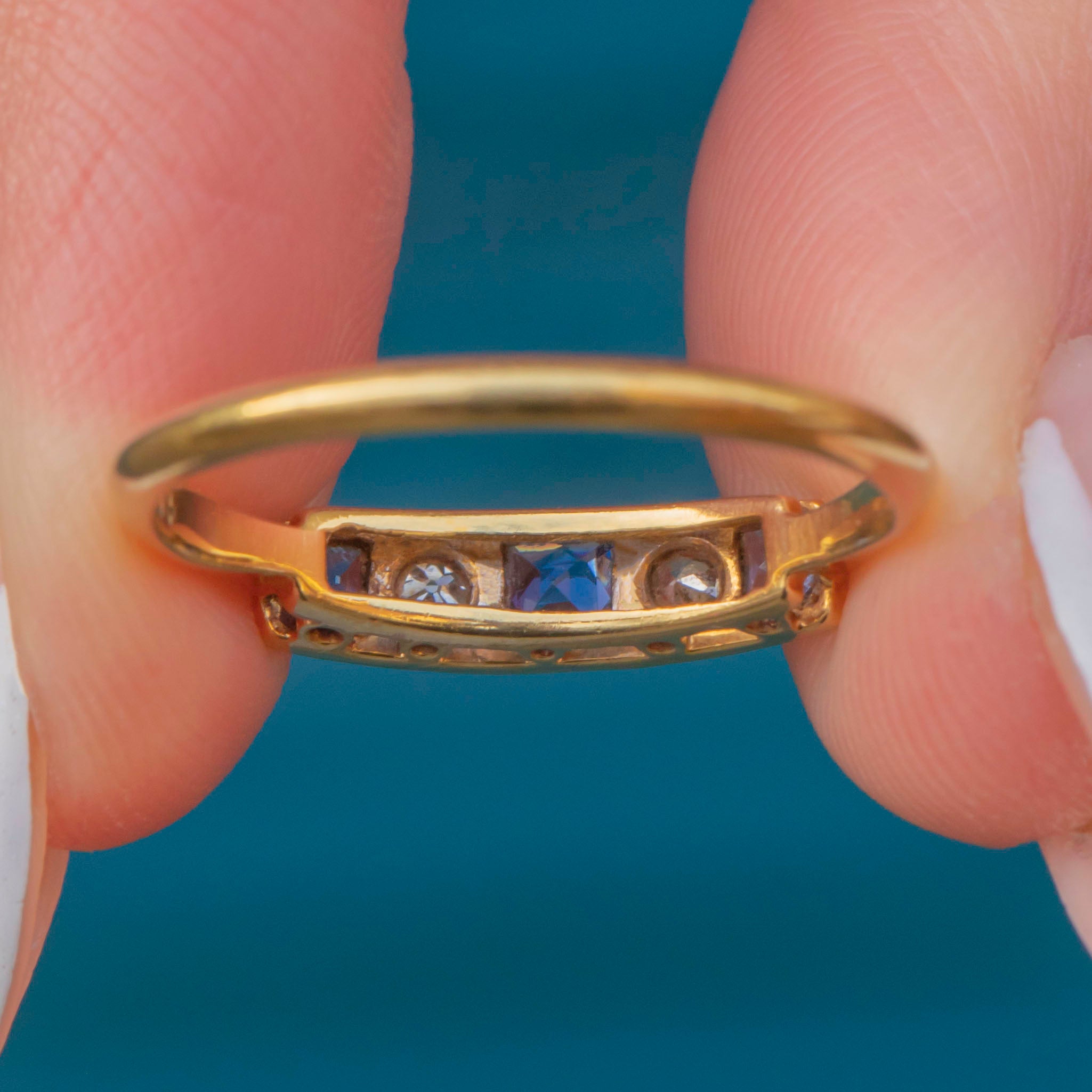 EXCELLENT: This Art Deco 18ct Gold Sapphire Diamond five stone ring is in excellent condition! The gemstones are radiant and set securely within their Platinum settings. With little signs of wear and a robust and smooth band, you can wear this antique ring with confidence!