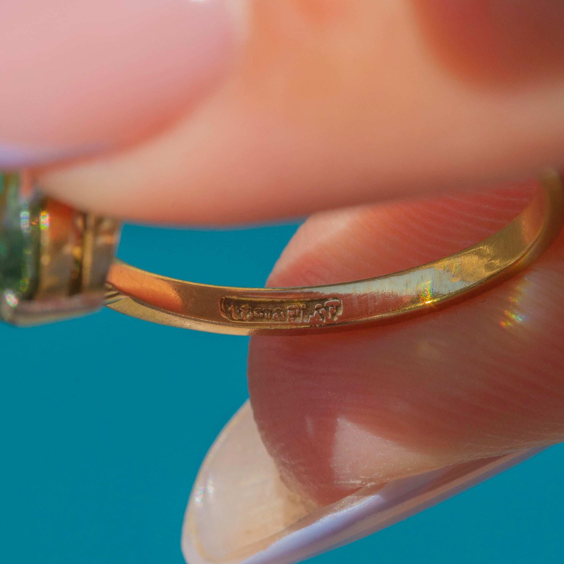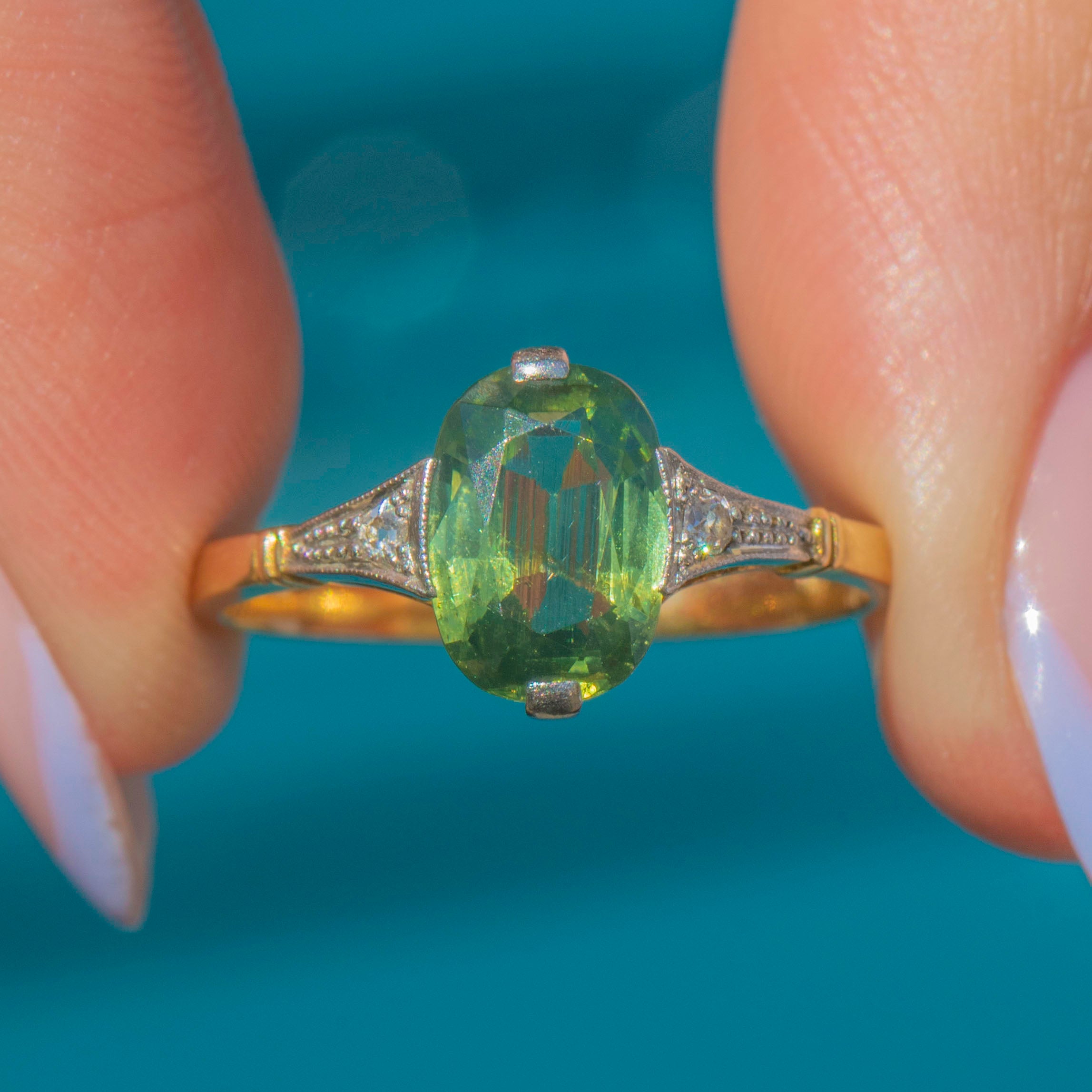 In her centre sits a radiant 1.30ct Garnet, gorgeously faceted to reveal her stunning sage green hues. She is flanked by two scintillating Diamonds, set within glossy Platinum settings in quintessential Art Deco style and effortlessly complemented by the warmth of her buttery 18ct Gold band.