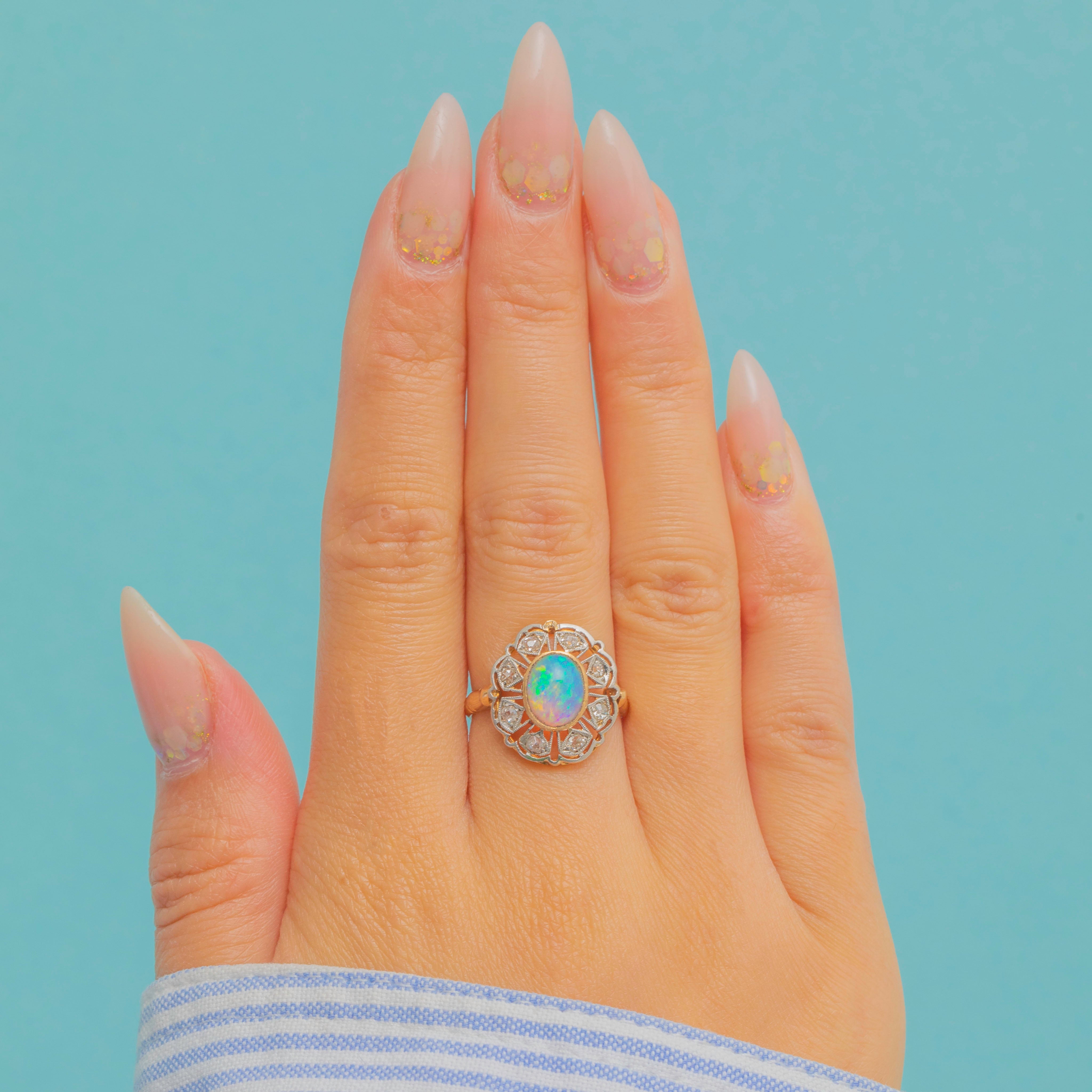 EXCELLENT: The Opal is bright, smooth, and securely set, with lively play-of-colour. The Diamonds are sparkling and free from chips, all firmly set in place. The Gold filigree gallery is crisp with only slight wear to the settings commensurate with age, leaving the ring strong and well-preserved.